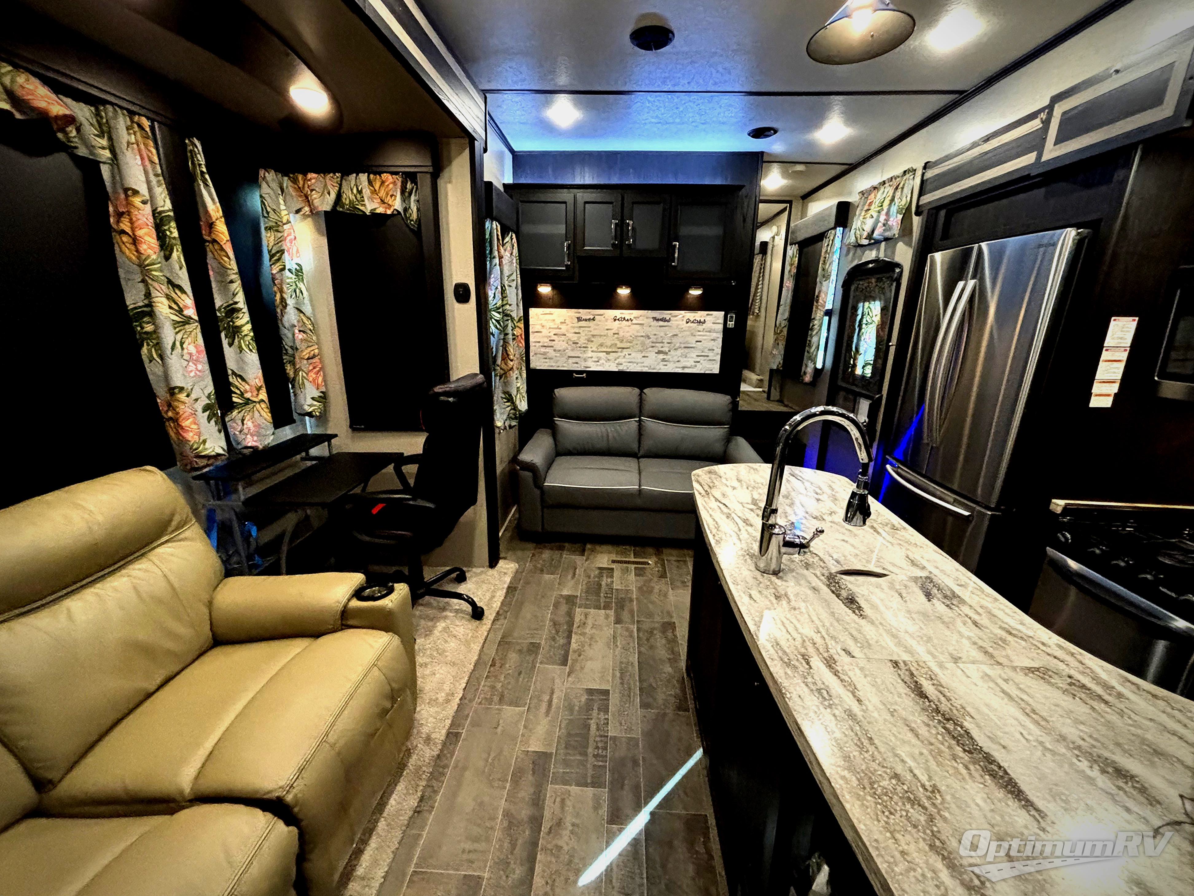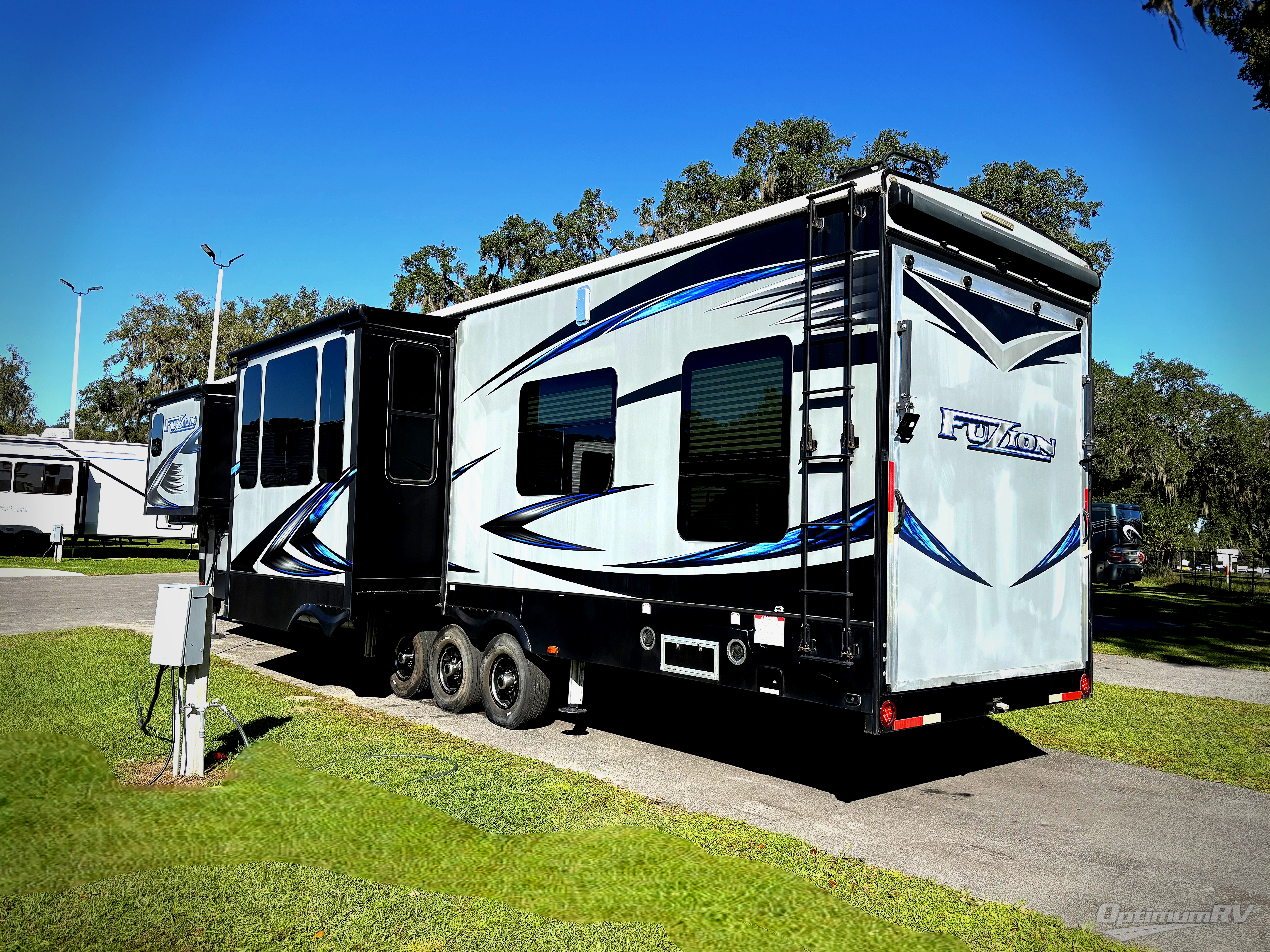 With this Fuzion toy hauler fifth wheel in tow you can be assured of a great time when you arrive at your destination. This model 423 features triple slides, one and a half baths, a loft, and a 12'6" garage for your favorite ride on toys!