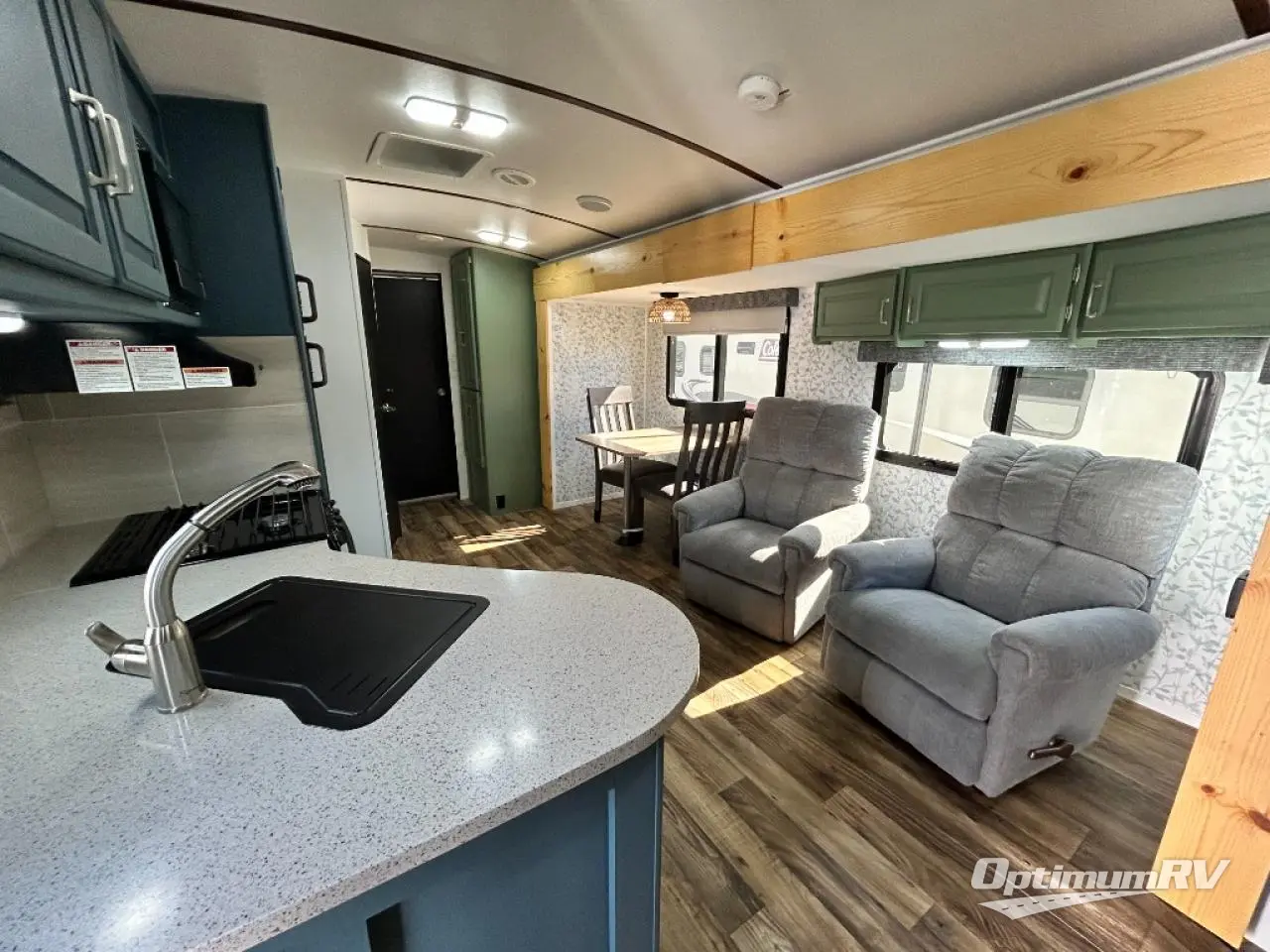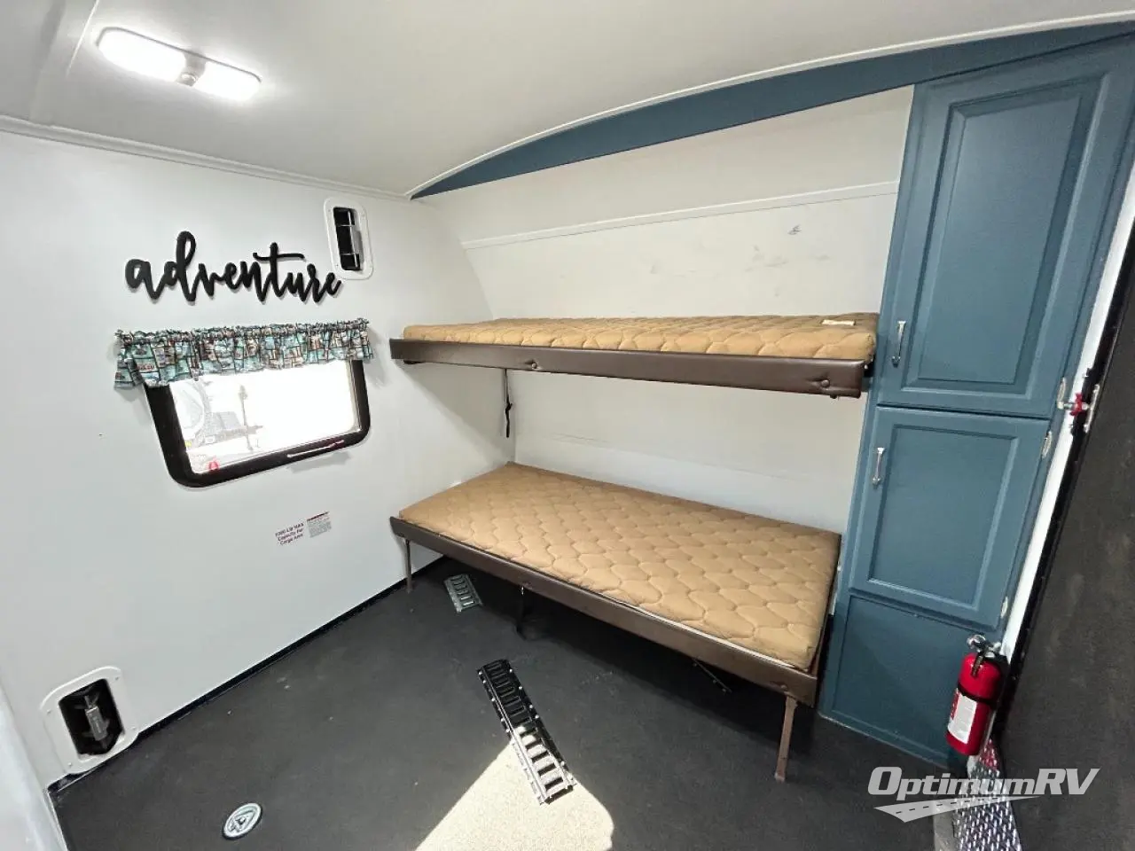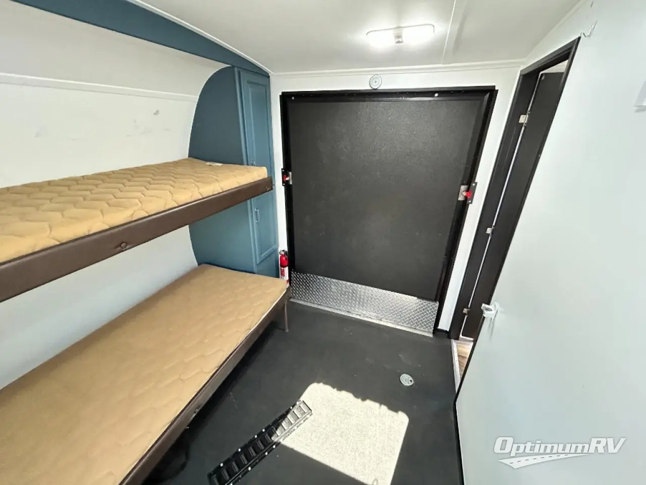 Model 324CG offers double slides, bunk beds in the front cargo room with a side ramp door, dual entry doors, a king size bed, and an outdoor camp kitchen for the chef in the family to enjoy!