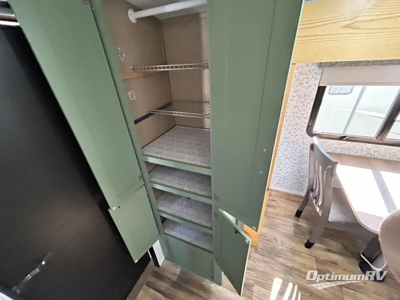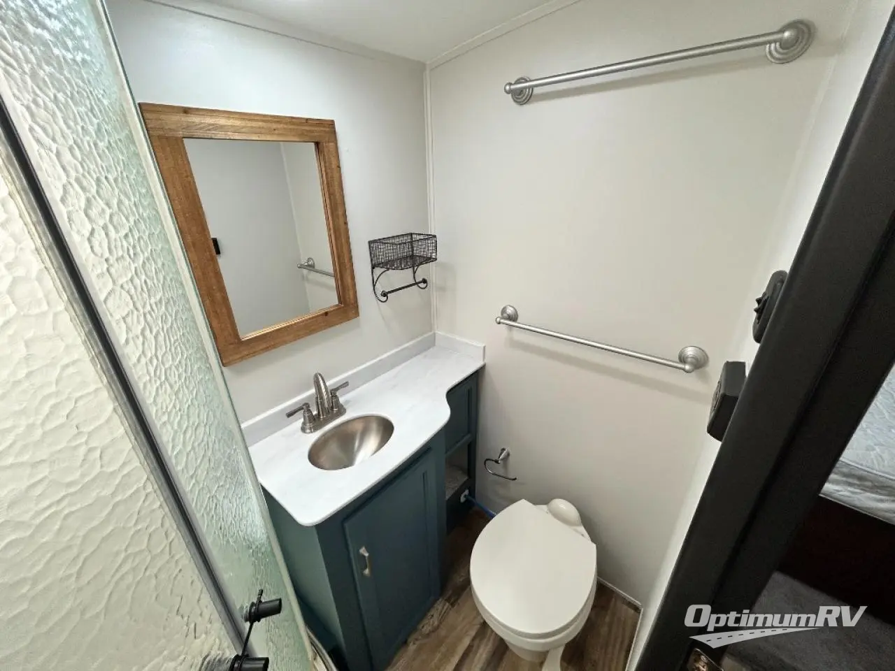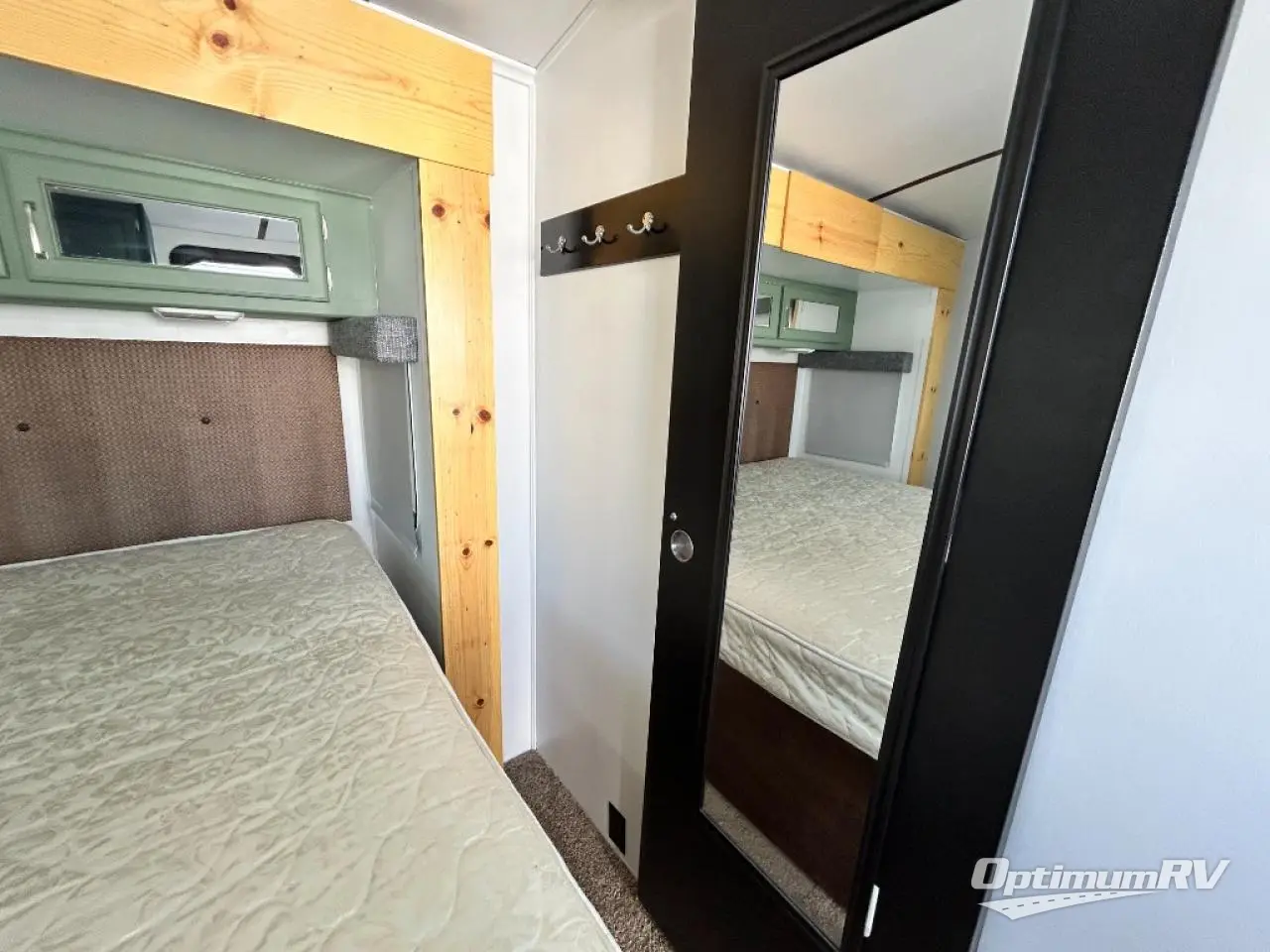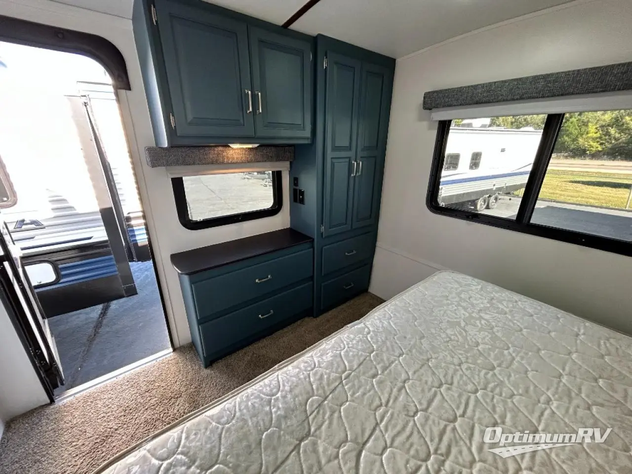 Enter the rear most side door and find yourself tucked away in the master bedroom with a king bed slide out with overhead cabinets. There is a wardrobe opposite the bed, and a dresser for more storage off the foot of the bed next to the exit door.