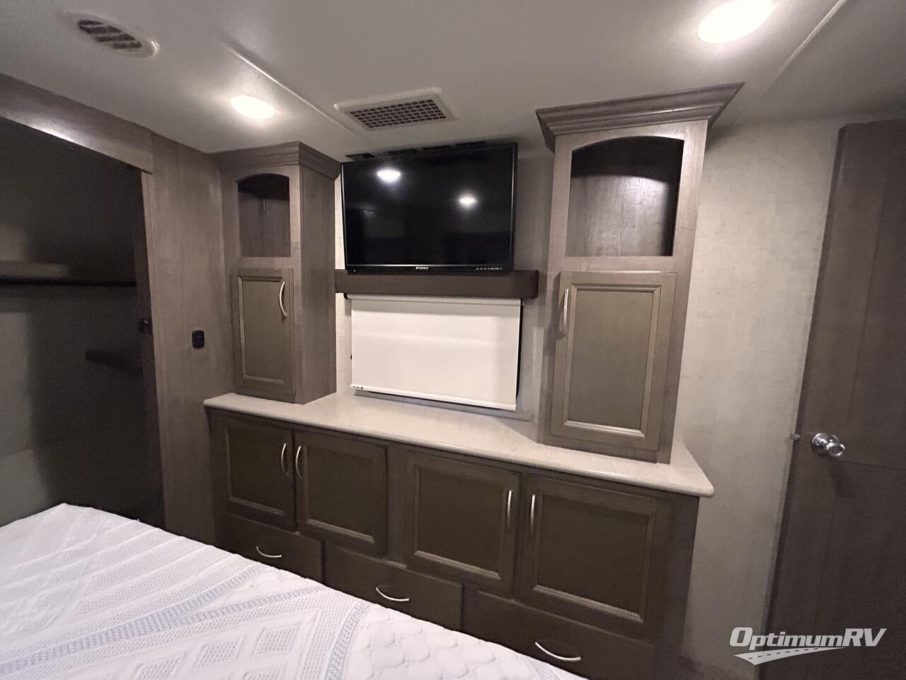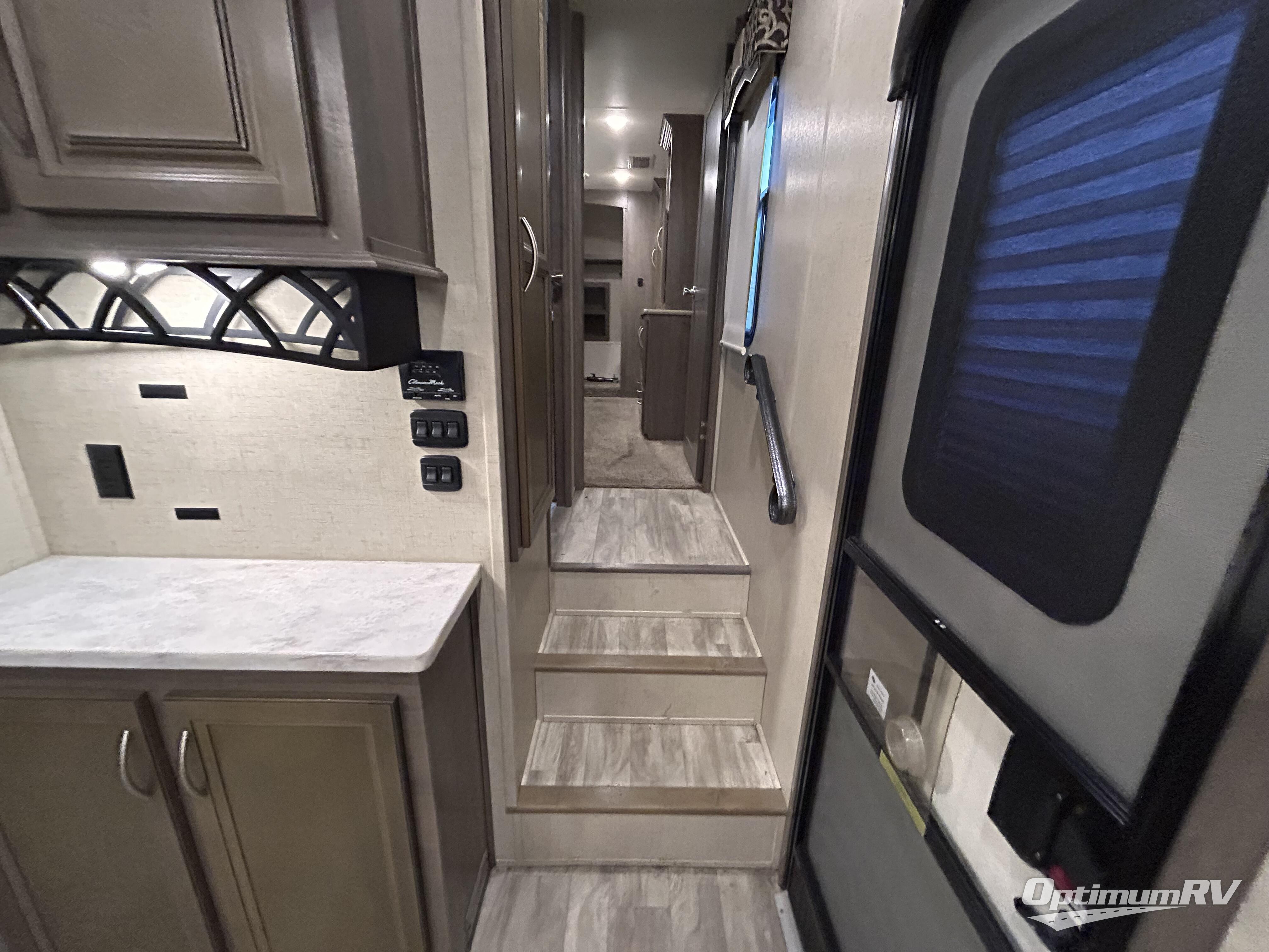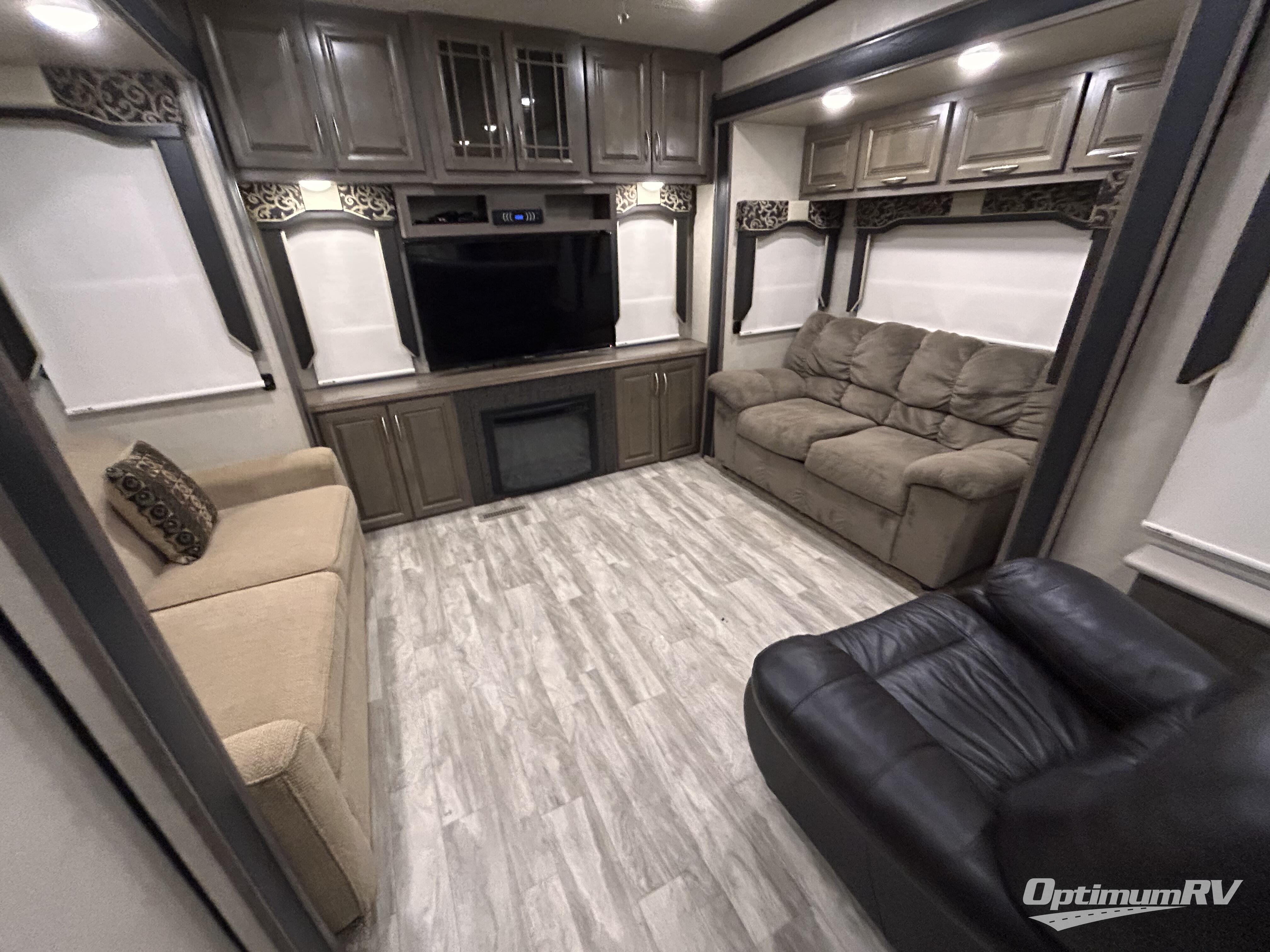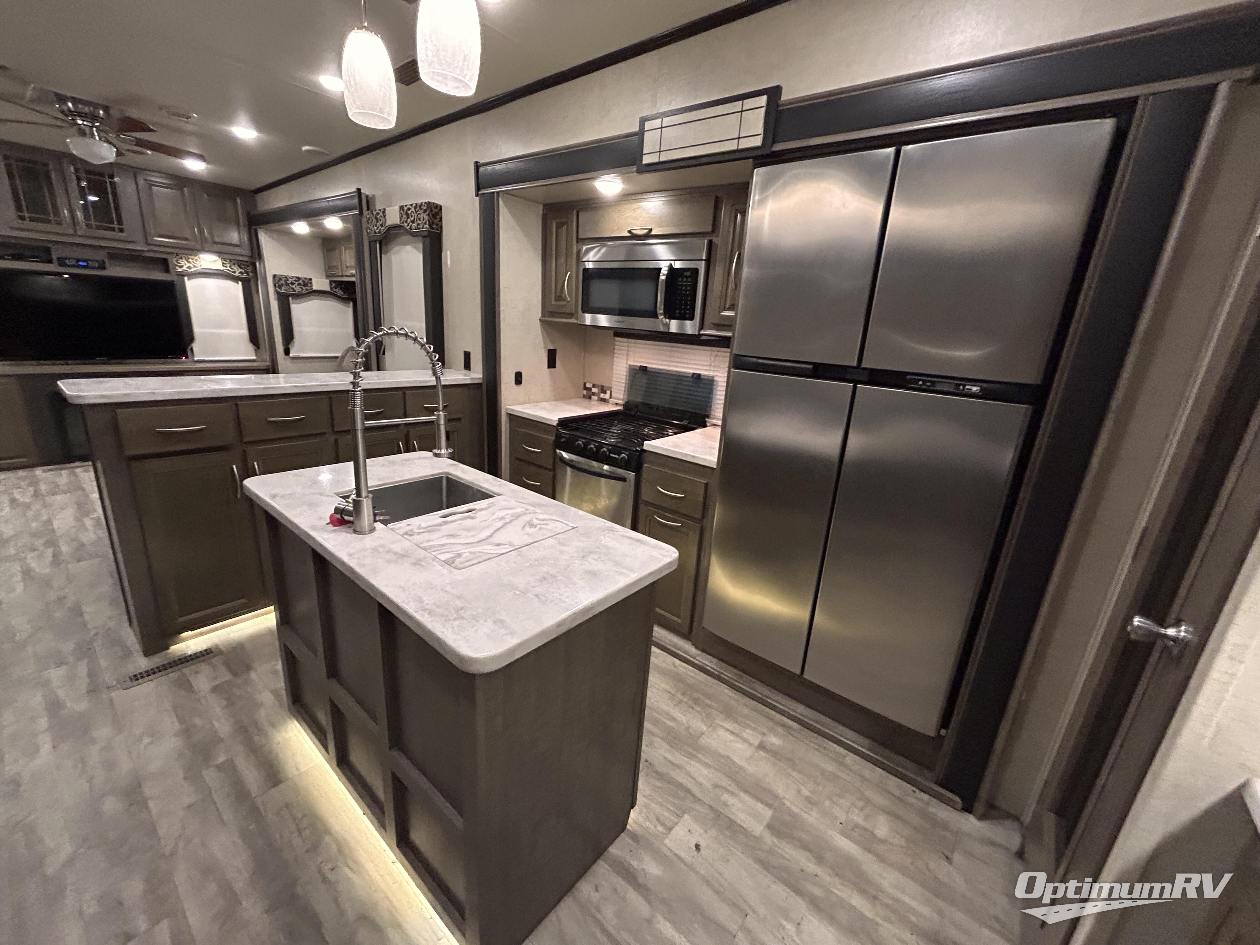Inside this fifth wheel you will love how open and spacious this model feels. In the kitchen/living area there are slides on either side. The first slide has a free-standing table and chairs. The second slide has counter space, a three burner range, refrigerator, and a pantry. Adjacent to the slide there is a large pantry for your non-perishables plus a hutch. A larger hutch is along the interior wall on the opposite side. And don't forget about the kitchen island which has a double sink, surrounded by counter space which makes food prep a breeze.