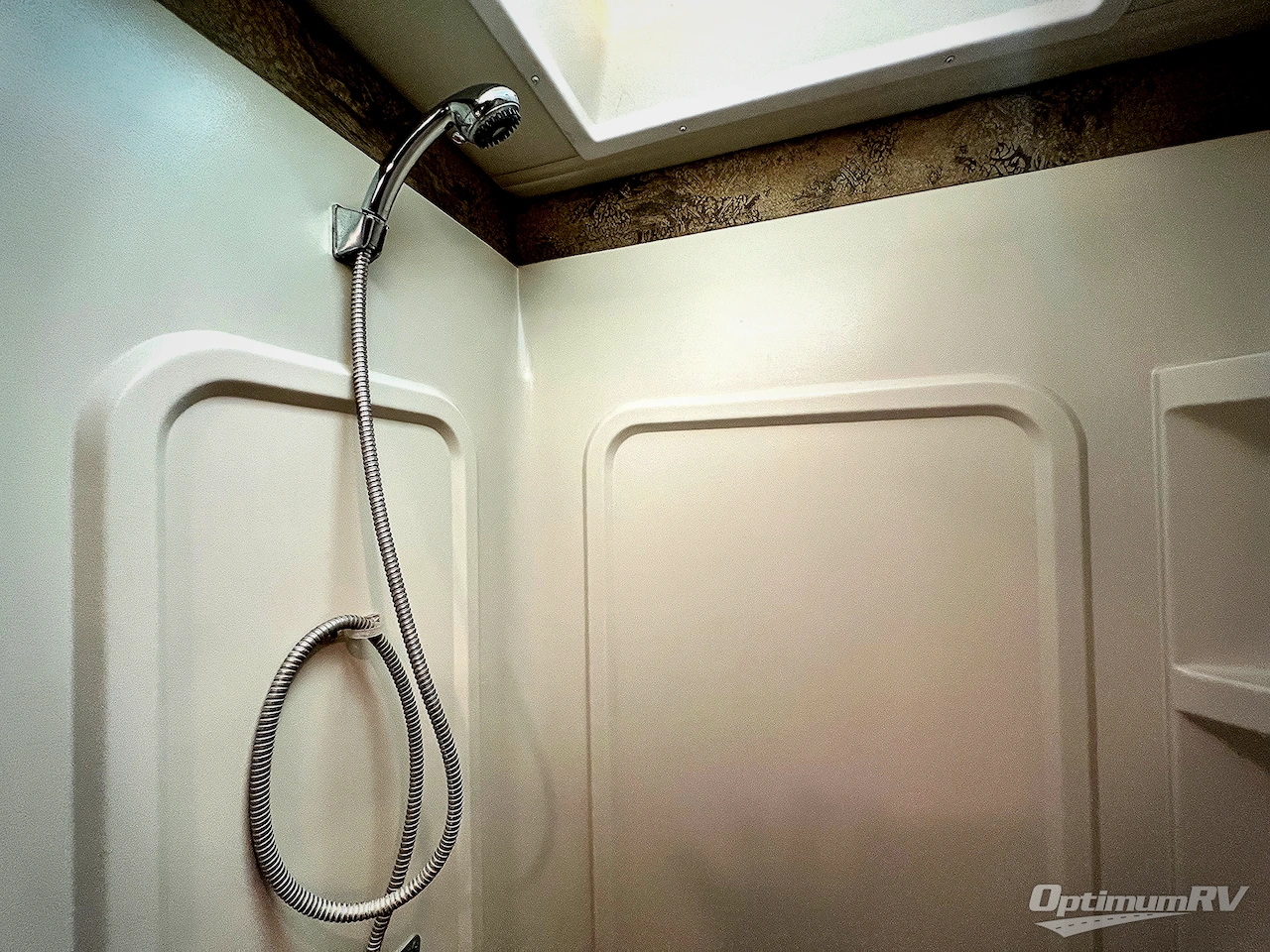 Proceeding toward the rear of the motor home, the bathroom is on the right side. Inside the bathroom you can enjoy a shower, sink, toilet, and overhead cabinets. Across from the bathroom there is a linen cabinet.
