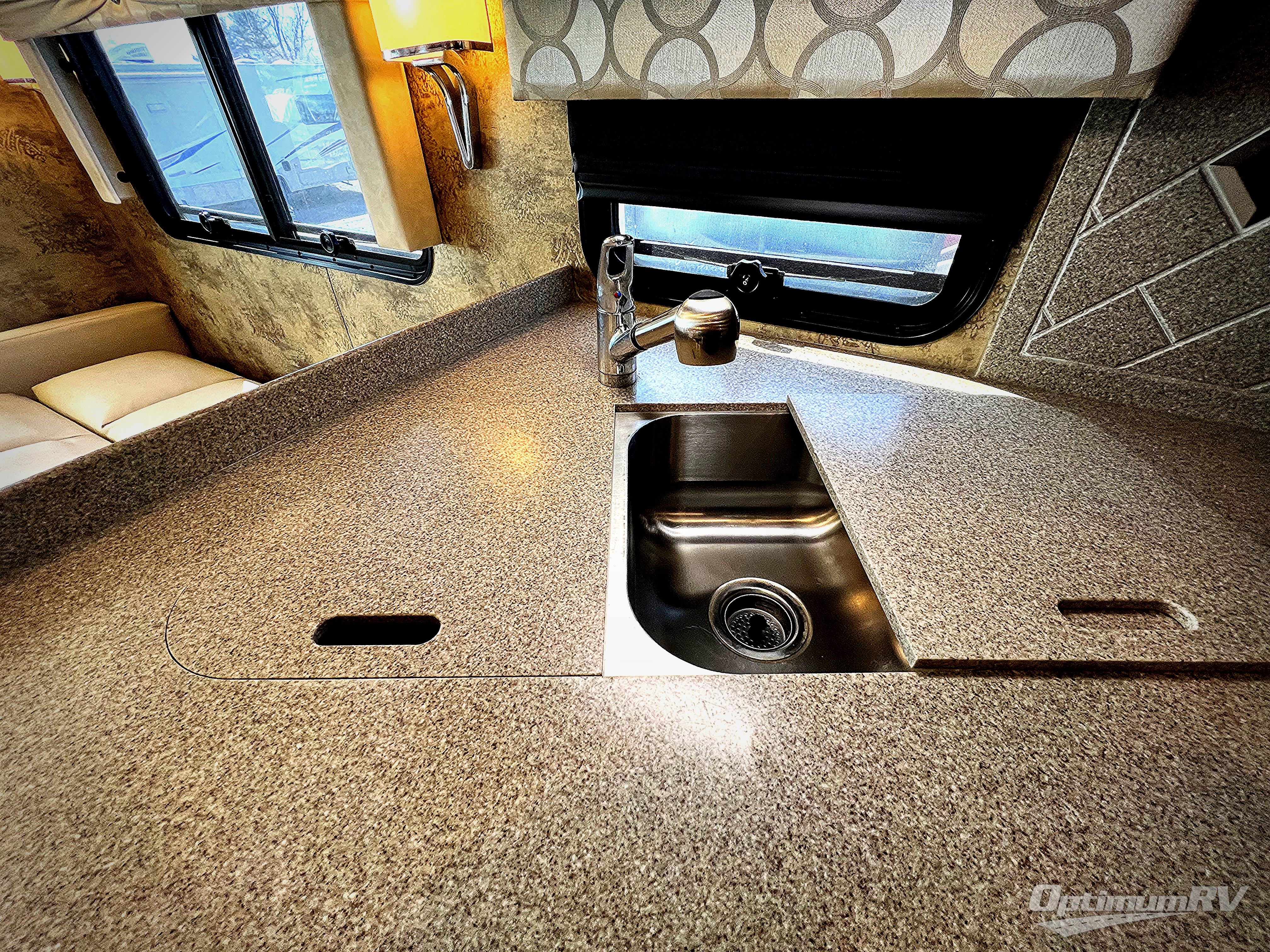 As you enter you will notice that the driver and passenger seat swivel around to add additional seating. There are dual slide outs which open up the living space inside this motor home. The first slide has a jack-knife sofa, and within this slide out you will find all of the kitchen appliances which make fixing meals a breeze. There is a double kitchen sink, three burner range, overhead cabinet, refrigerator, and pantry. The slide out on the road side of the motor home has a jack-knife sofa, overhead cabinet, and a dinette where you can enjoy your meals. Next to the dinette there is a dry bar with a TV.