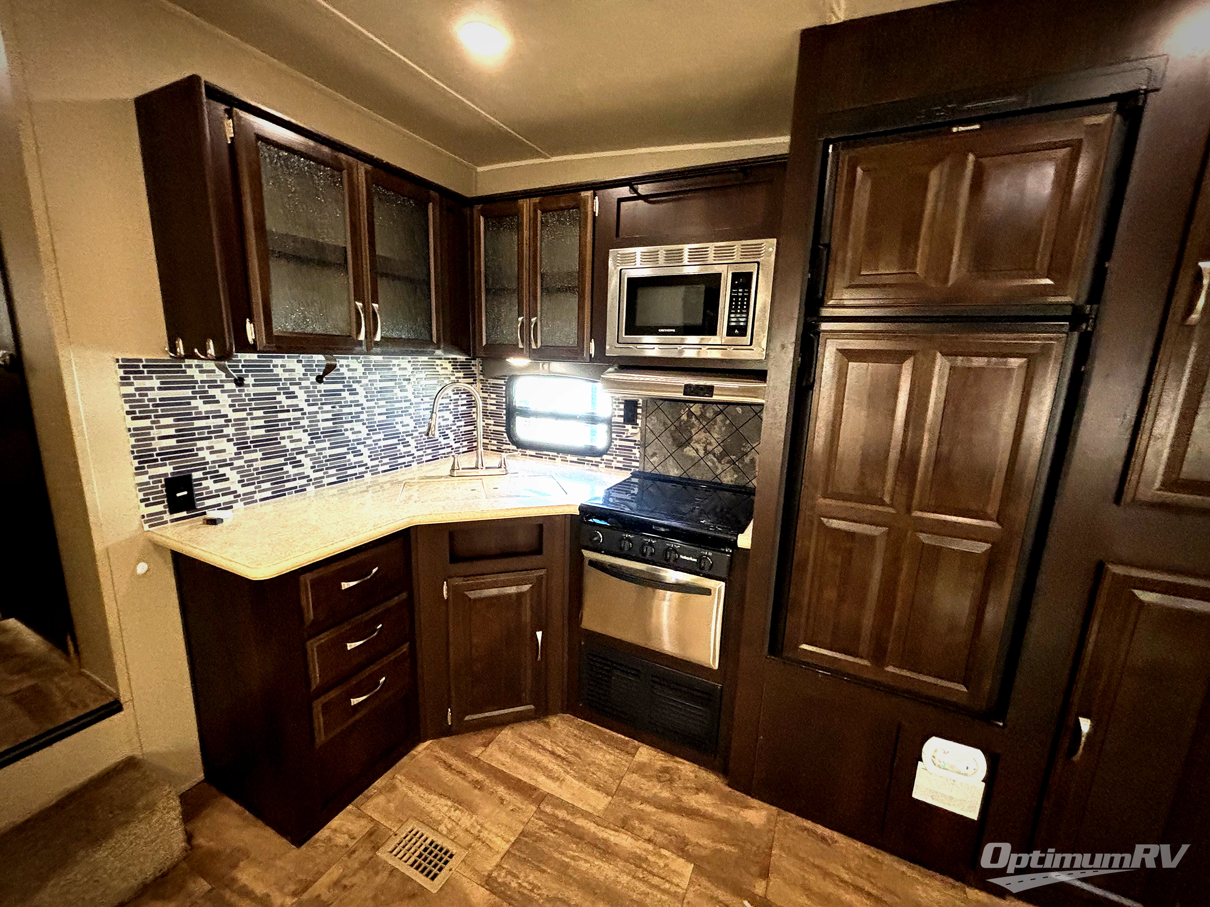 Step into this fifth wheel to enter the rear living area. There are two recliners with an end table in between, and overhead cabinets.