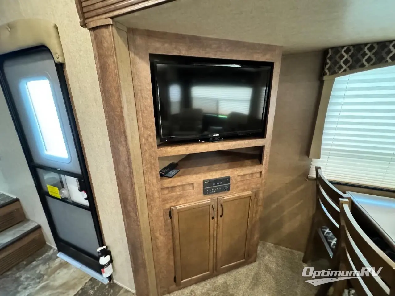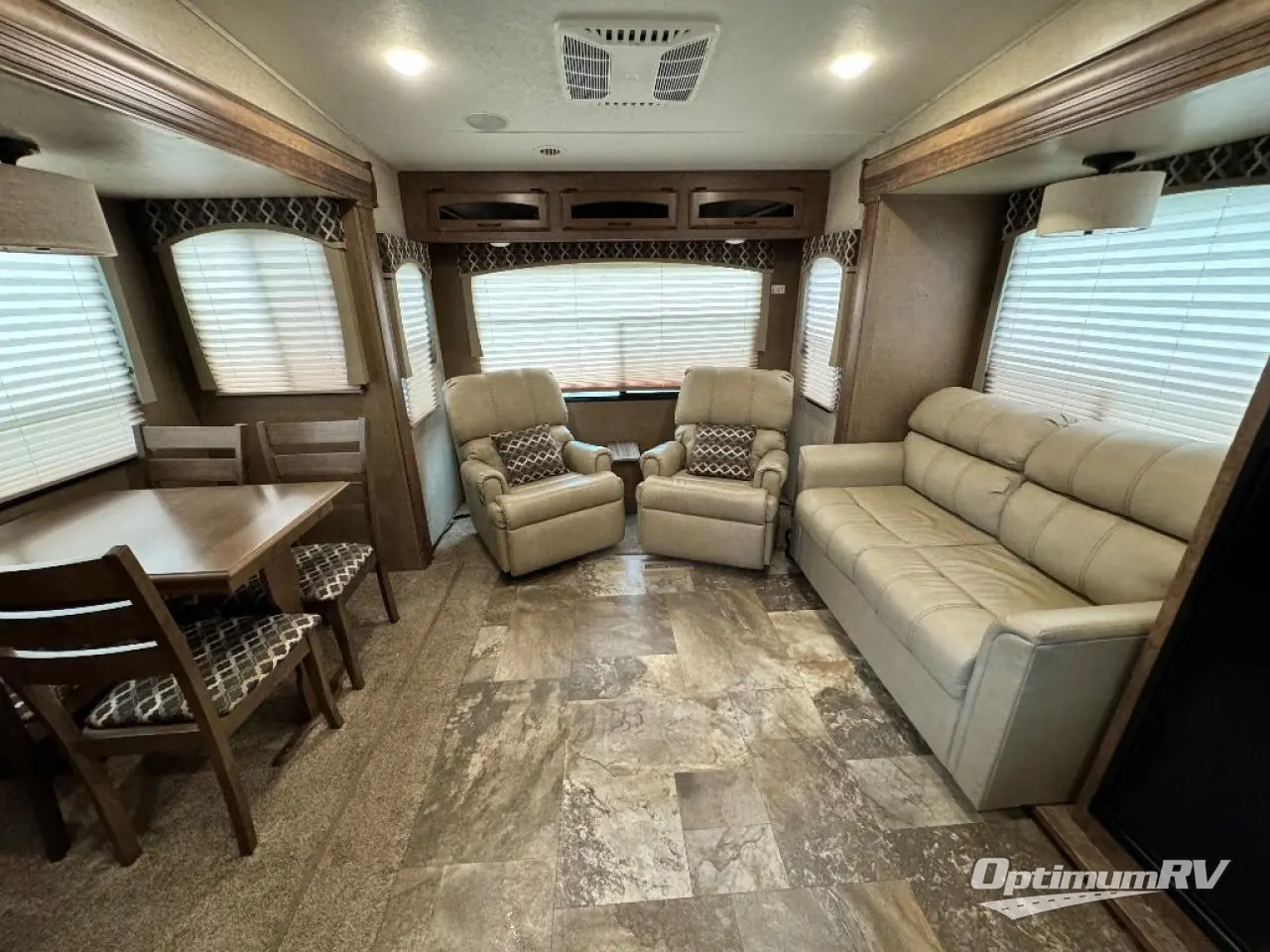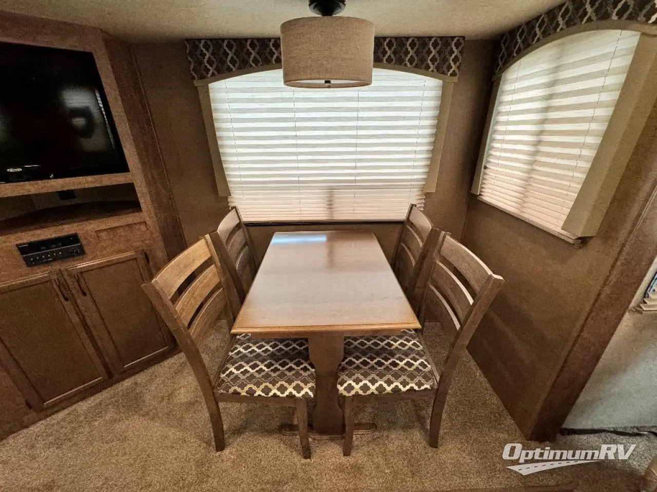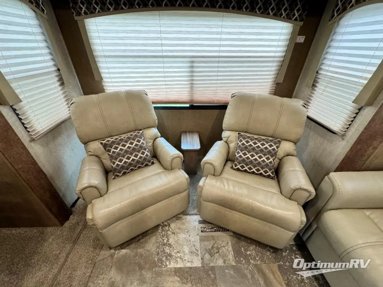 Along the rear wall there are two lounge chairs, or you can choose recliners if you wish. There is an end table between the two, and overhead cabinets that stretch the width of the unit. For your meals you can dine comfortably at the booth dinette found within the curb side slide. You will also find an entertainment center here to enjoy.