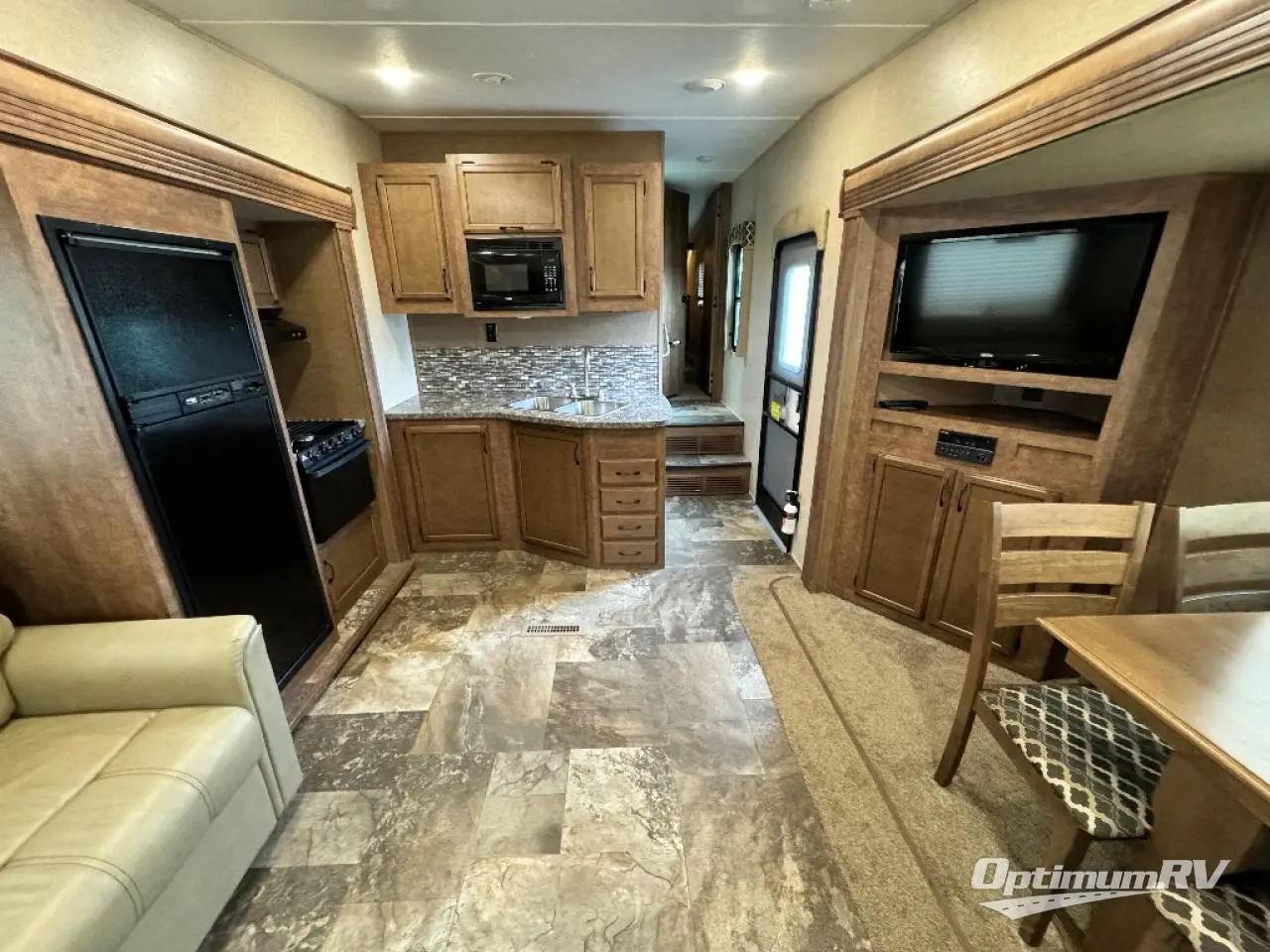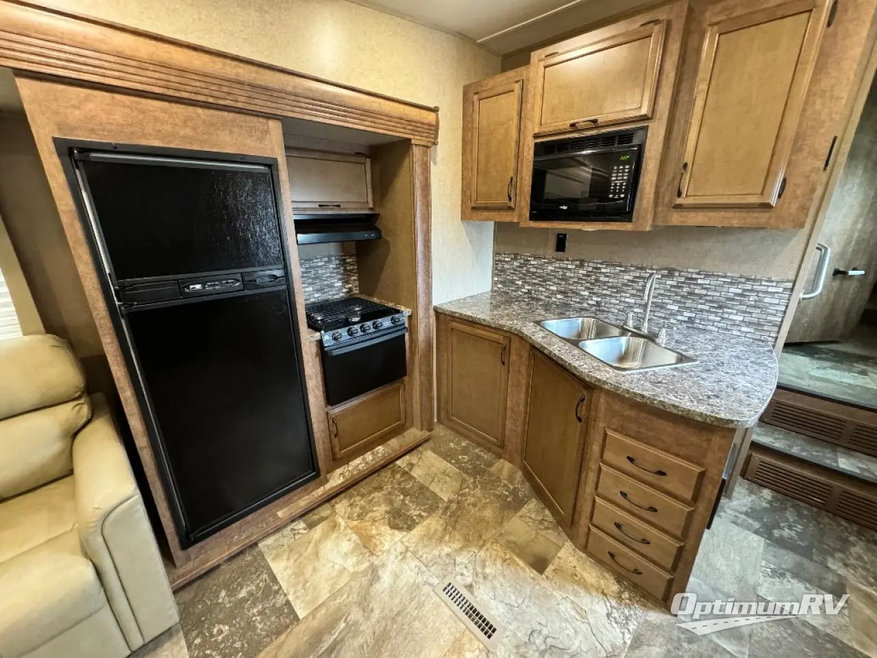 Step inside and notice the kitchen area straight ahead. There is a double sink, plus counter space straight in the door along the interior wall, plus overhead cabinets too. A slide out three burner range and refrigerator make it easy to whip up light meals and snacks for your family. Plus the road side slide also features a hide-a-bed sofa as well.