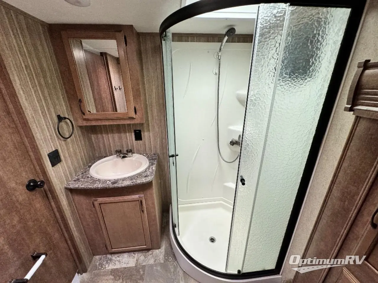 Head up the steps to the right of the main entry and find a side aisle bath including a corner shower, toilet, and vanity with sink on your left. There is a second bath entry door that slides open to allow access to the linen cabinet up front within the master bedroom slide out.