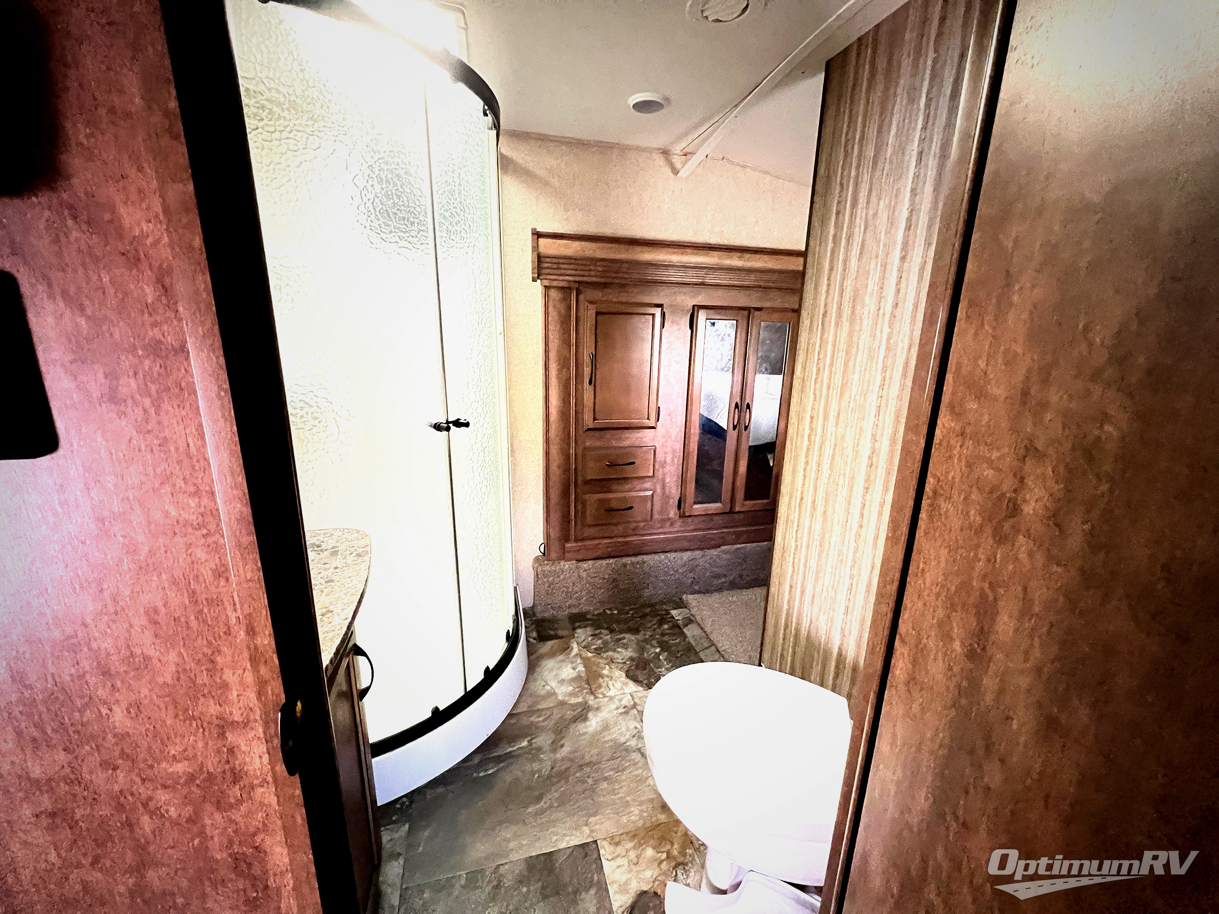 Back at the entry door head up the steps to your right. Here you will find a side aisle bath and front master bedroom. The bathroom features a corner shower, toilet, and sink with storage overhead. There is a second sliding bath door that leads into the front master, and also provides access to the slide out linen/wardrobe along the road side too.