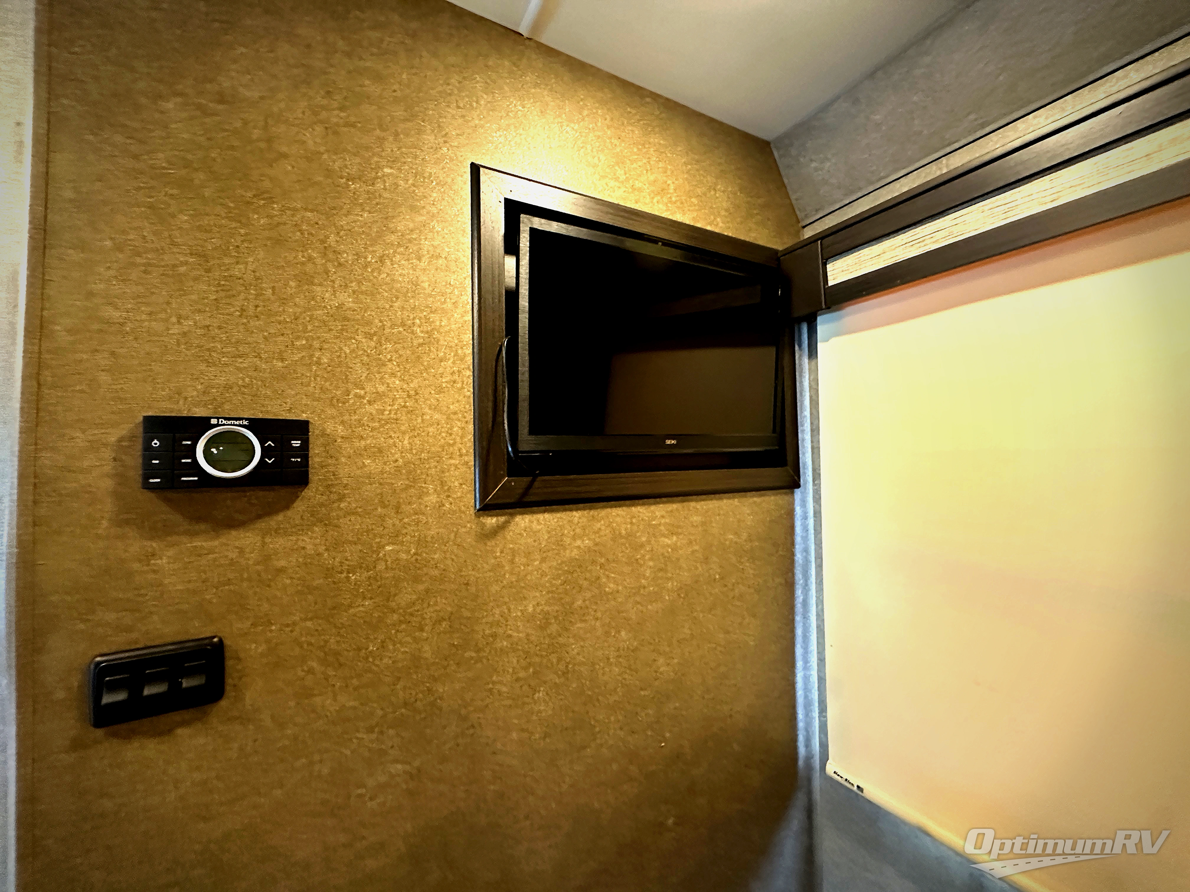 A flip-up queen size bed slides out along the road side providing a bit more space inside with cushioned seating underneath. There is also a table base, and a 32" LED TV. A curtain can be pulled to give you more privacy in the bedroom area at night, plus so much more!