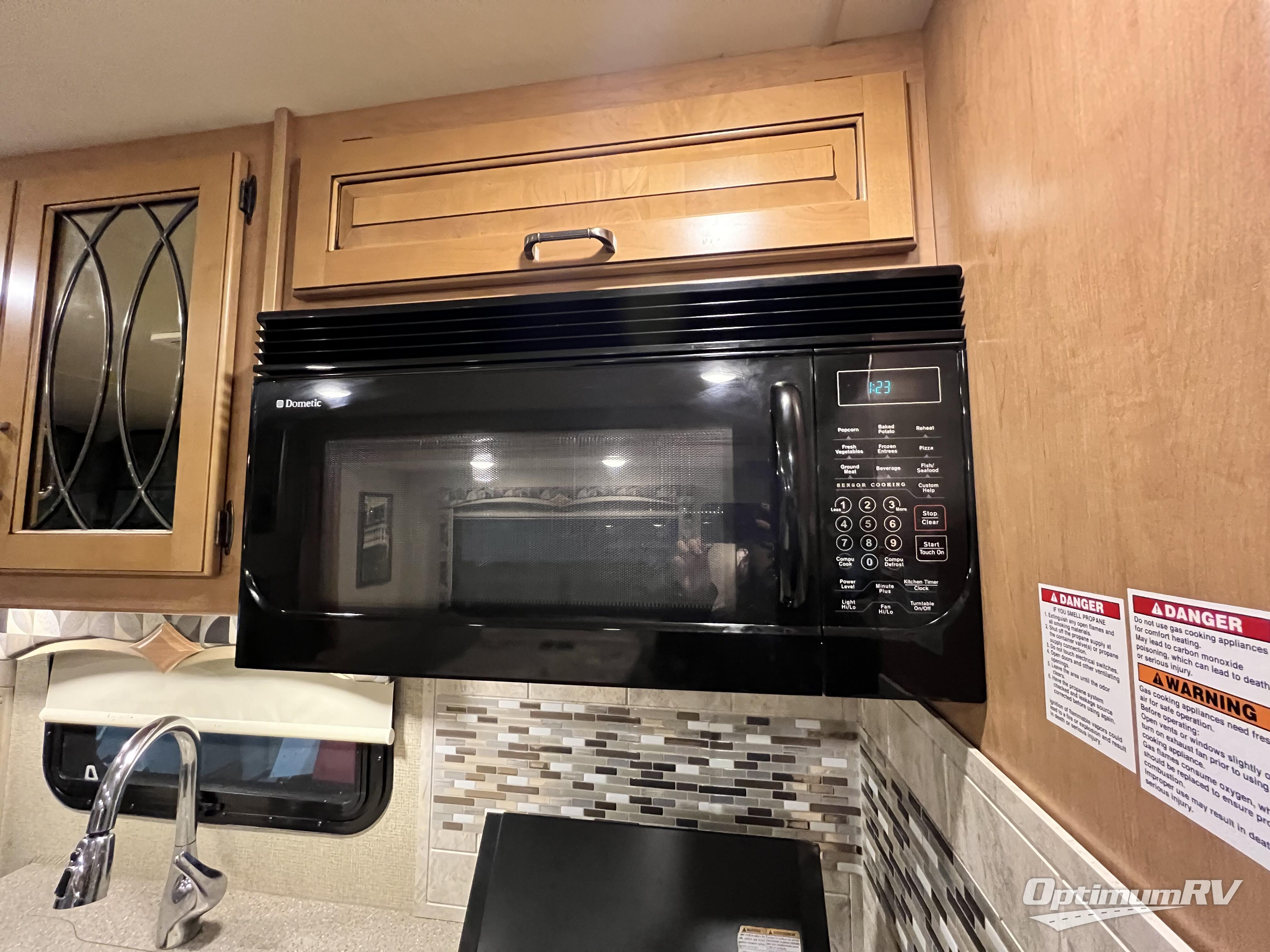 To the left of the entry door find a kitchen with all the amenities needed to create gourmet meals and snacks on the go. There is a double kitchen sink, a three burner range with overhead microwave oven, residential refrigerator, and a pantry. The pantry and overhead storage offers plenty of space for dry and canned food items, plus your dishes and things.