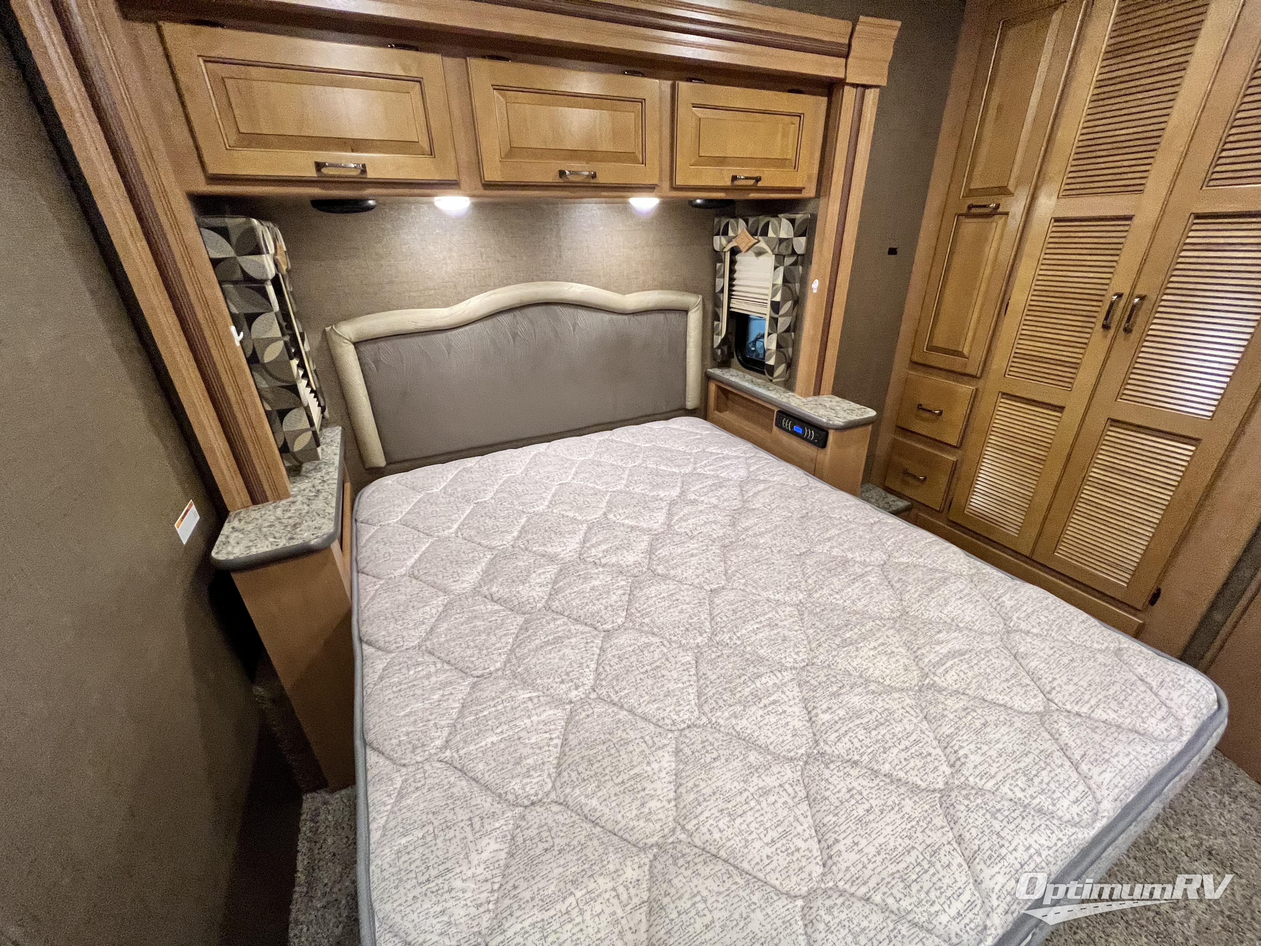 In the master bedroom you will find a slide out queen size bed with nightstands on both sides along with overhead storage above the head of the bed. Opposite find a wardrobe and dresser with a 32" LED TV. Across the rear wall there are pull-out shelves, a wardrobe that has been prepped for a washer/dryer, and a half bath mentioned above with a toilet, vanity with sink, plus overhead cabinet.