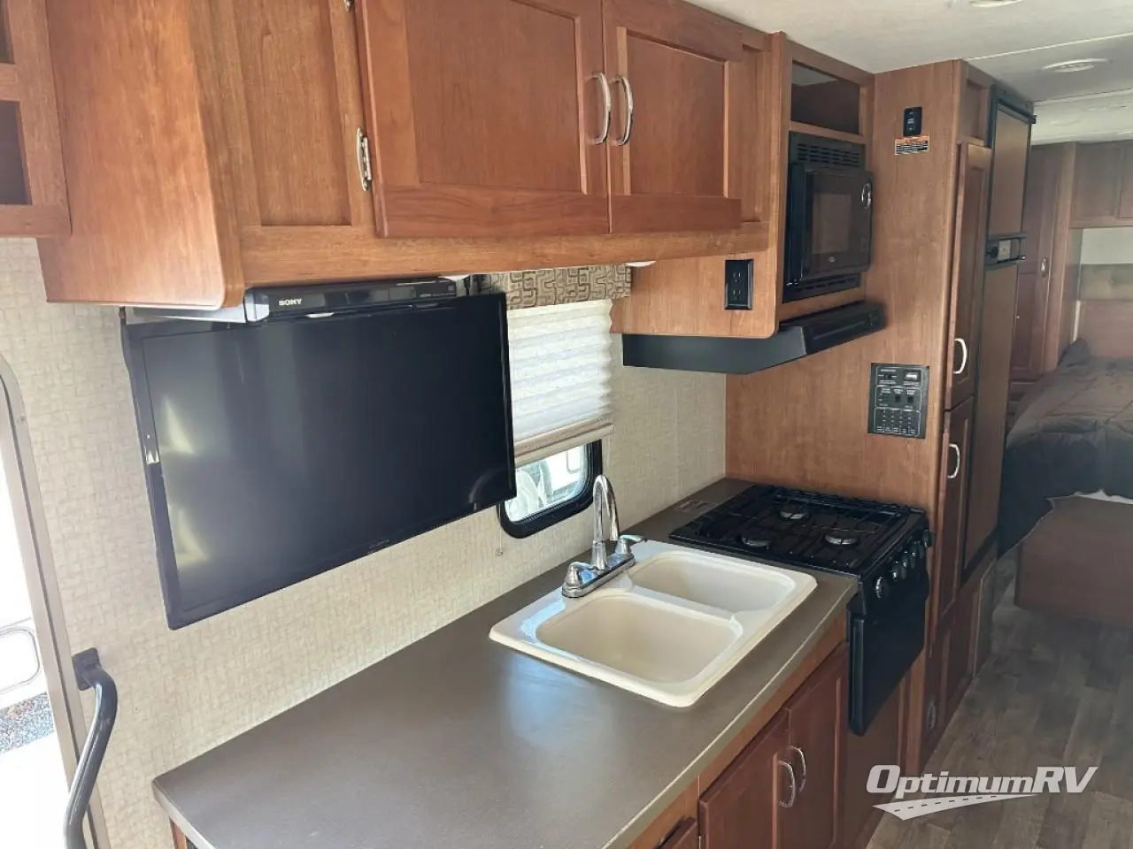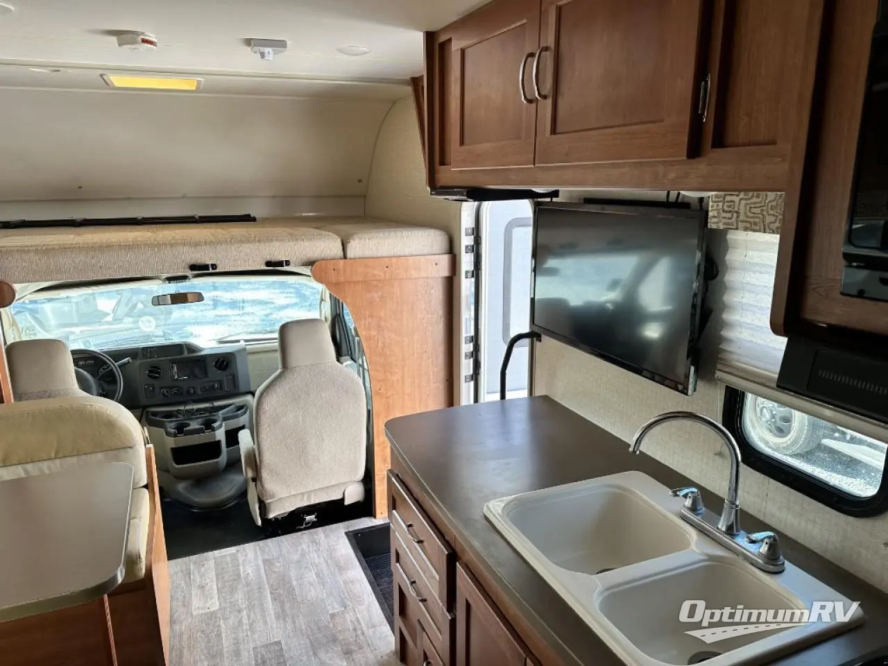 Up front there is an overhead bunk above the cab seats that is 57" x 95". The kids will enjoy sleeping up top and there is also a space for an optional 32" HDTV w/DVD player and remote above the counter area near the double kitchen sink, plus so much more!