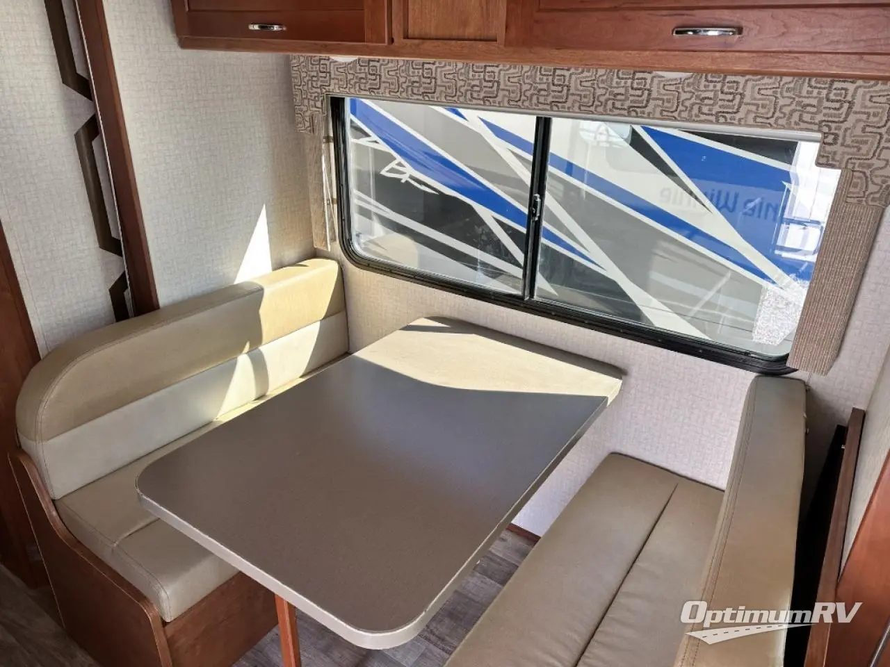 You will easily be able to cook up light meals and snacks while on the go in this Minnie Winnie kitchen featuring a refrigerator, pantry, three burner range, double sink, and counter area. There are also overhead cabinets for dishes and things. Once the meals are created enjoy dining at the slide out booth dinette that also features four sets of seat belts so everyone can remain secure while the motor home is moving. At night the dinette can easily be made into additional sleeping space for family or extra overnight guests.