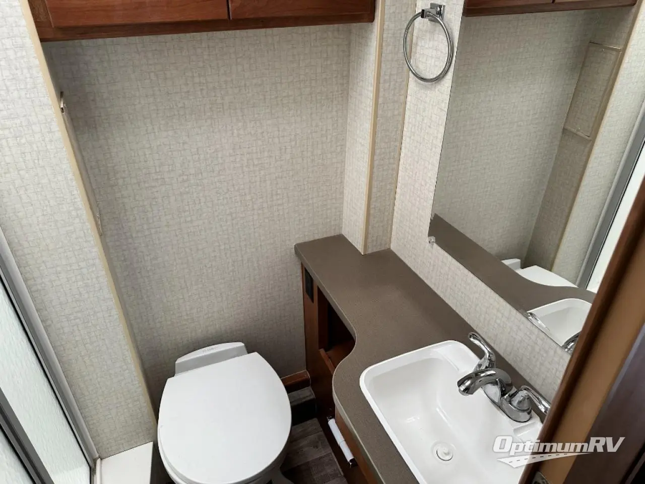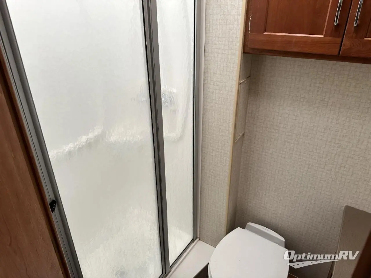 Model 27Q offers a rear bedroom with queen size bed including a nightstand and wardrobe. There is also an overhead cabinet for more storage, and a space for an optional TV if you like. A folding door can be closed to provide more privacy at night or when getting dressed.