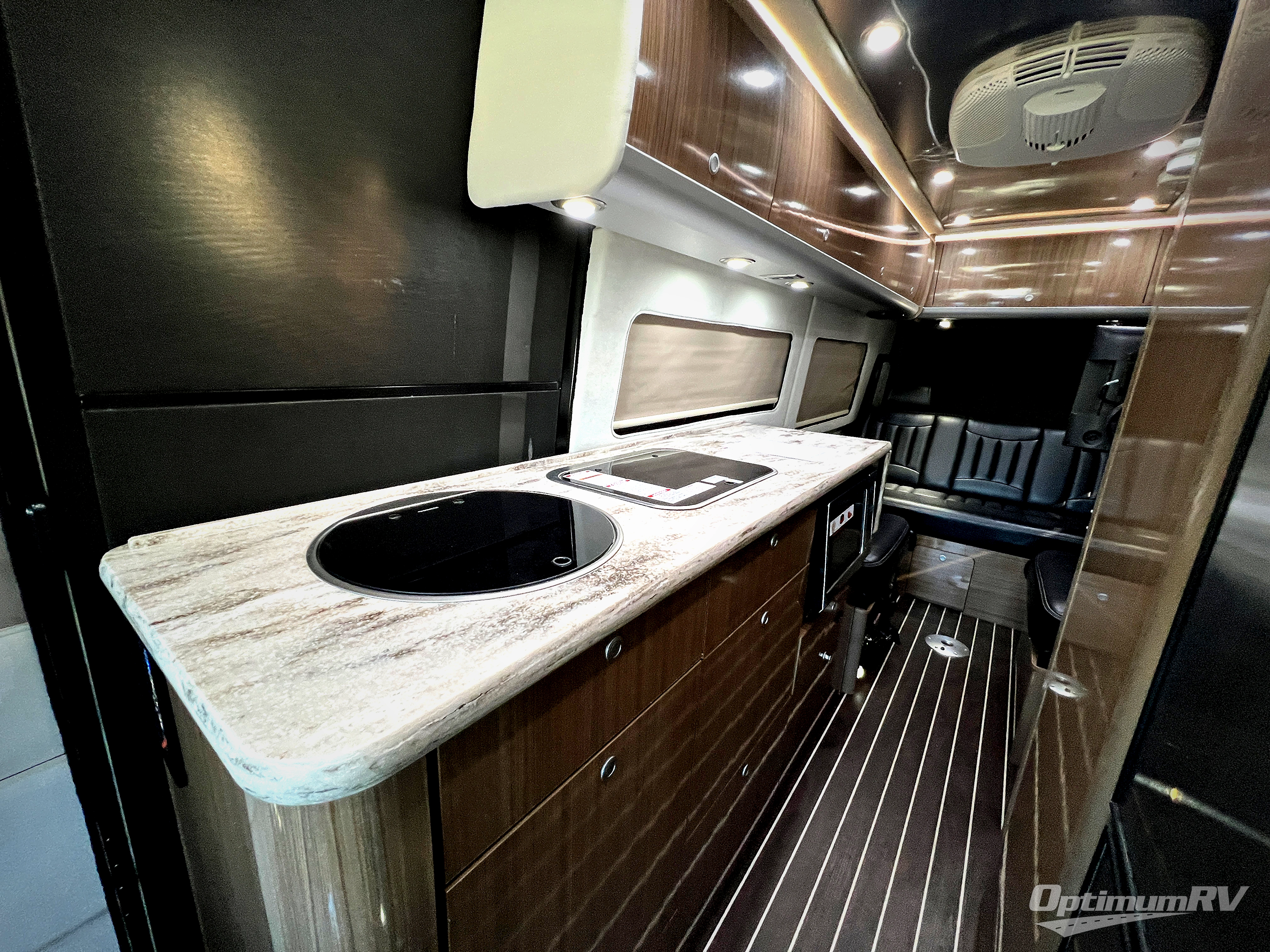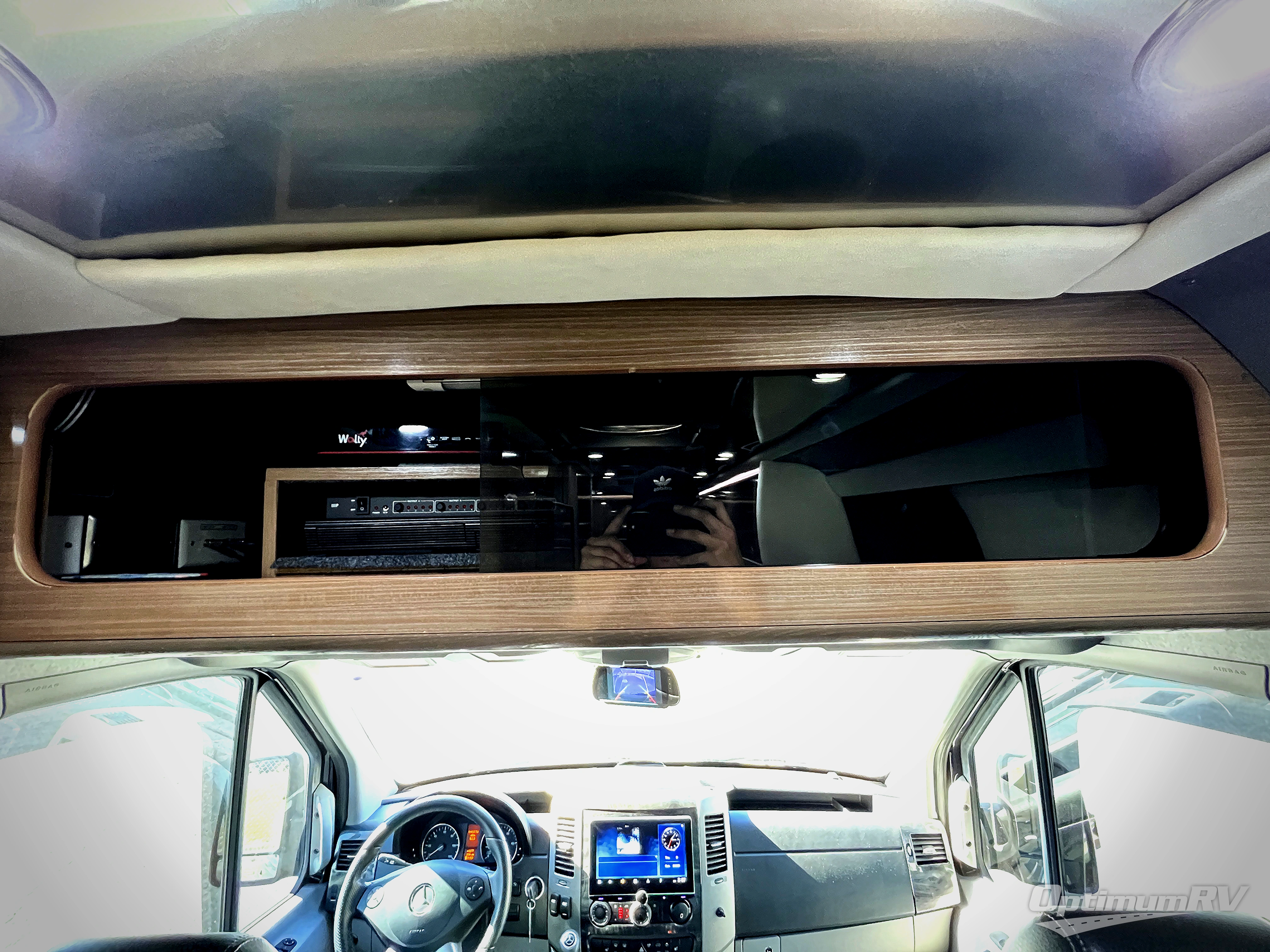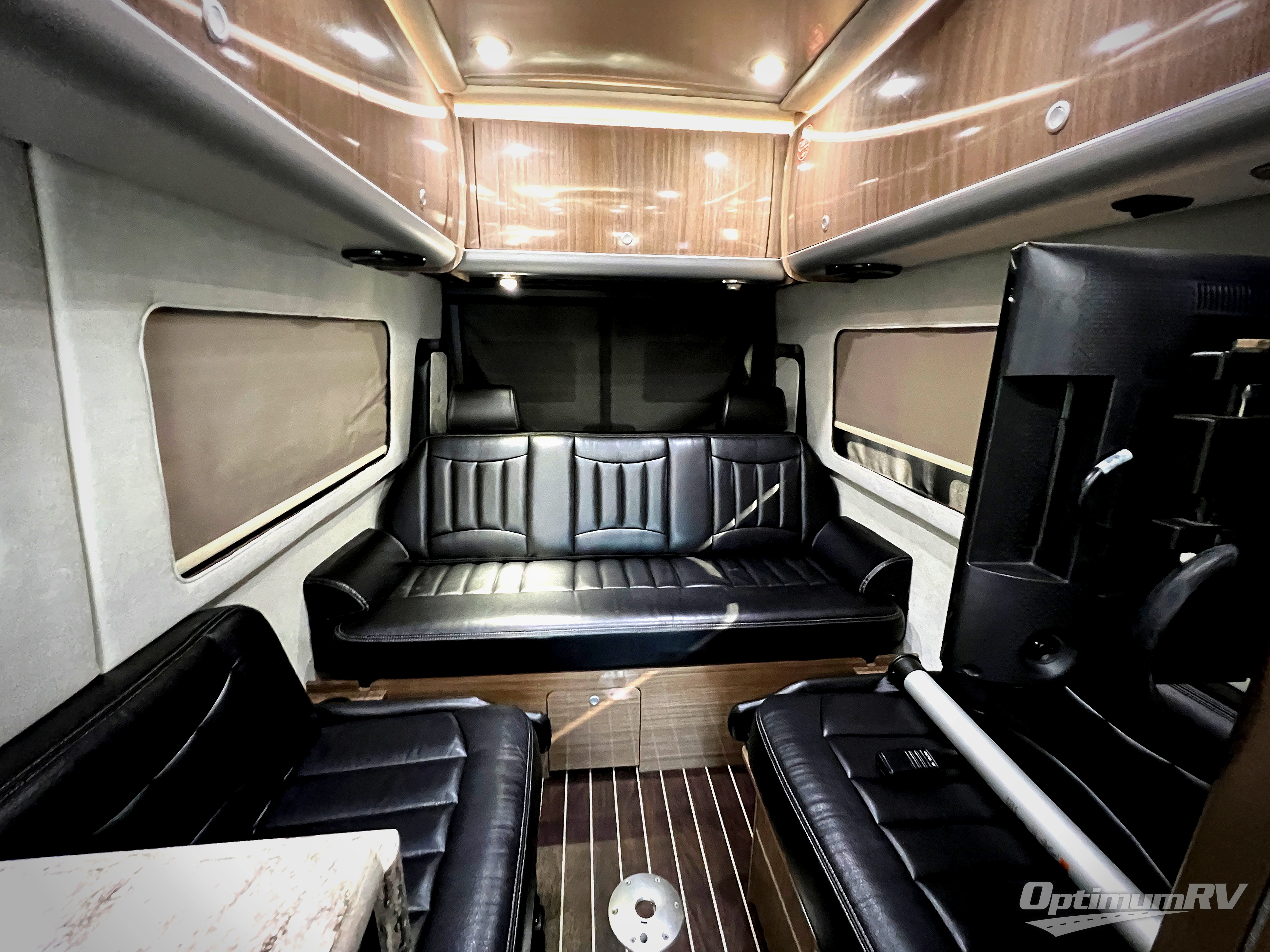 Step inside and find a convenient conversation area with the driver and passenger seats swiveled around. There is a removable table between the driver and passenger seat which allows for ease while eating or easy ability to play a game. Behind the driver's seat there is a work station and an LED TV.