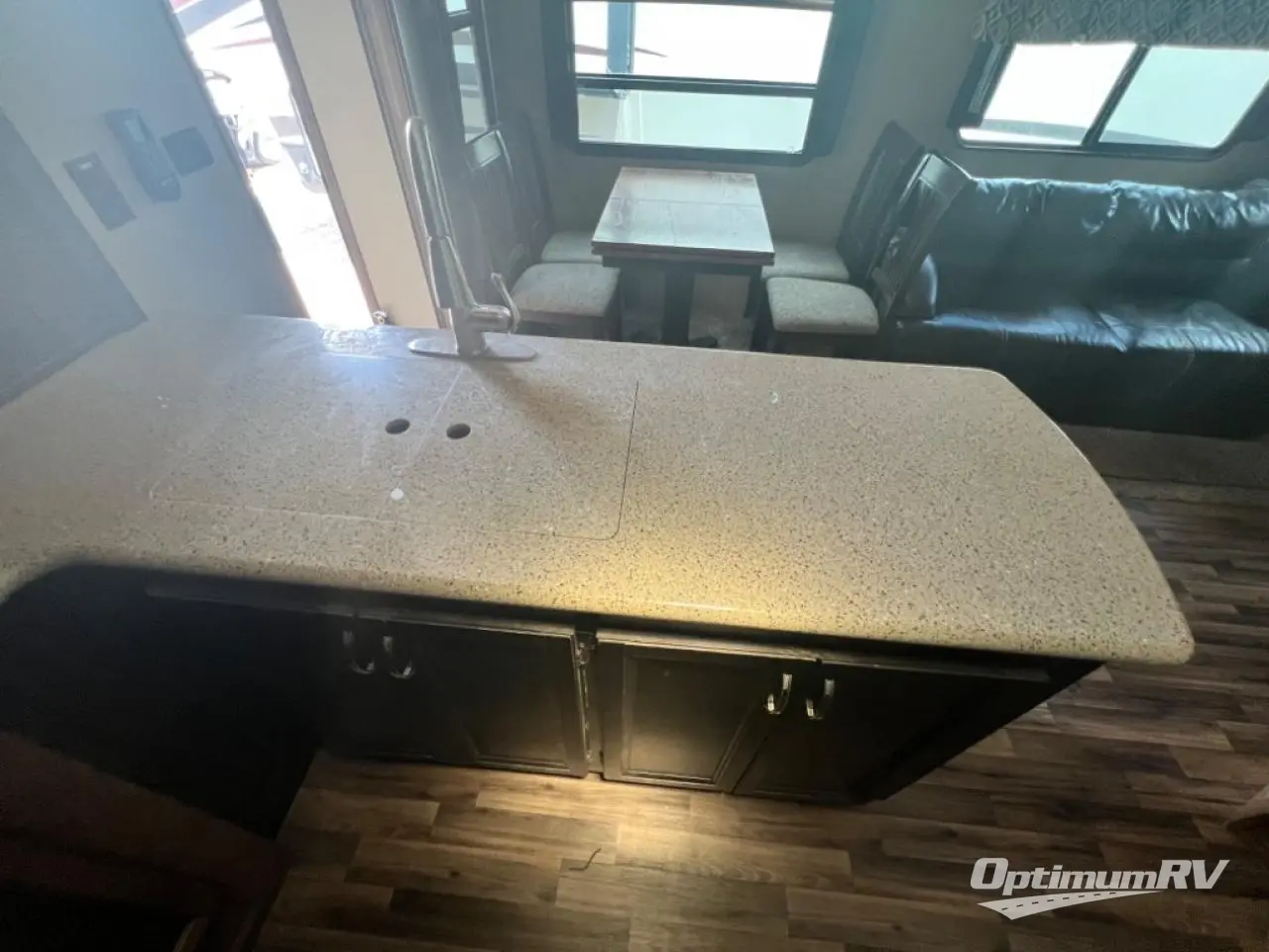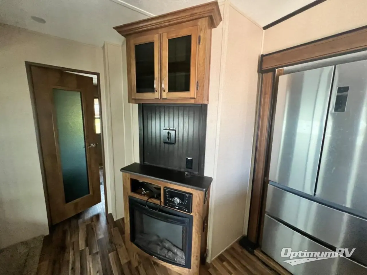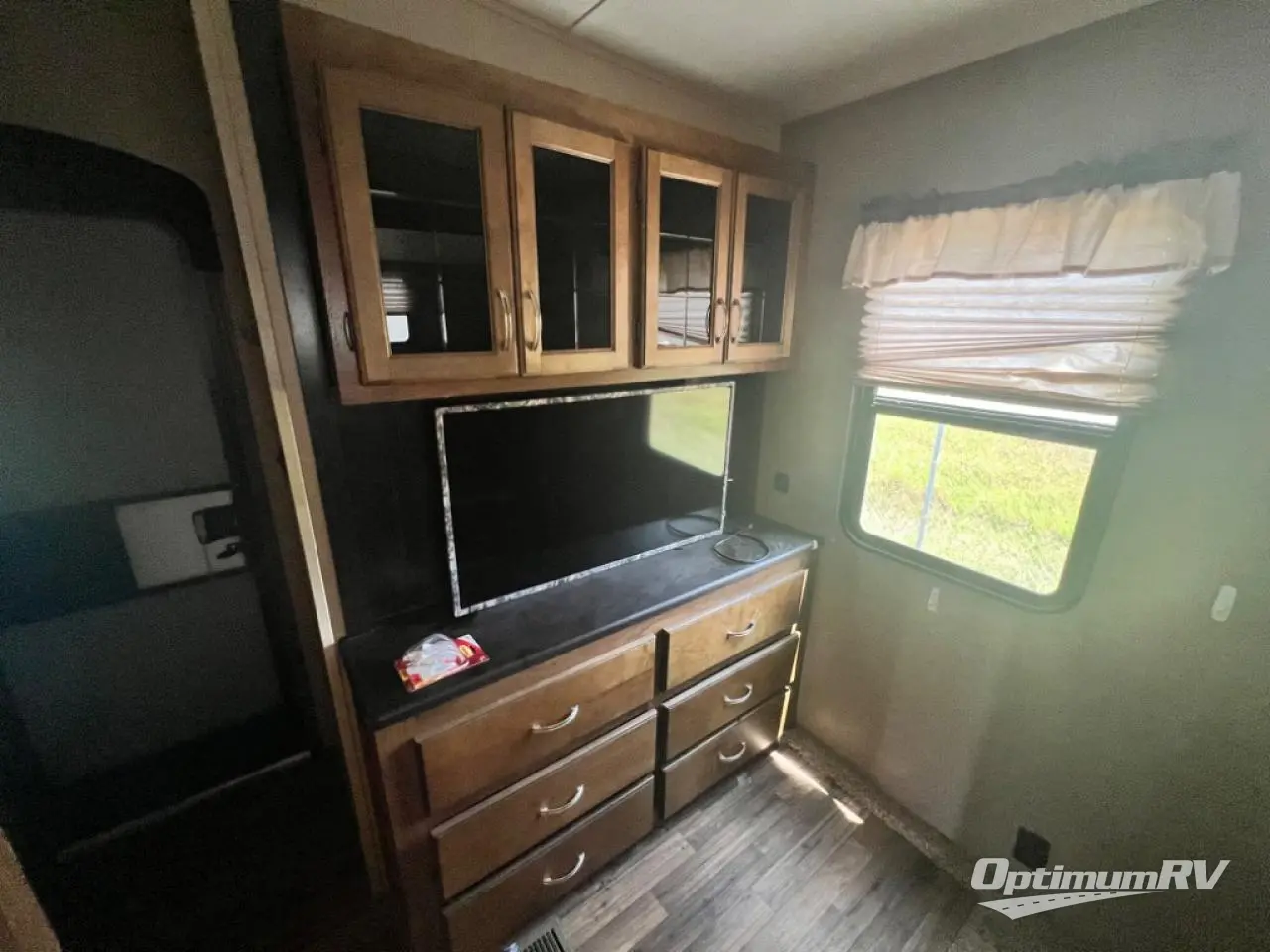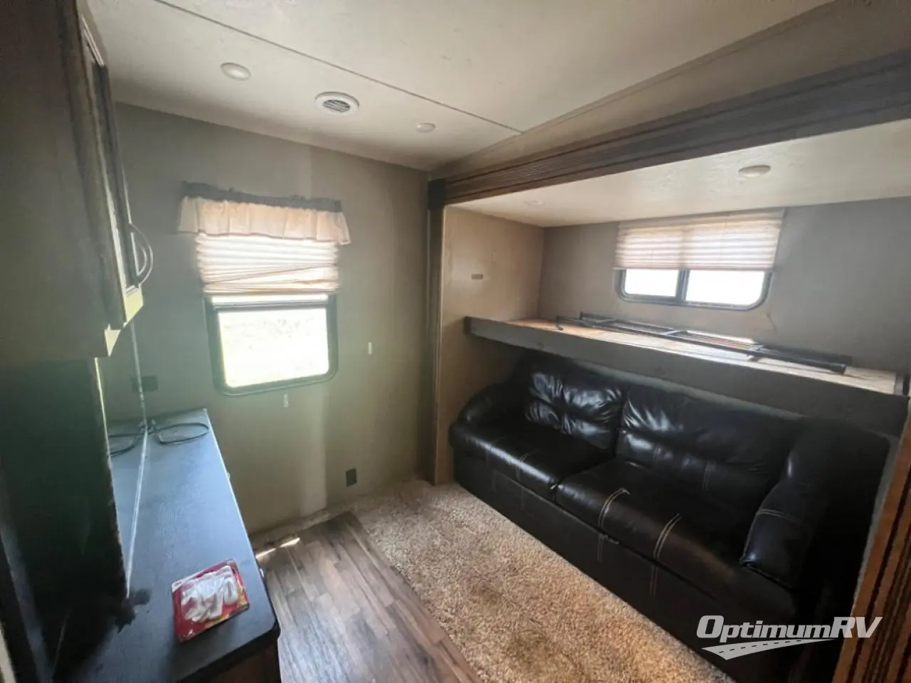 The third bedroom is in the rear of this Chaparral fifth wheel. There is a slide out tri-fold sofa with flip-down bunk above along the road side. There is an entertainment center opposite the slide next to a second entry door which is super convenient. This space also contains its own private half bath including a toilet and vanity with sink. The second entry along the curbside allows quick access to the half bath from the outside when you need it.