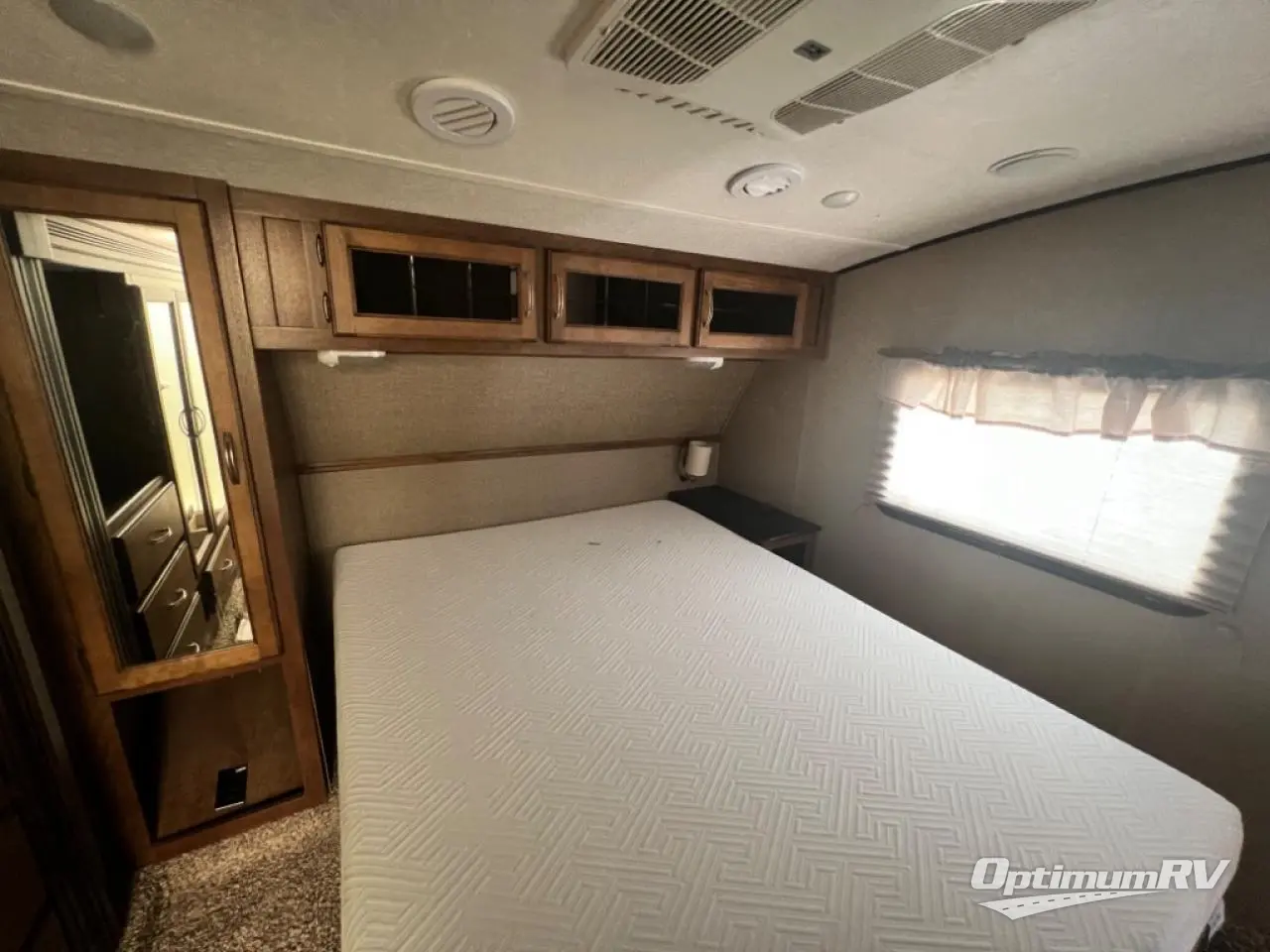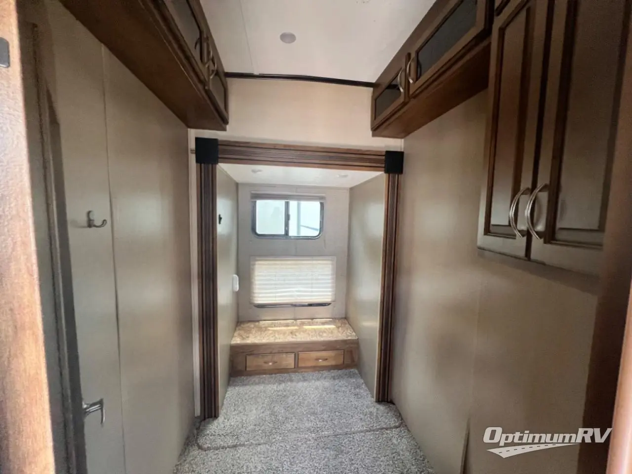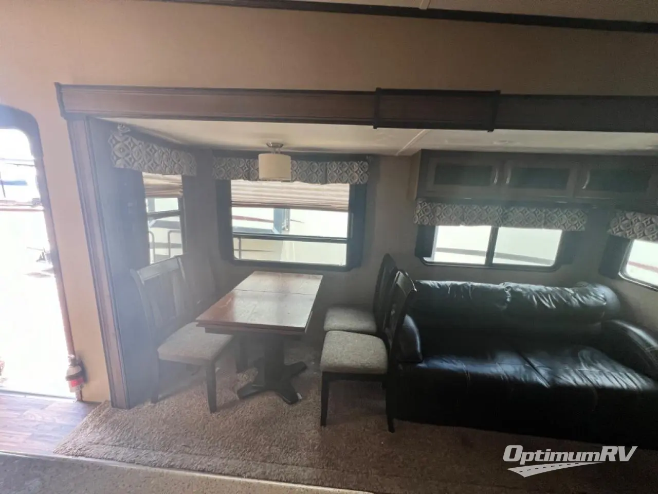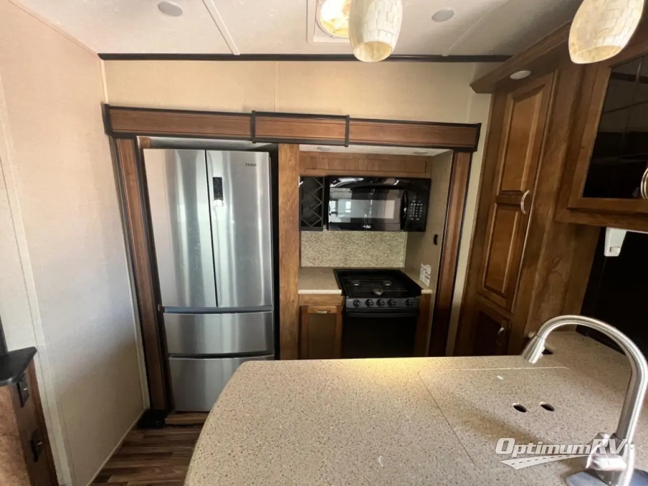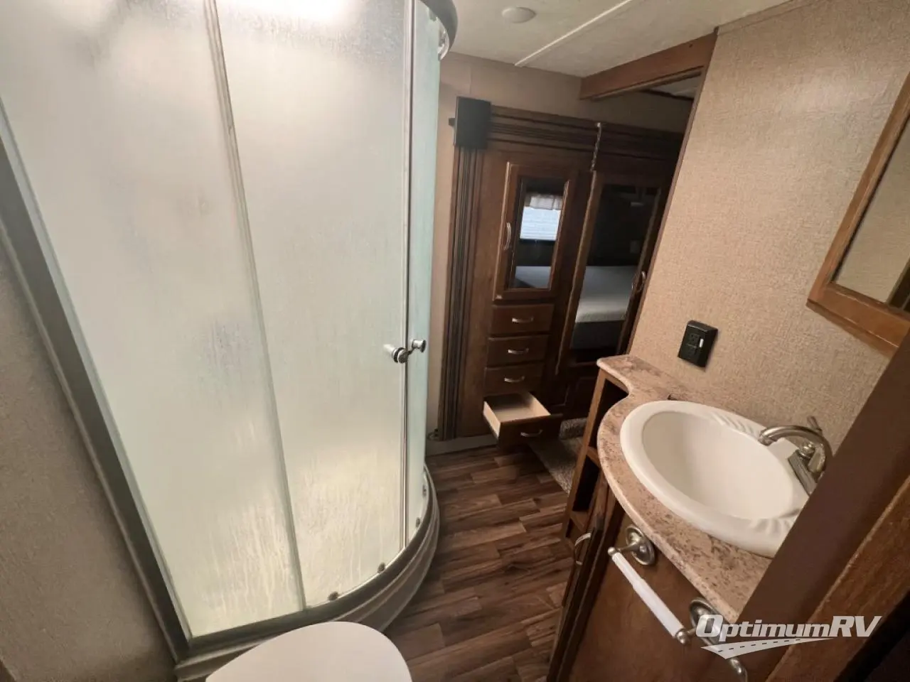 The third bedroom is in the rear of this Chaparral fifth wheel. There is a slide out tri-fold sofa with flip-down bunk above along the road side. There is an entertainment center opposite the slide next to a second entry door which is super convenient. This space also contains its own private half bath including a toilet and vanity with sink. The second entry along the curbside allows quick access to the half bath from the outside when you need it.