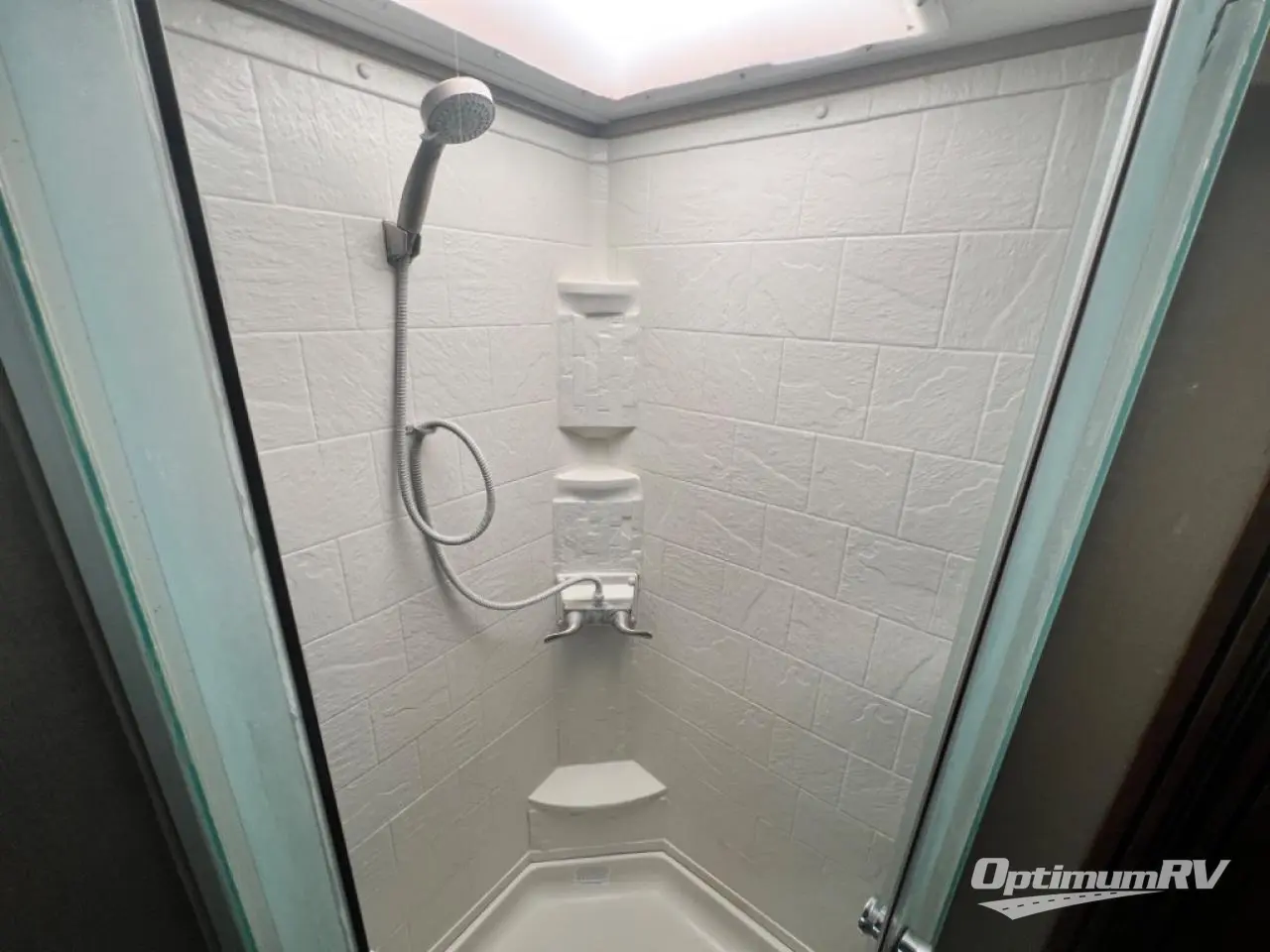 Head up two steps just outside the bunkhouse bedroom door and find a master bedroom and en suite bath. The bath entry begins to your immediate left just inside the door and features a 34" x 34" corner shower, toilet, and vanity with sink. With a second sliding bath entry door leading into the master bedroom you will have access to the linen closet found in the bedroom wardrobe slide. The master bedroom provides a queen bed with a wardrobe along the road side front, and a nightstand on the curb side front of the bed. There is also a wardrobe slide out that includes the bathroom linen cabinet and drawer space beside room for your hanging clothes.