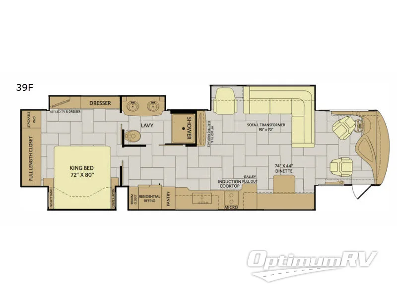 For your next cross-country road trip you will want this beautiful Discovery 39F class A motor home. When you are ready to relax then come sit and enjoy the comfortable 95" x 70" L-transformer sofa or lounge chair. Along the interior wall there is a 49" LED TV plus an electric fireplace. Throughout this model there is plenty of room with the quad slide outs, and in the rear bedroom you will find a king bed, a full length closet, and a stackable washer/dryer so you can easily keep up with your laundry while you are away from home and more!