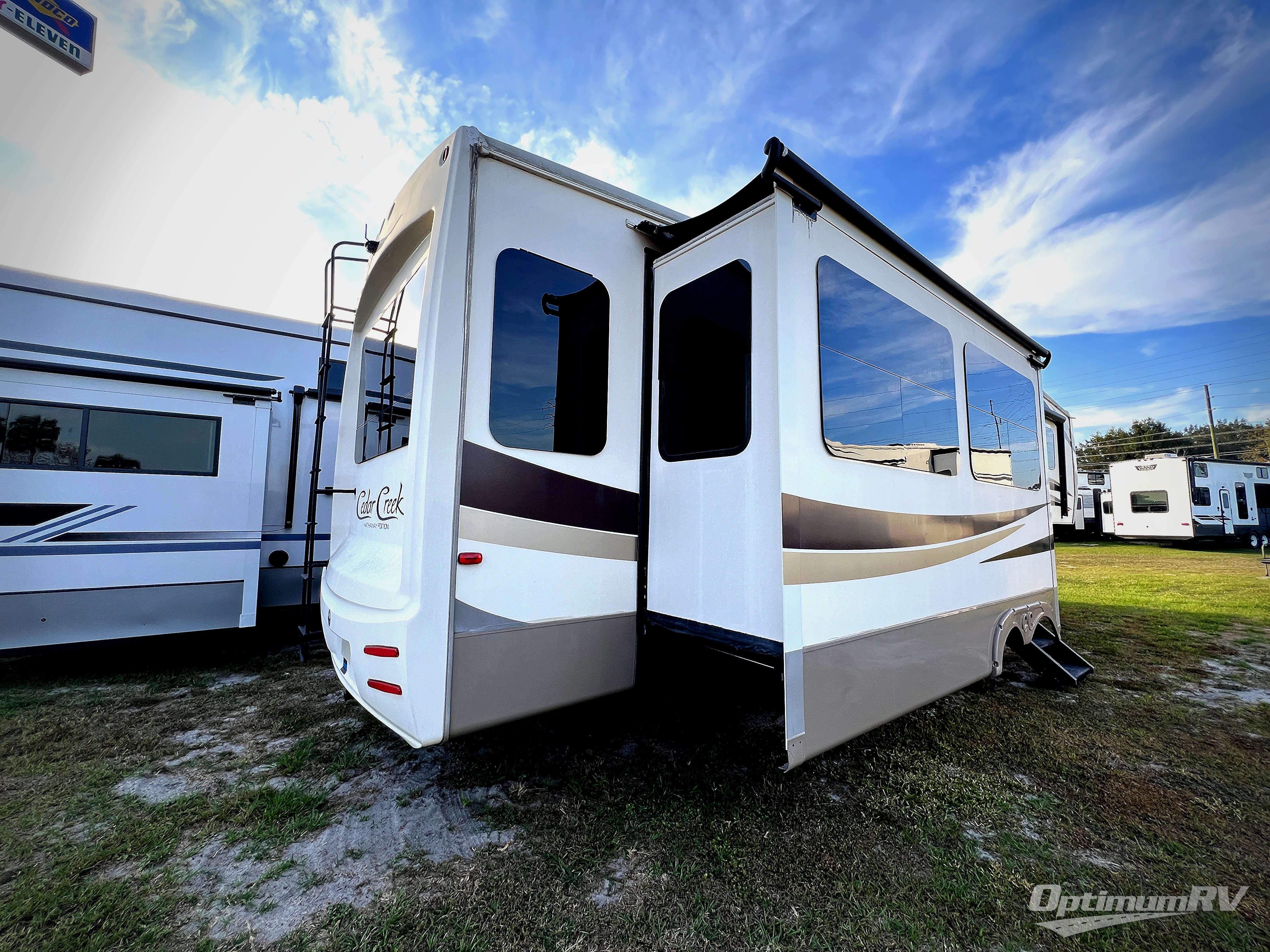 With any Forest River Cedar Creek Hathaway Edition fifth wheel you will find Nev-R-Adjust brakes which allow for improved stopping power in half the distance. There is also an E-Z Lube rubber equalization system and E-Z Lube heavy duty axles. In the bedroom you will find extra wide mirrored closet doors plus a walk-in closet and the radius ceilings give added headroom. The kitchen is everything that you would expect to find and more from the stainless steel 30" over the range microwave, to the recessed stainless steel large oven, you won’t be disappointed! If you prefer a bit more conveniences throughout then you will enjoy the Hathaway Edition Package which includes a 36" fireplace with remote and storage, solid surface LG counter tops with an oversized stainless steel sink, Congoleum Carefree designer flooring, On Demand hot water heater, and so much more!