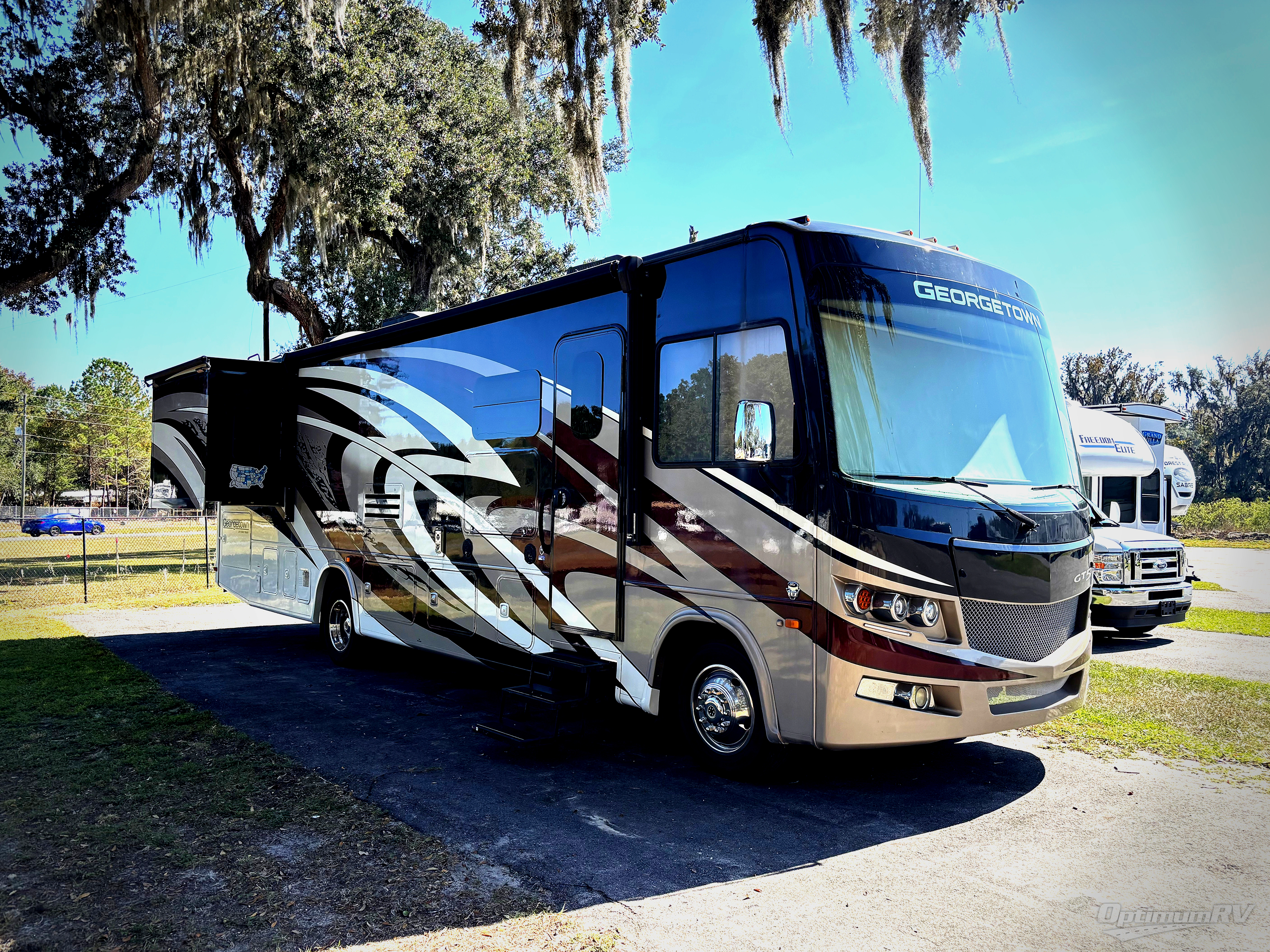 For comfort and style you will want a Forest River Georgetown 5 Series GT5 class A motor home. Along the exterior there is a "Super Storage" rear cargo compartment, an outside shower, as well as a stylish fiberglass front cap with lighted logo, LED accent lights and automotive bonded front windshield. As you step inside be prepared to be wowed from the stainless steel three-burner cooktop with oven to the solid surface countertops. In the cockpit there is a custom dash with ABS side consoles, drink holdrers, and a 110V outlet/USB. You will also enjoy the convenience of the MyRV touchscreen with wireless technology and more!