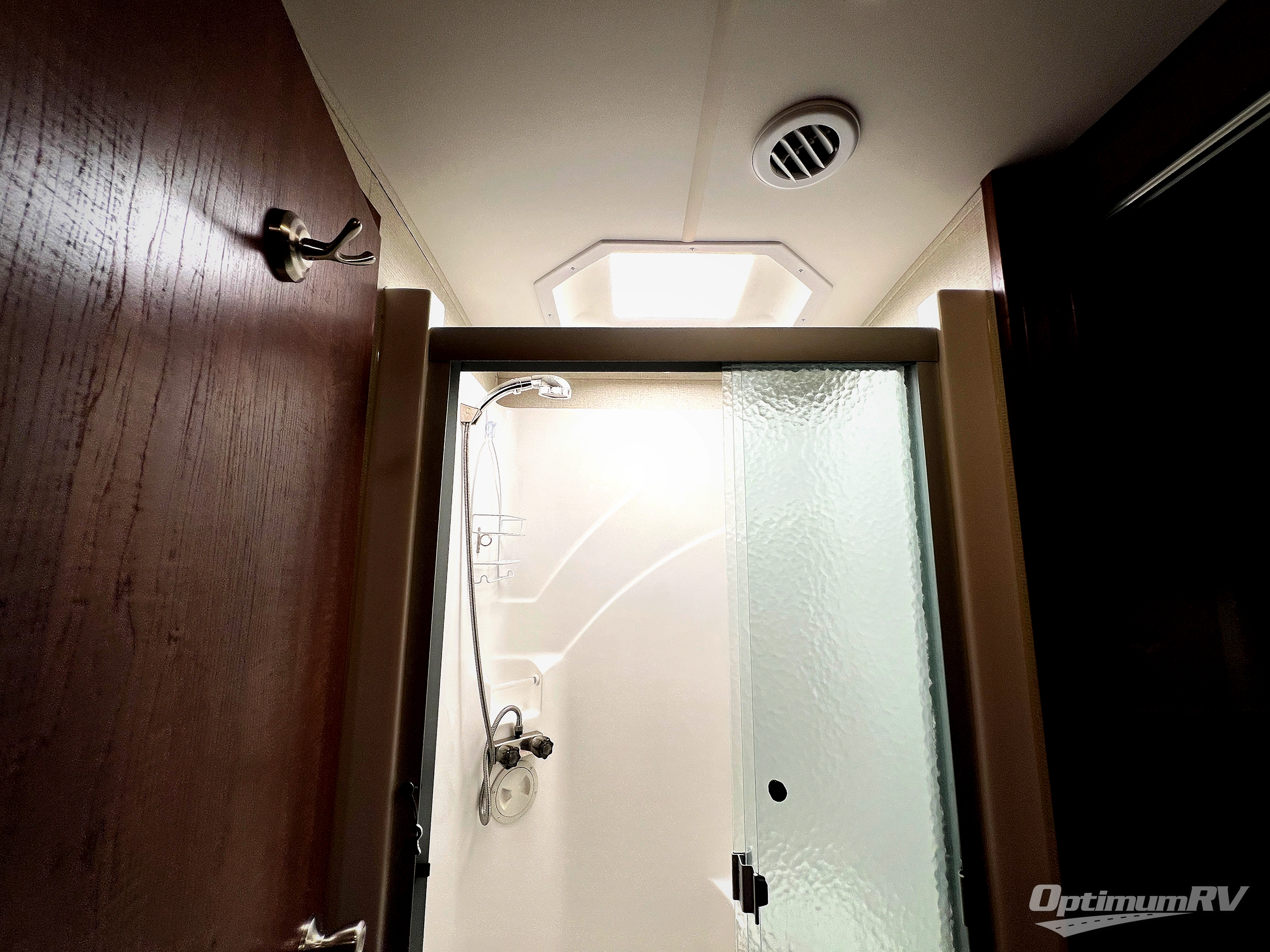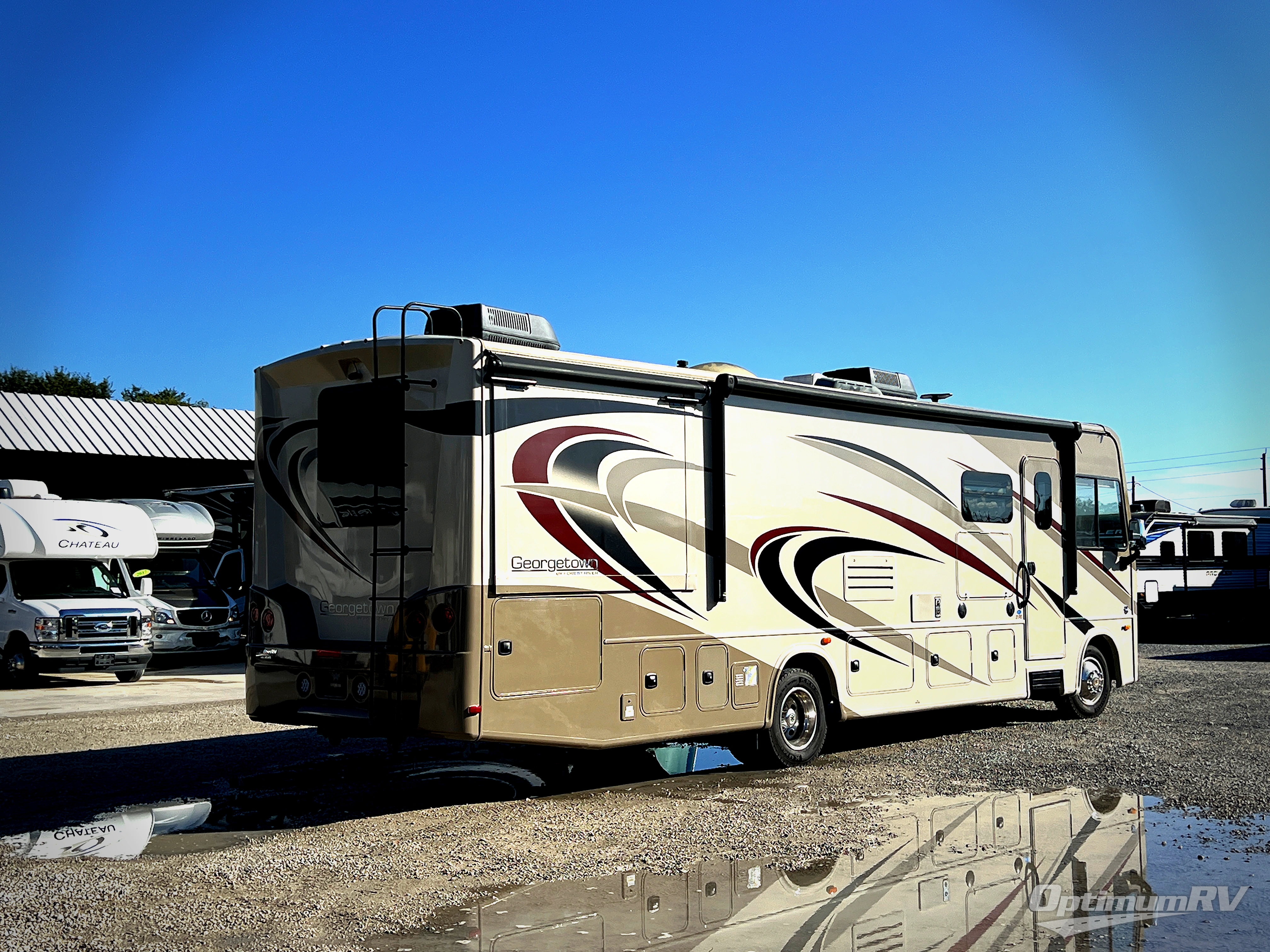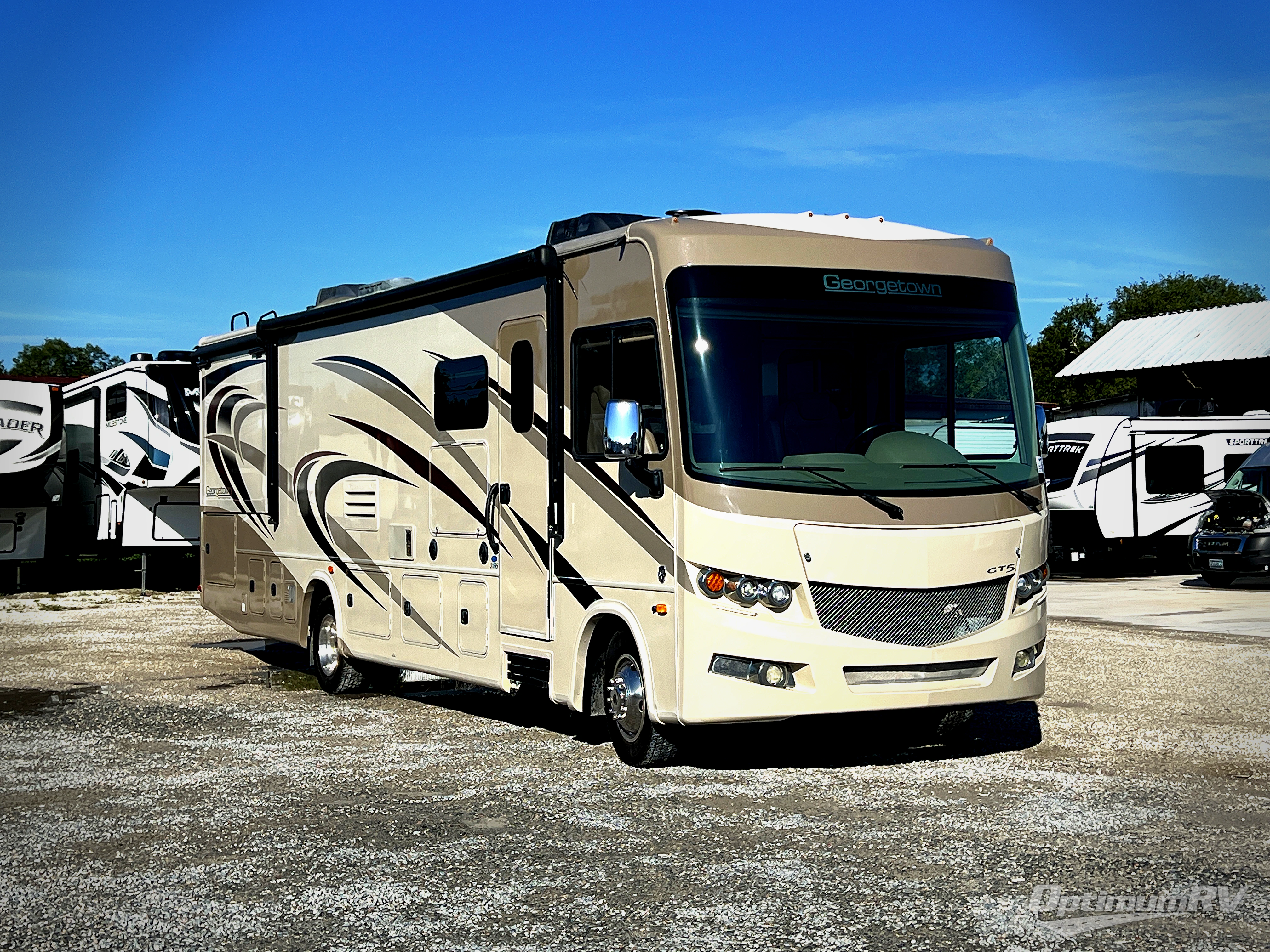 For comfort and style you will want a Forest River Georgetown 5 Series GT5 class A motor home. Along the exterior there is a "Super Storage" rear cargo compartment, an outside shower, as well as a stylish fiberglass front cap with lighted logo, LED accent lights and automotive bonded front windshield. As you step inside be prepared to be wowed from the stainless steel three-burner cooktop with oven to the solid surface countertops. In the cockpit there is a custom dash with ABS side consoles, drink holdrers, and a 110V outlet/USB. You will also enjoy the convenience of the MyRV touchscreen with wireless technology and more!