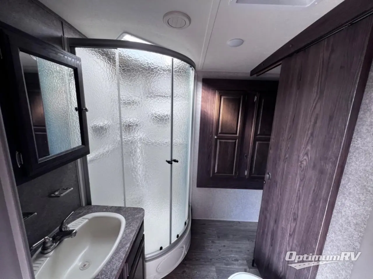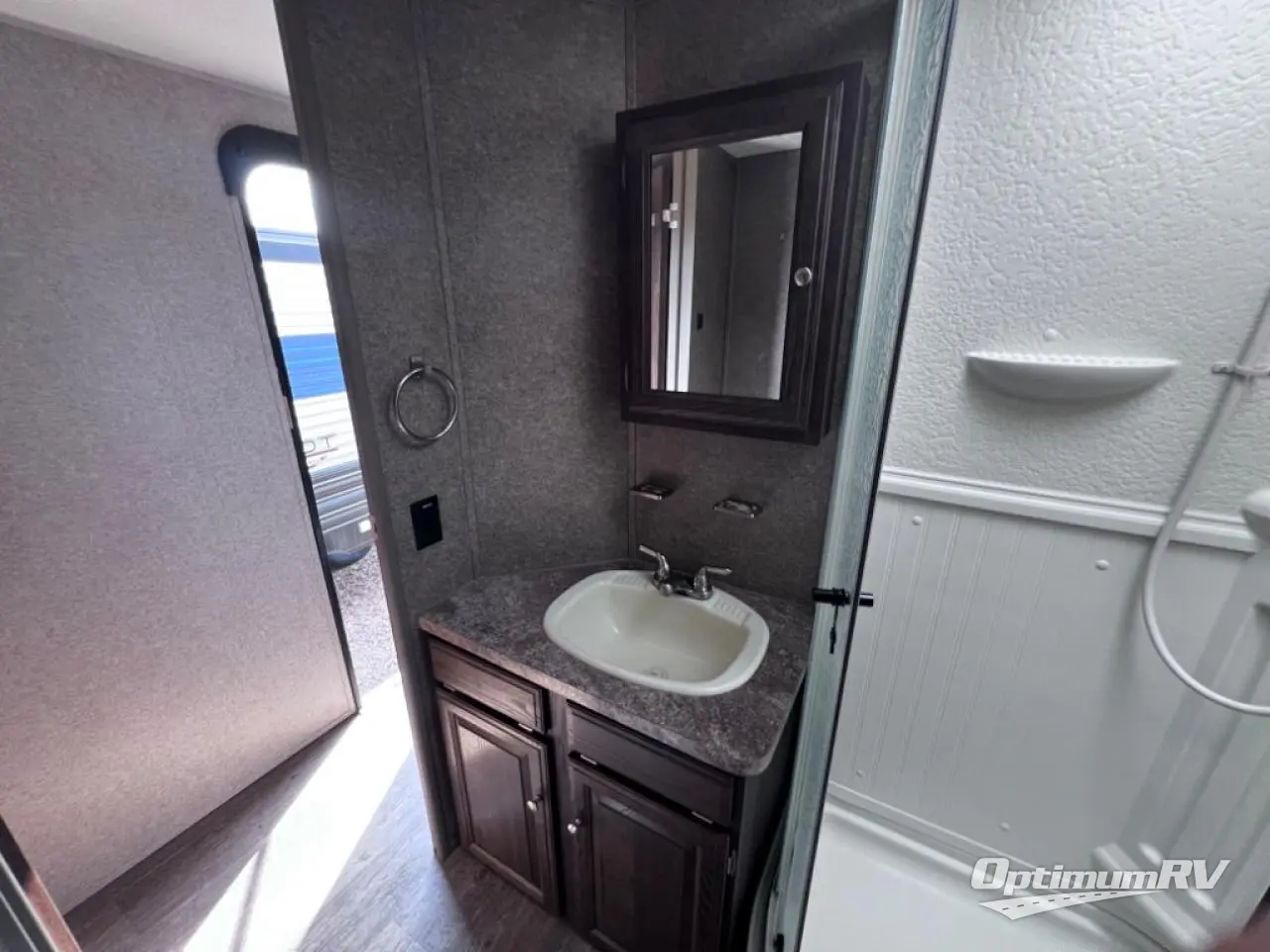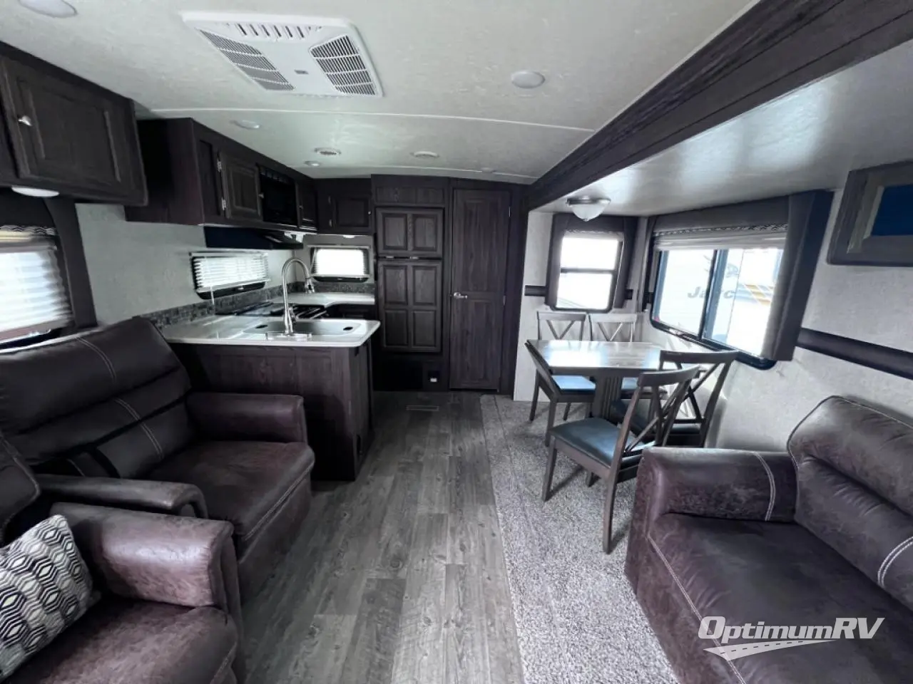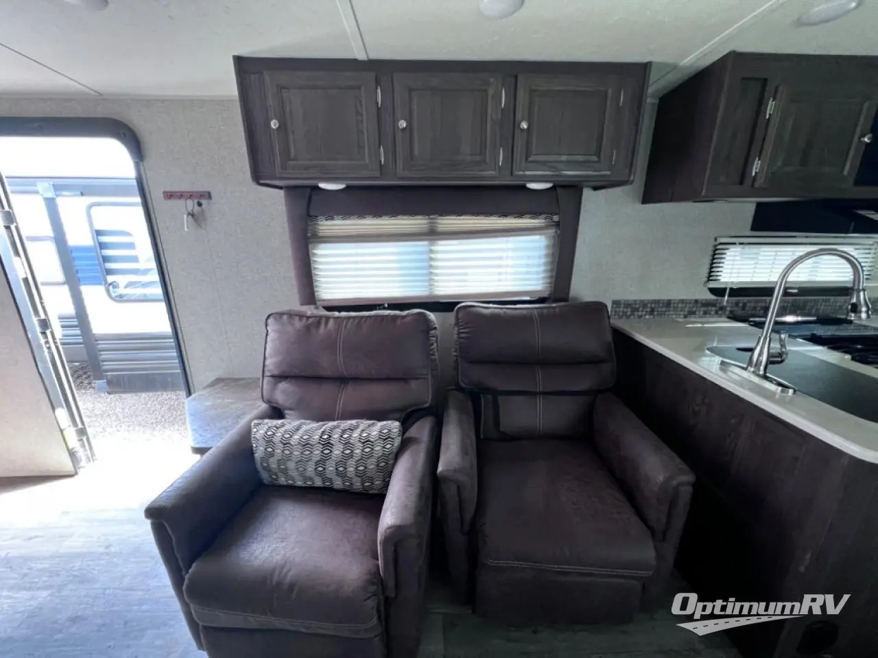 In this Rockwood Ultra Lite travel trailer model 2902WS notice how convenient the full bath is located almost directly across from the door. There is even a second sliding entry door within the bathroom leading to the front master bedroom. In the kitchen, cooking up light meals and snacks is quite easy with everything provided. On the outside enjoy an awning that provides a bit of protection from the elements so you can enjoy a little outdoor living space. There is even a gas grill, an optional rear ladder, plus so much more!