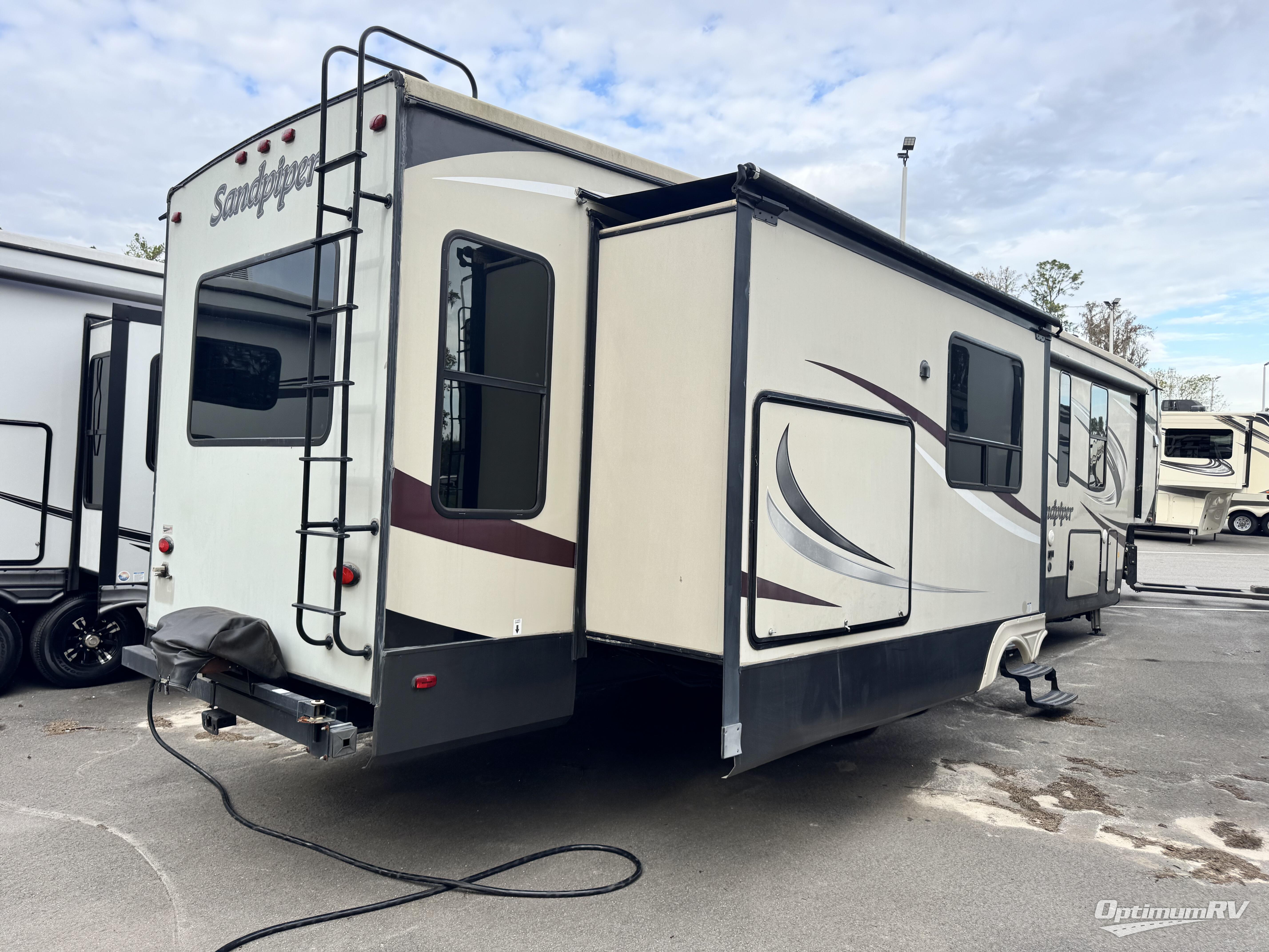When you choose to camp with a Sandpiper fifth wheel by Forest River you are choosing a quality built fifth wheel with plenty of features and comforts to go around. Along the exterior there are large tinted windows, a "One Touch" Dometic electric awning with an LED light strip, 2 LED lighted exterior speakers, plus a docking station for easy winterization, hot and cold spray port, black tank flush, and pull valves for the tanks. Inside there is Beauflor rustic wood plank linoleum, a decorative backsplash, a 40" flat screen LED HDTV, plus a 9 cu. ft. stainless refrigerator. You can also choose from a few optional packages such as the Polar Tech Package, the Premium Package Plus which is offered for a limited time, and the Sandpiper Signature Package.