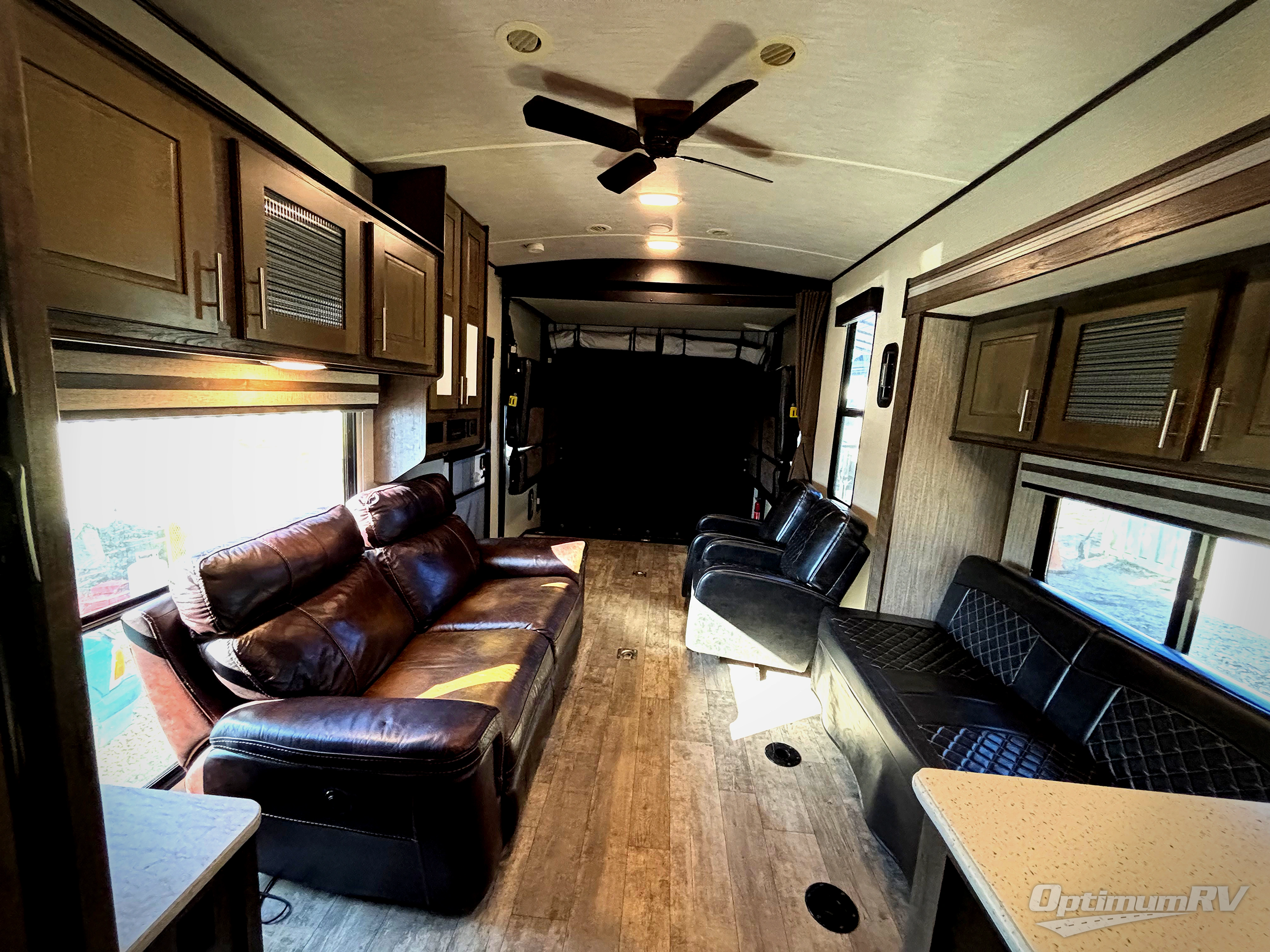 This dual entry/exit toy hauler travel trailer is something to take a look at if you are in the market for a nice large garage area for towing your toys. With up to 16' of garage space you will be able to fit a toy or two in there while you are on the road. Once you are parked and they are unloaded, you have dual opposing sofas with a dinette table in the middle that you can use for eating meals, playing games, or just relaxing. Mom and dad will have a good night's rest on the king sized bed in the private front bedroom that has a private entry door into the bathroom for convenience. There is also plenty of space for cooking up meals and cleaning up afterward.