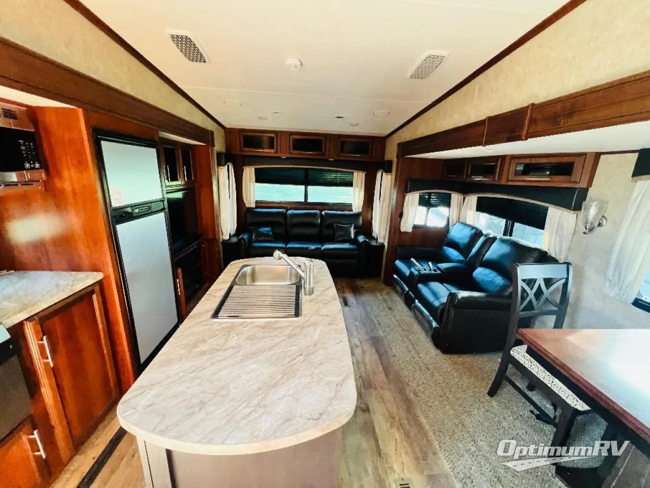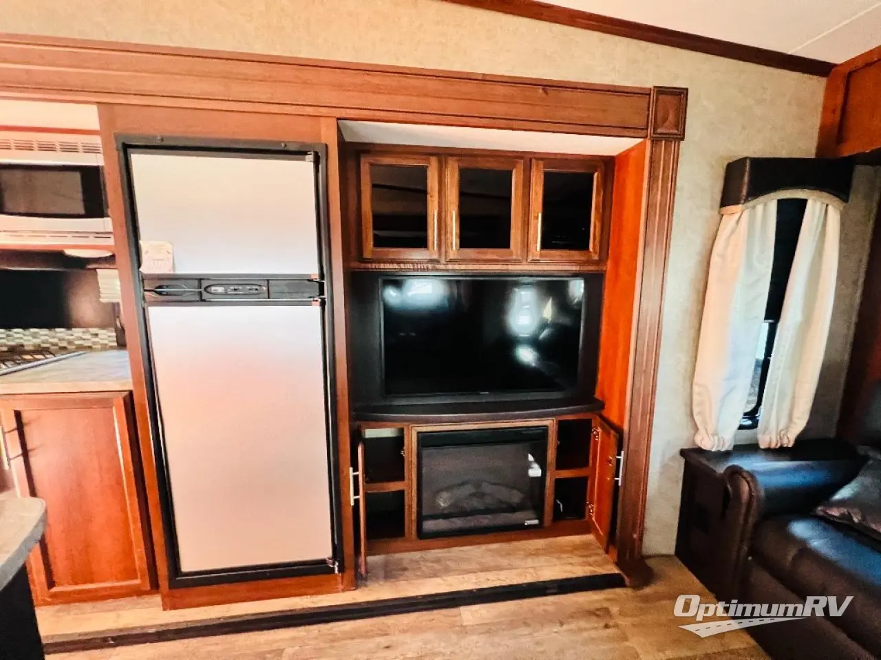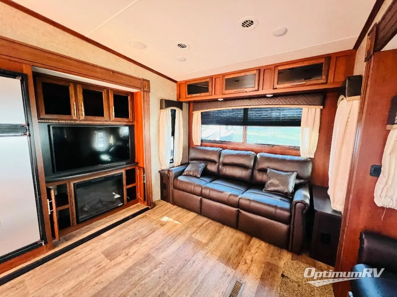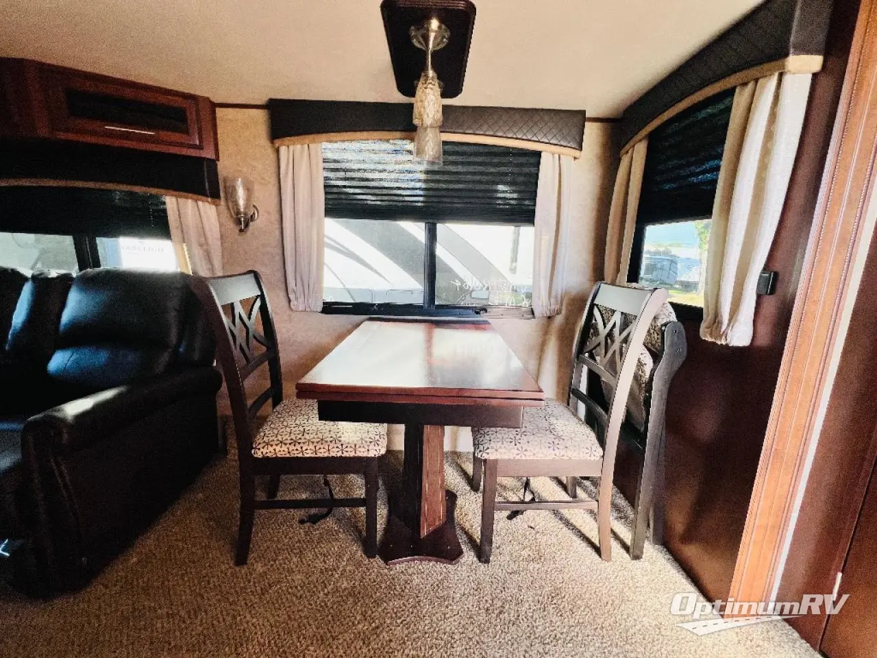 Come see just how fun and easy camping can be with your family when you choose to camp with this triple slide out Eagle HT 28.5RSTS fifth wheel. In the rear living area you will find a tri-fold sofa plus two end tables. Within the slideout along the roadside there are two theater seats and across the room you will find an entertainment center with a 39" HDTV plus you can add an optional fireplace. The island features a double sink plus extra counter space which is ideal for meal prep or clean up. The bedroom slide out has a window, dresser, wardrobe, and linen closet. Across the room there is another window which allows for cross-ventilation plus plenty of natural light. In the evening you will want to visit with family and friends while relaxing under the 14' electric awning with LED lights.