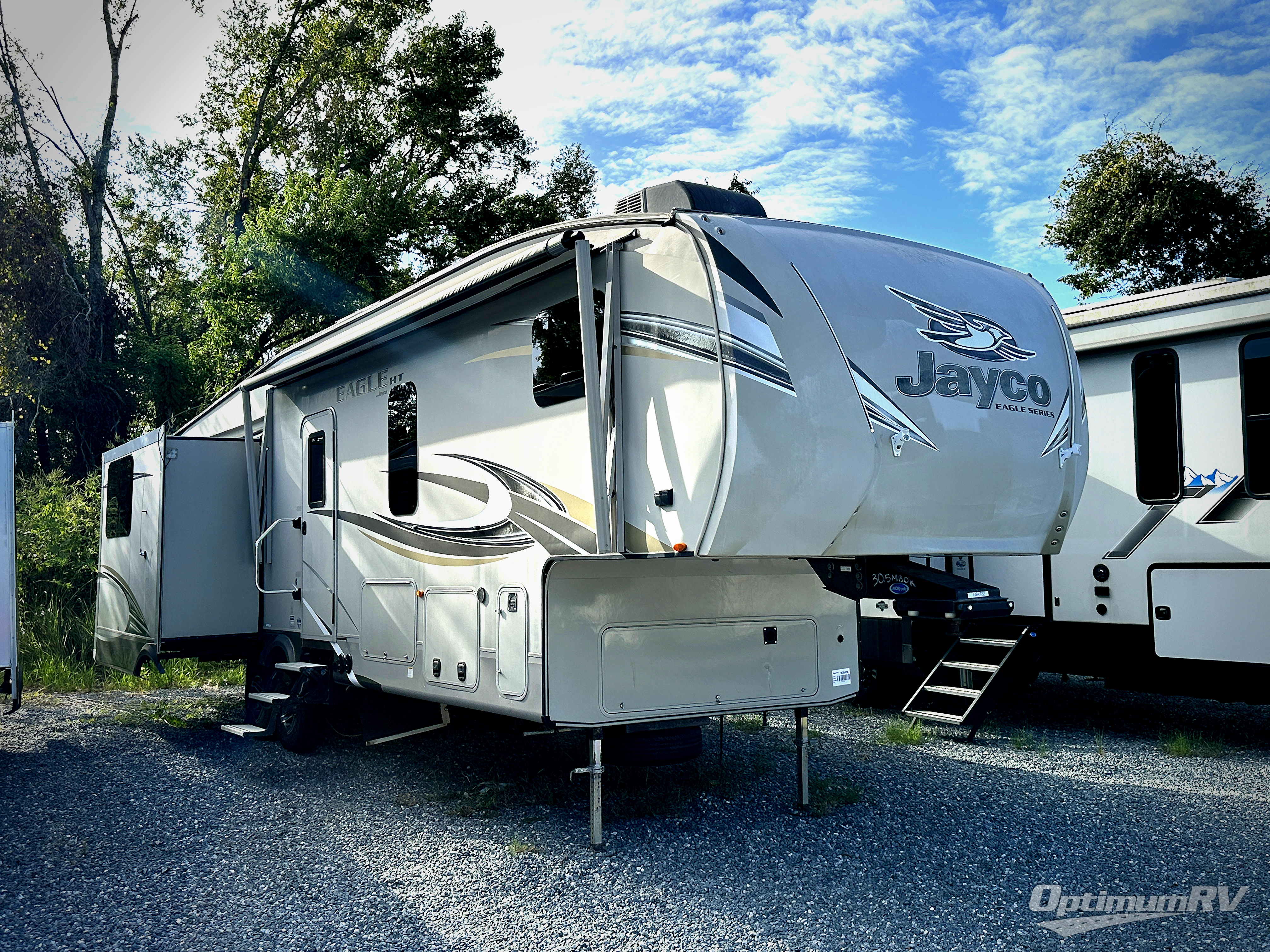 For any camping trip you will want an Eagle HT fifth wheel by Jayco. Along the exterior there is a high-gloss, fiberglass front cap with built-in specialty LED lighting. Inside each model there are handcrafted Sugar Maple glazed drawers. Throughout each model there is Shaw residential carpet with a sound dampening carpet pad plus IVC Trekk wood-plank vinyl flooring. The industry exclusive HELIX cooling system is an added bonus with the Jayco-exclusive insulated duct design, directional and closeable A/C vents, larger return air vents, and the exterior-mounted 15,000-BTU Whisper Quiet A/C unit. The Customer Value Package includes a residential queen Simmons mattress with under-bed storage, an electric patio awning with integrated LED lights, MOR/ryde CRE/3000 rubberized suspension for a smoother ride, a rain proof EZ Breeze bathroom power vent, an industry first Go Power rooftop and ground solar prep, and so much more!