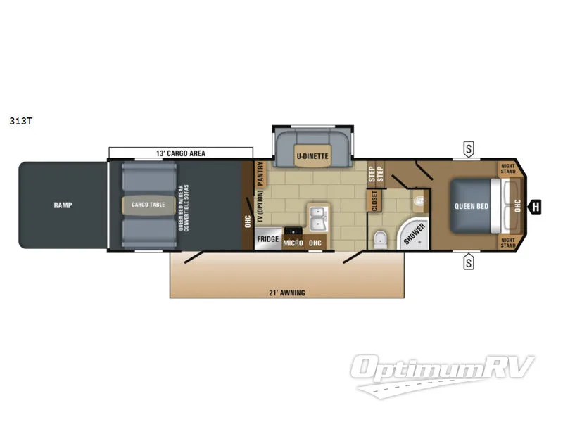 The best feature of this Jayco toy hauler is definitely the versatile garage area. The 2,500 LB capacity ramp allows you to tow along even the heaviest of outdoor accessories during the day, and the convertible sofa beds and pull-down ramp door screen allow you to have a lounge and relaxation area each night. During those cool summer evenings when the night sky shines its brightest, you can sit with friends on the enclosed ramp or take the party outdoors underneath the electric awning lined with LED lighting. The included lockable and insulated storage doors are a part of the Keyed Alike single key system which means that you only need to worry about one key for the entire unit, and the 16" tires that this toy hauler is built upon are a part of the American-made Goodyear brand.