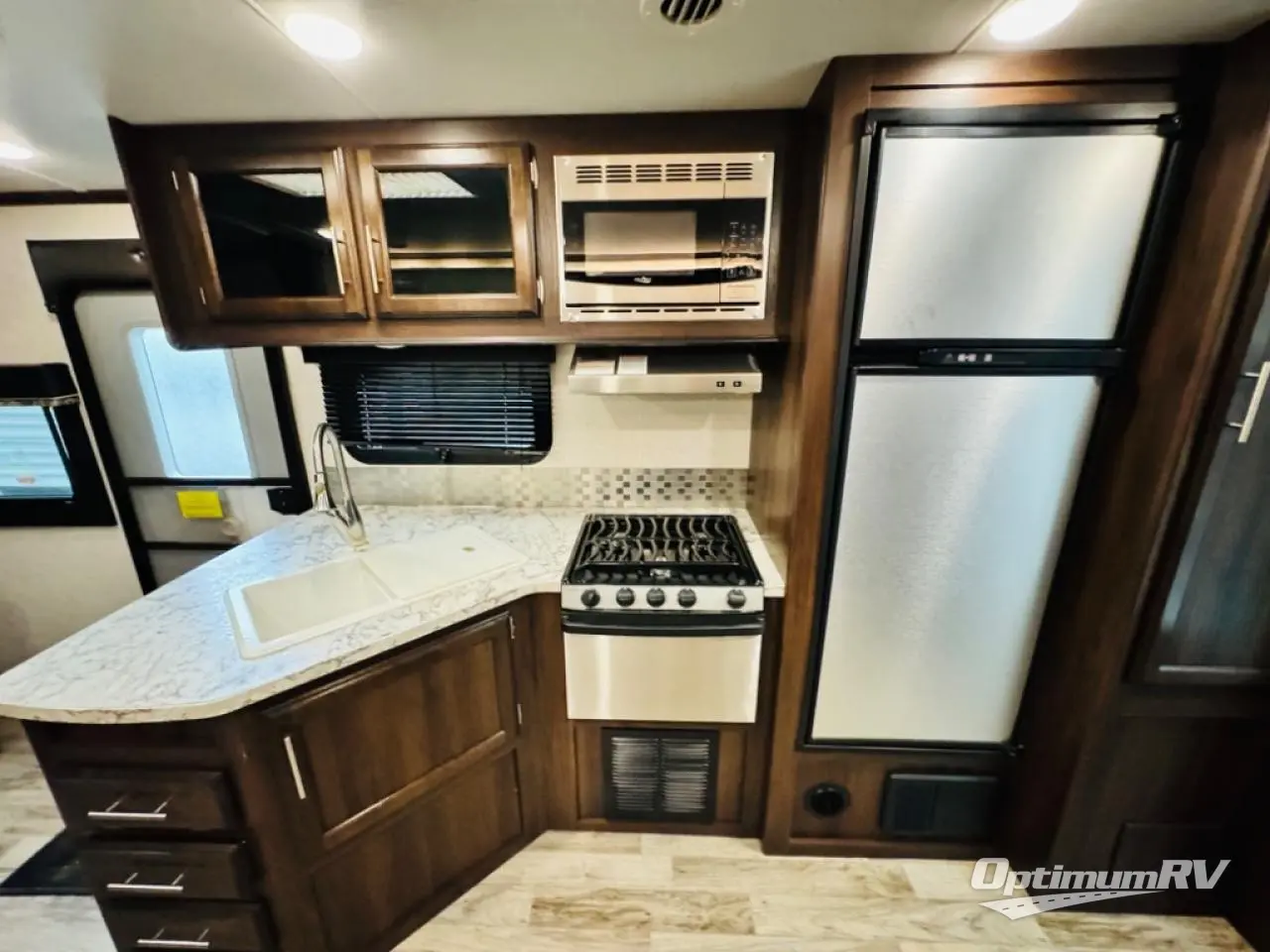 This White Hawk travel trailer is a wonderful addition to any family who is looking for an RV that delivers style and reliability. The residential appliances allow you to cook and store dinner with ease, and in this unit, you aren't restricted to only cooking dinner indoors because you can take the entire party outside of the trailer to the outdoor kitchen. After a long night of fun underneath the 20' electric awning, you can rest comfortably indoors on the Murphy bed with the Jayco-exclusive Simmons mattress.