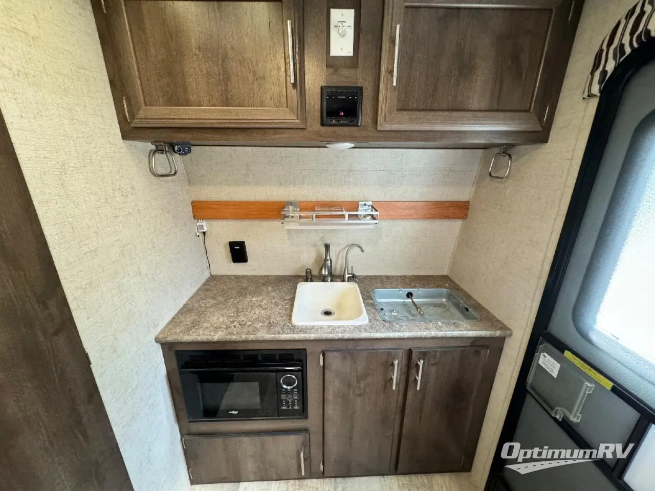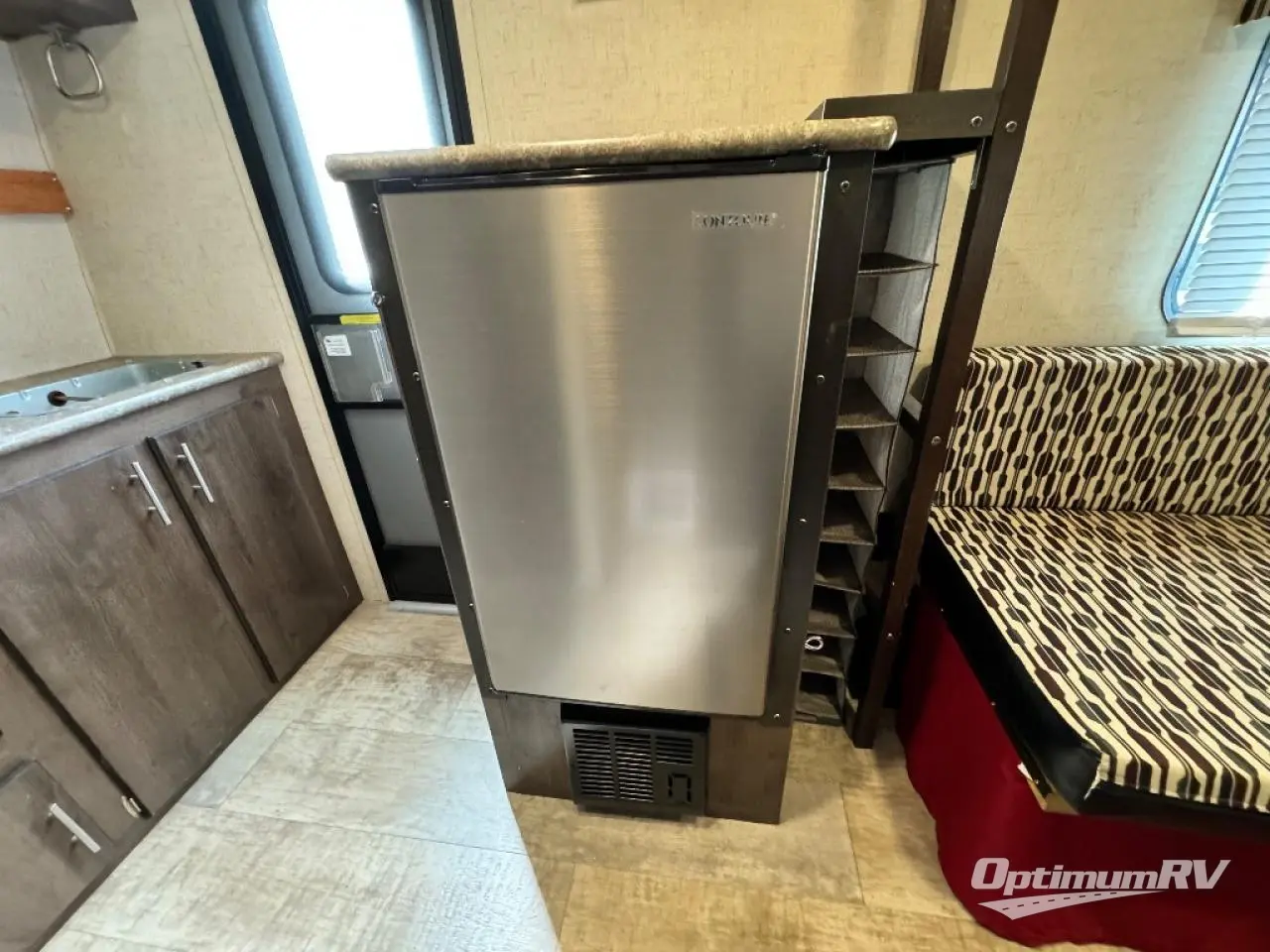 Along the front of the trailer there is a two burner gas hot plate, counter space, and a sink. To the left of the entrance there is a refrigerator and TV.