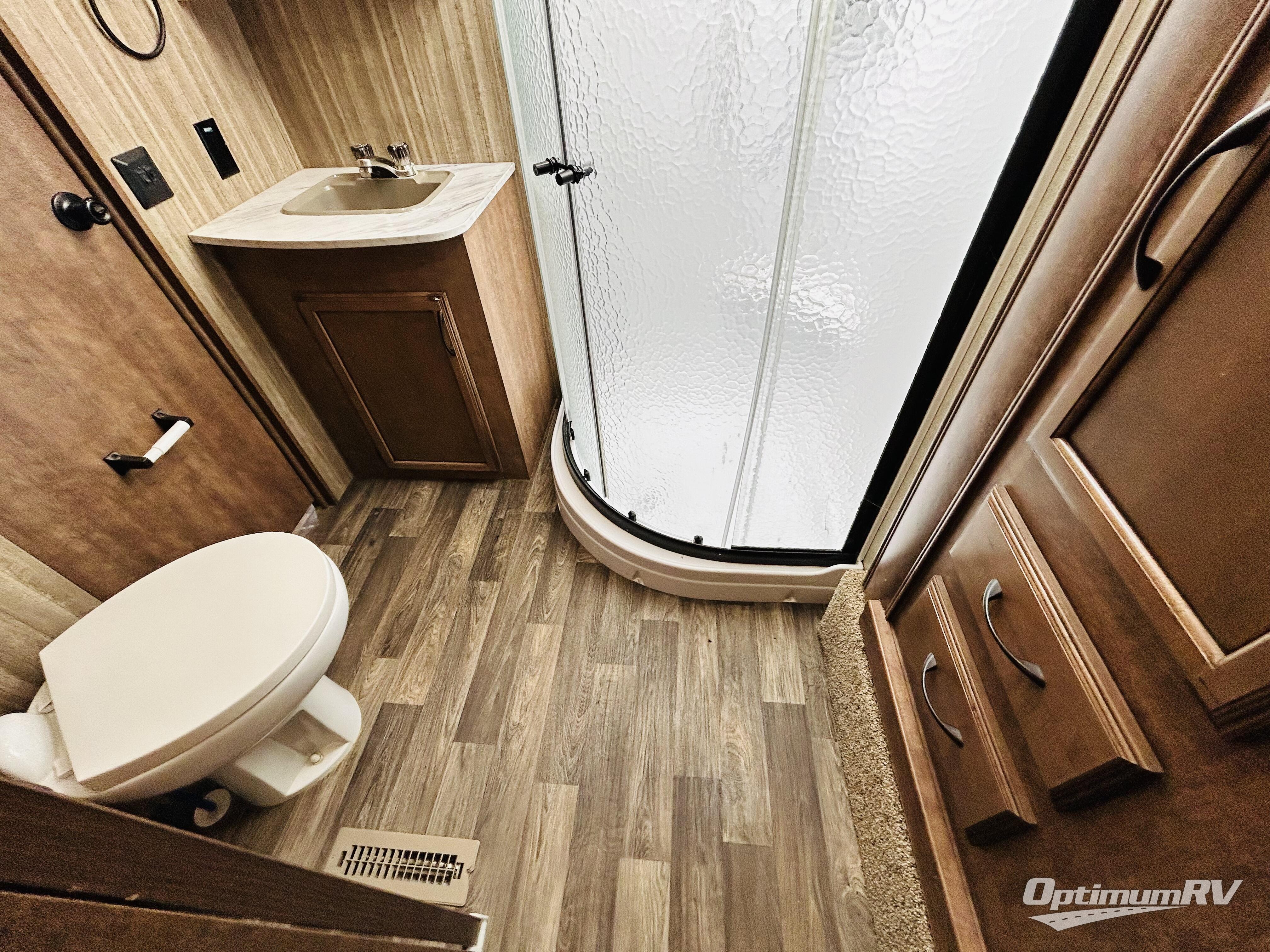 Head up the steps to the right of the main entry and find a side aisle bath including a corner shower, toilet, and vanity with sink. Within the slide out that extends into the bedroom there is a linen cabinet. The second bath entry door slides open to allow access into the front bedroom.