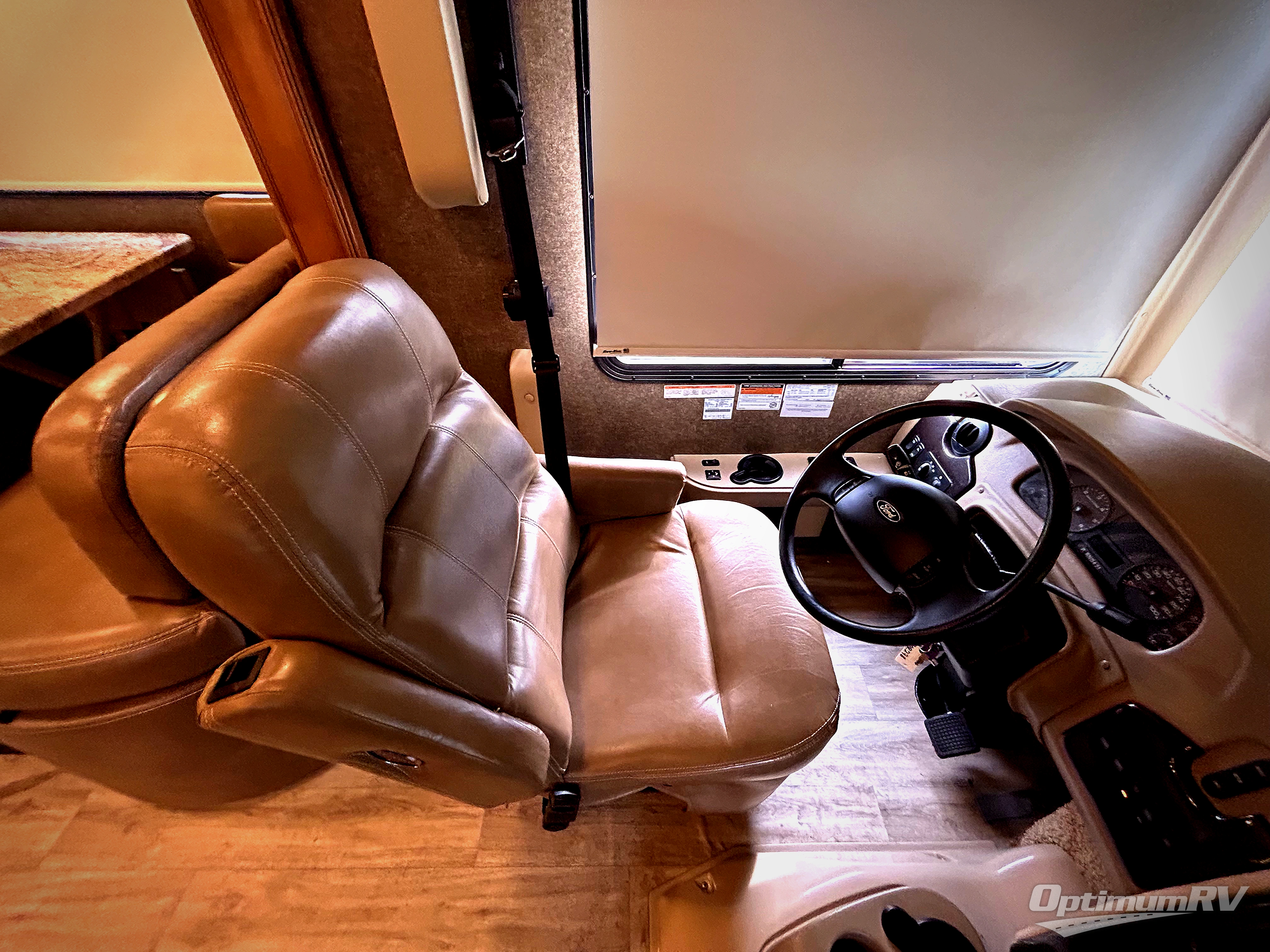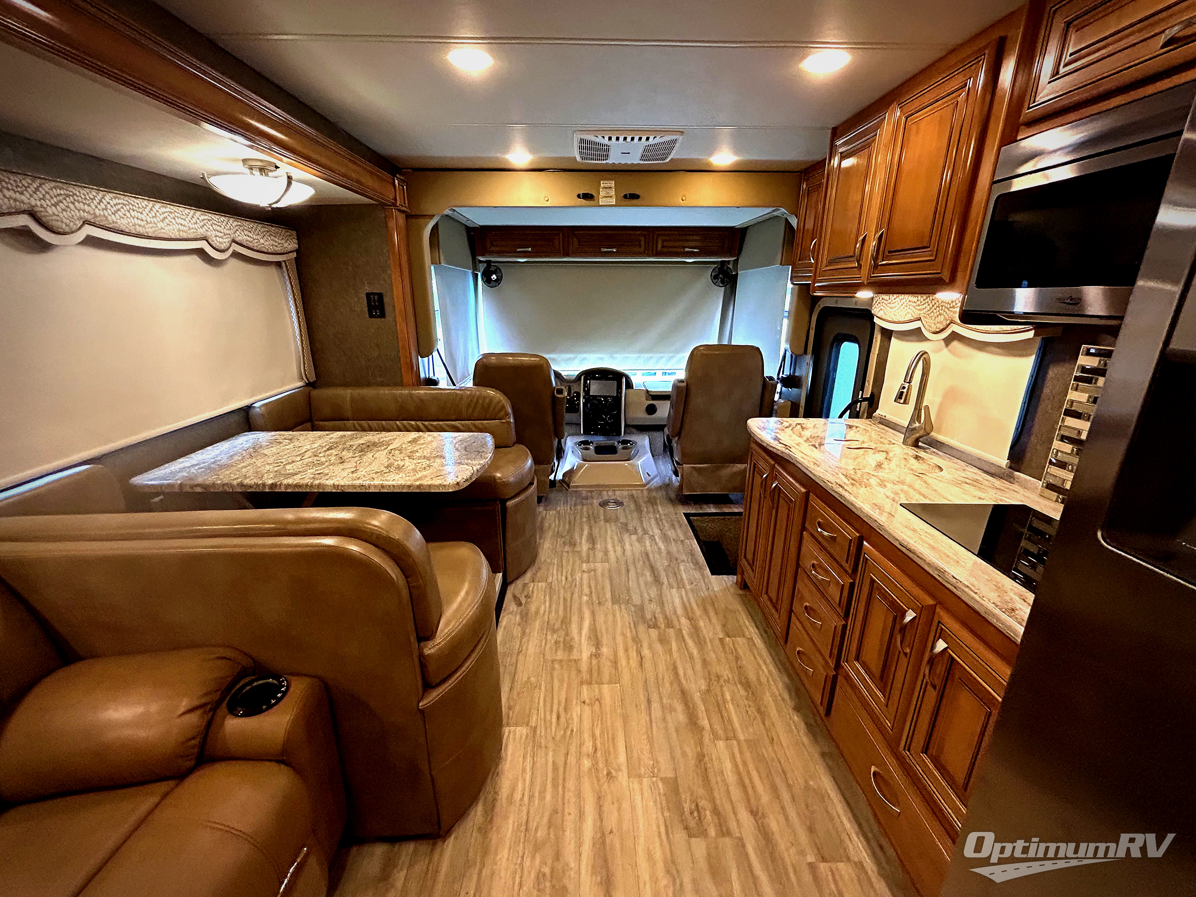 Back up front there is a coffee table between the two captain's chairs. You can even choose to lower the drop-down overhead bunk for more sleeping space if needed. If outside relaxing is something you enjoy, the 32" LED TV is located beside the entry door.