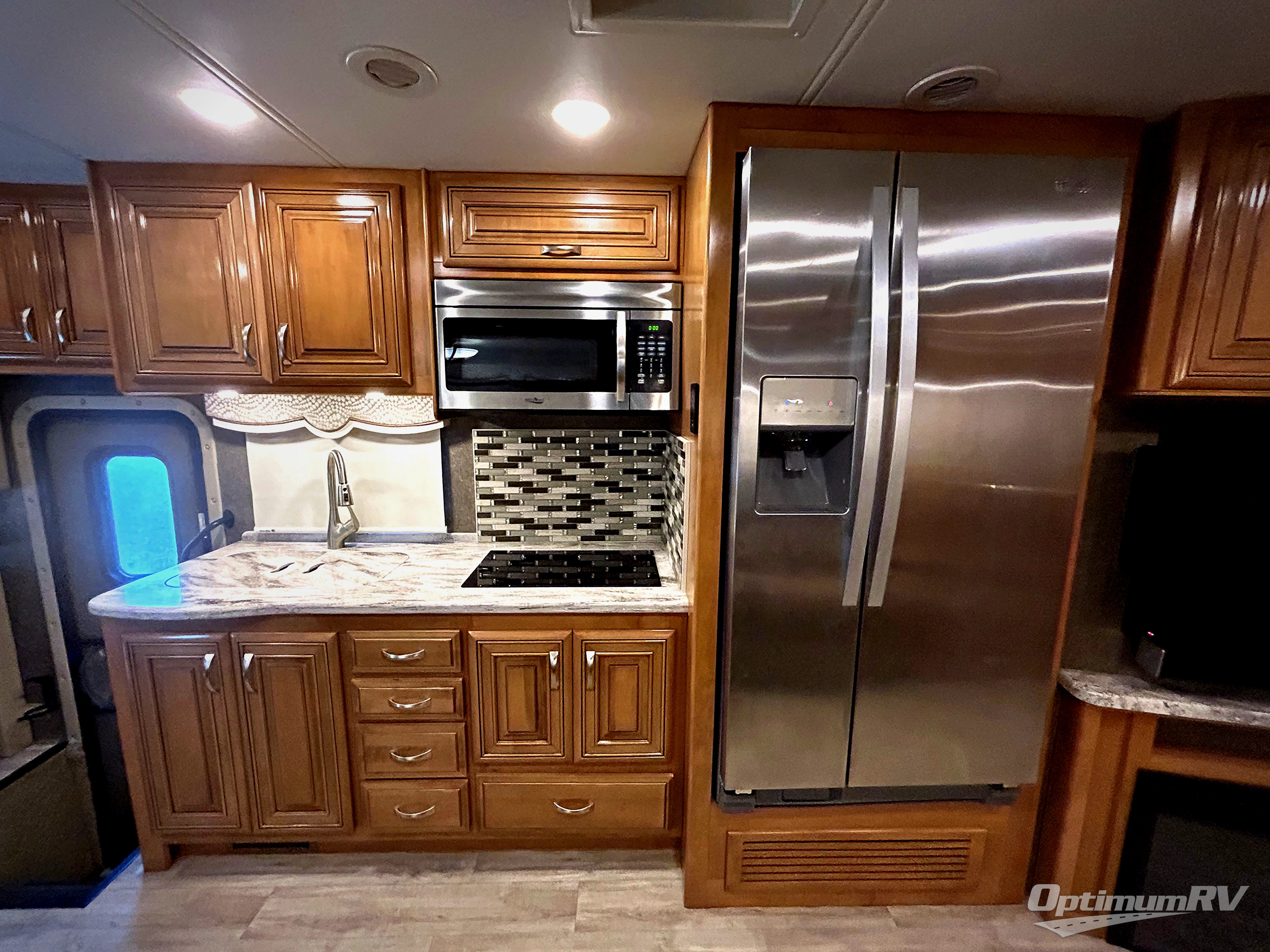 Along the door side you will find a double kitchen sink, two burner range with microwave oven above, and a residential refrigerator.