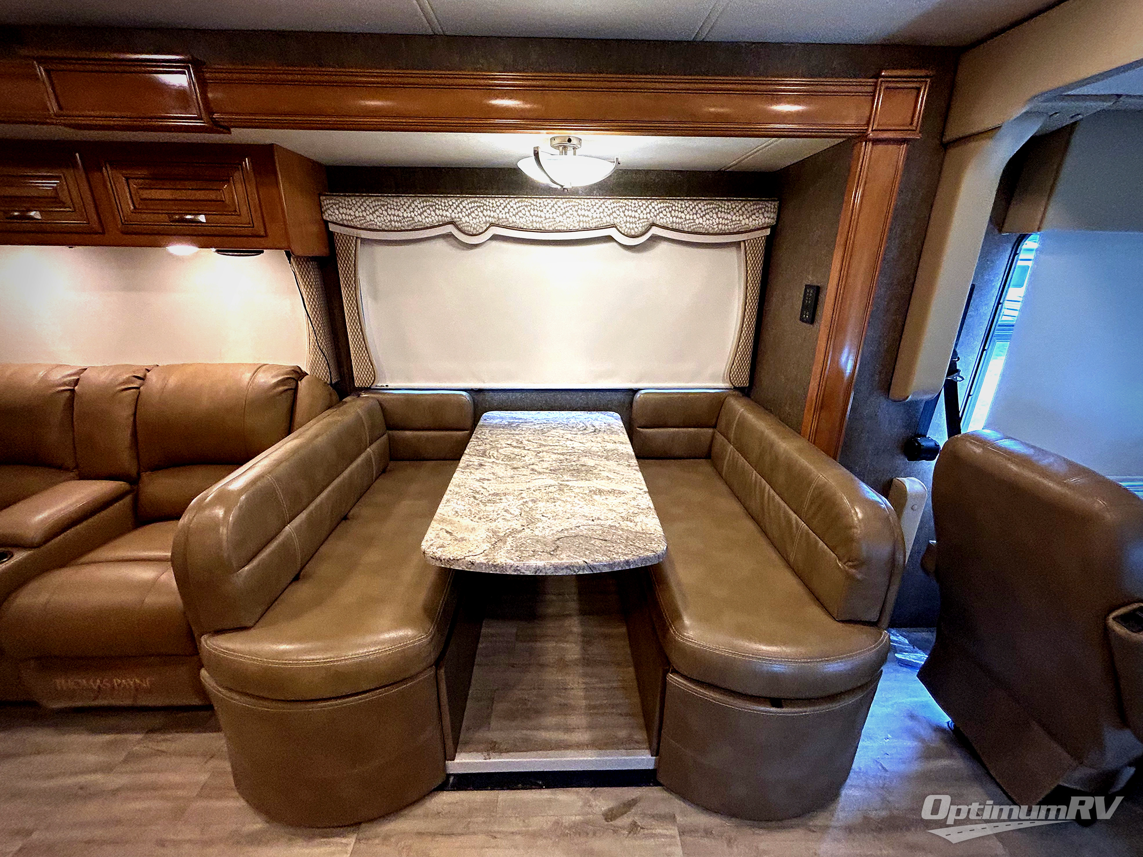 Step inside behind the passenger seat and see how spacious the interior is with the full wall slide fully extended on the roadside. The slide out includes a Dream Dinette booth for meal time, a sofa or optional theater seats, a closet that has also been prepped for a stackable washer and dryer, three additional closets, and a 32" LED TV above a dresser in the bedroom.
