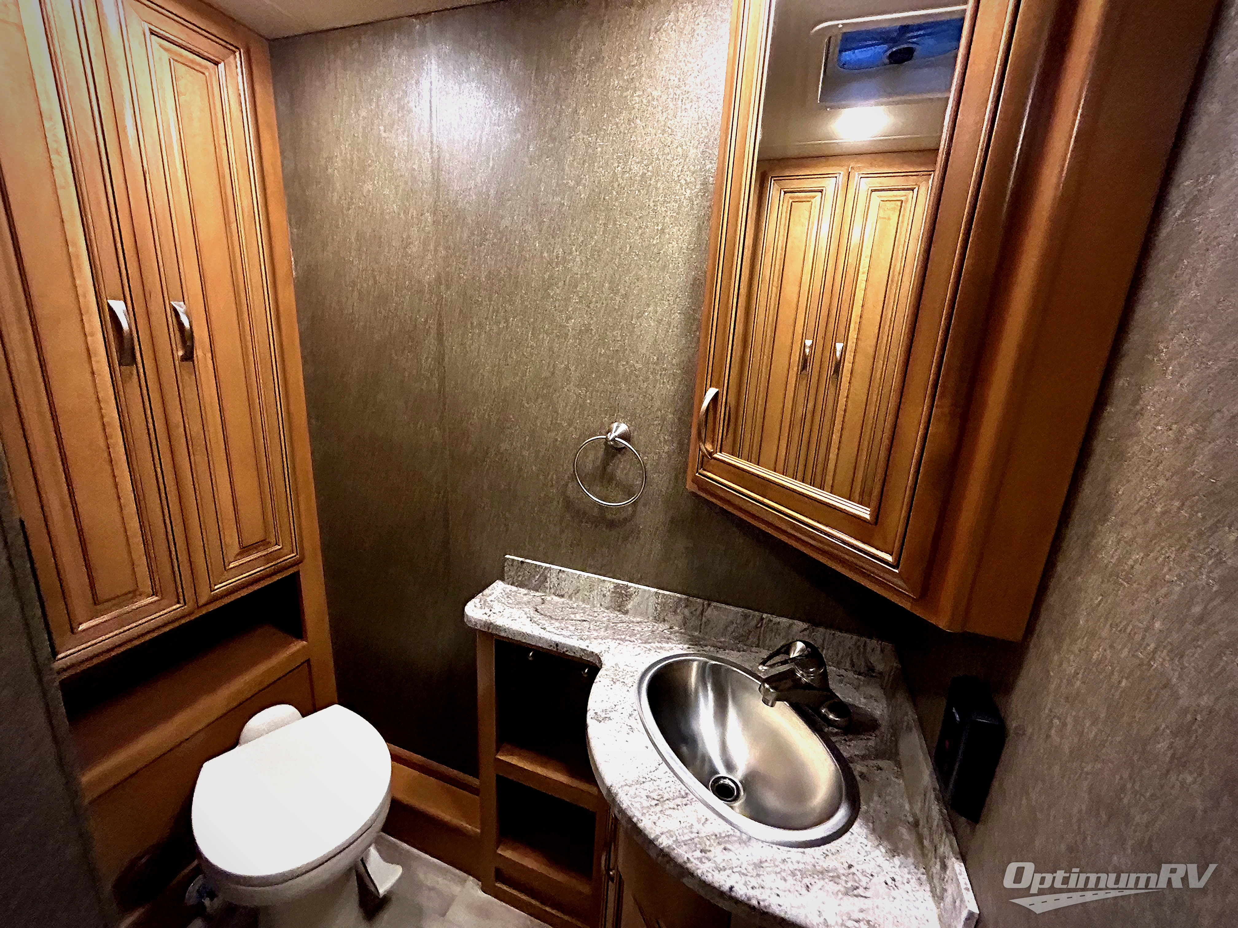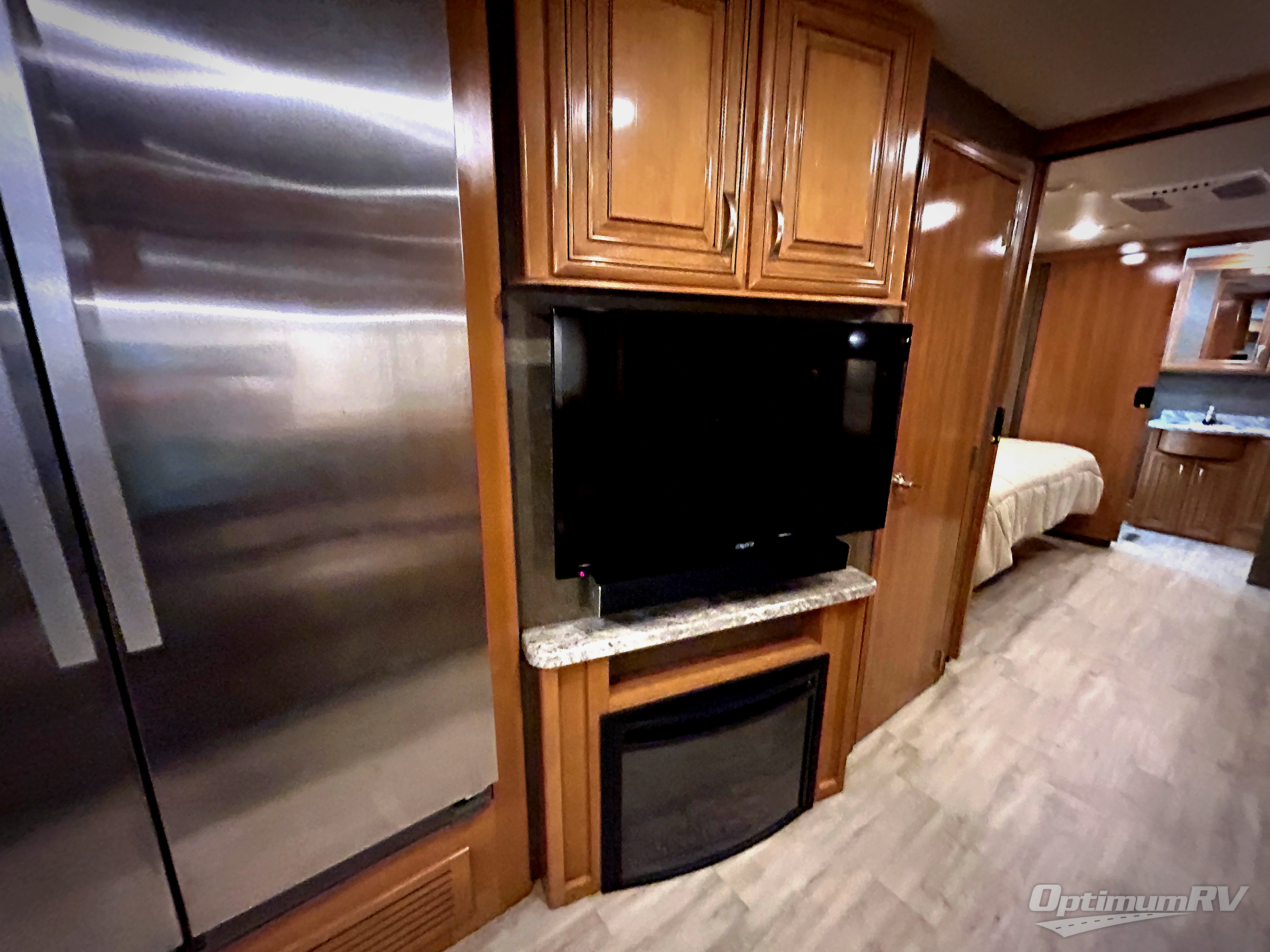 A half bath includes a toilet, linen storage, and a sink with vanity is located in the mid-section of the coach. There is a 40" LED TV along the outside bathroom wall mounted above a fireplace which includes a remote.