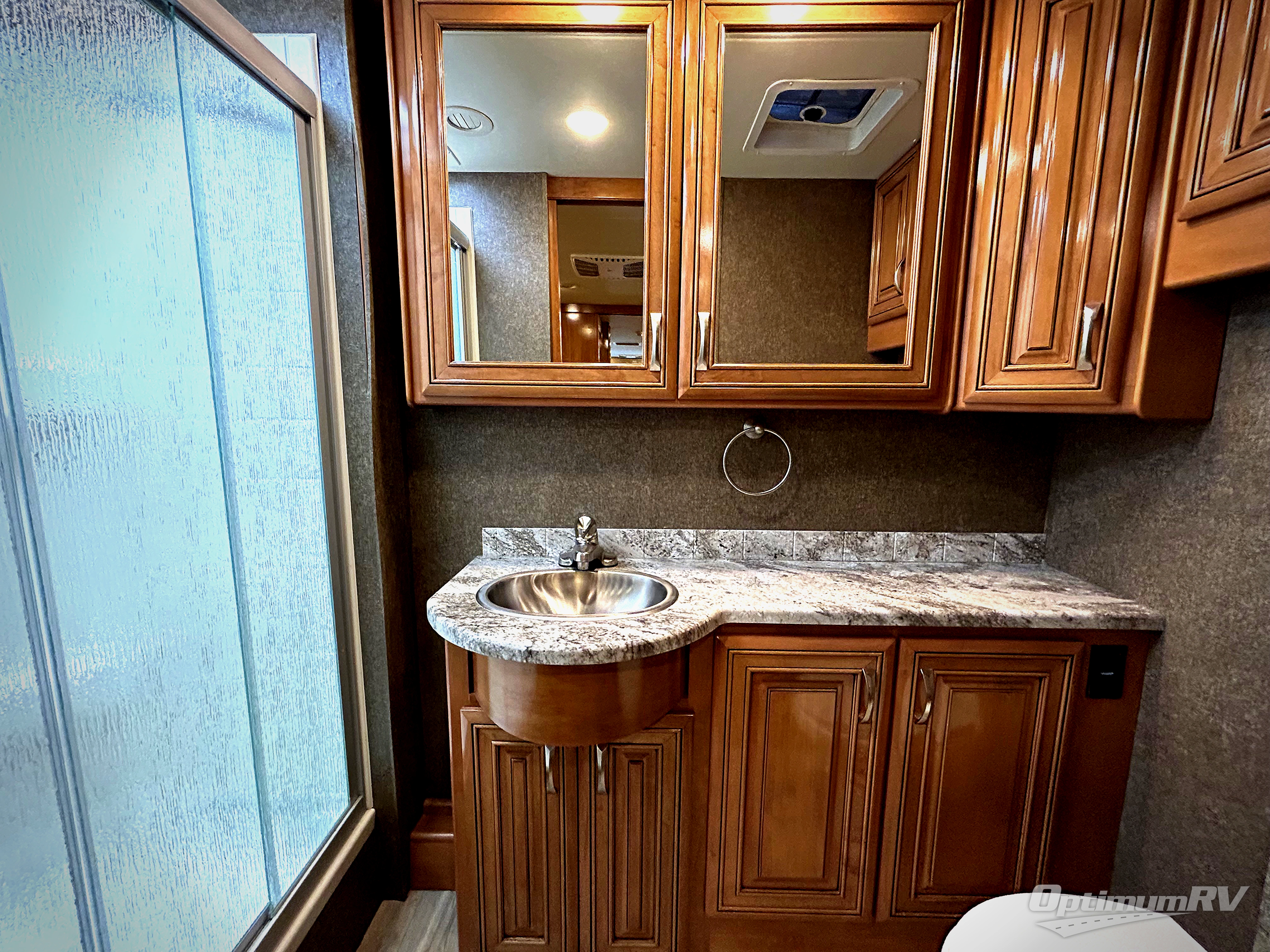 In the rear of the coach you will find a full bath with a toilet, a vanity sink, and a 36" x 30" shower.