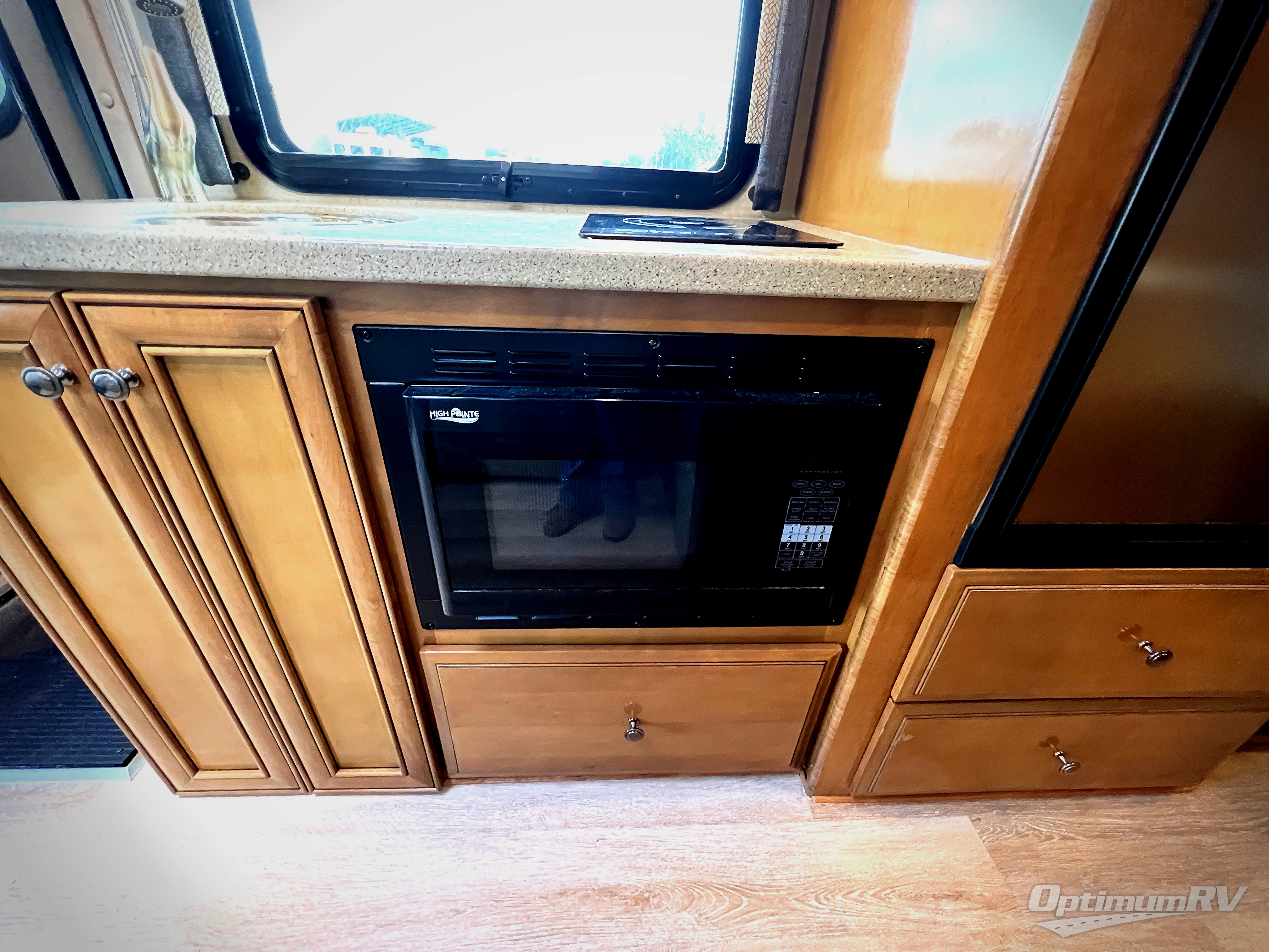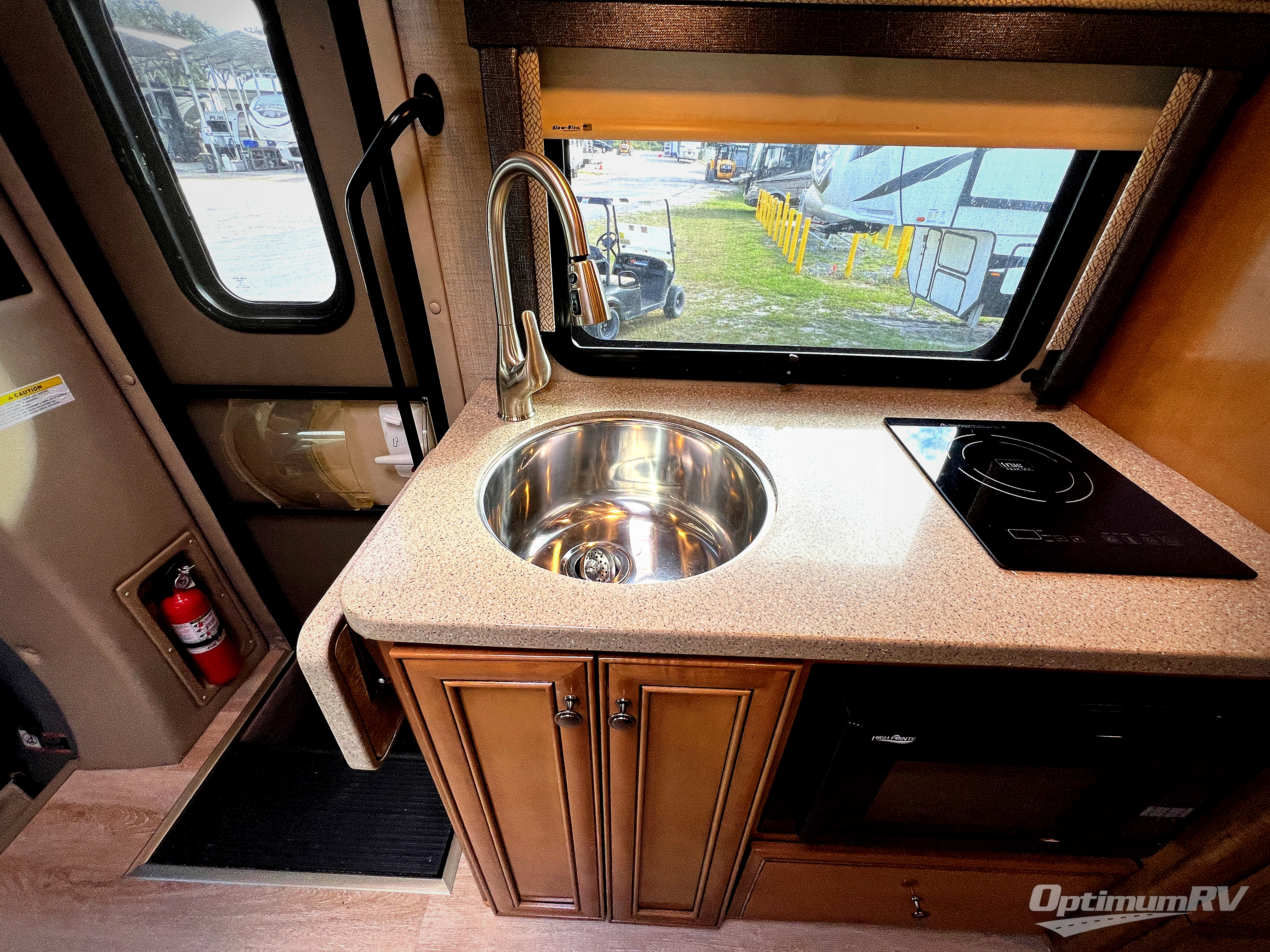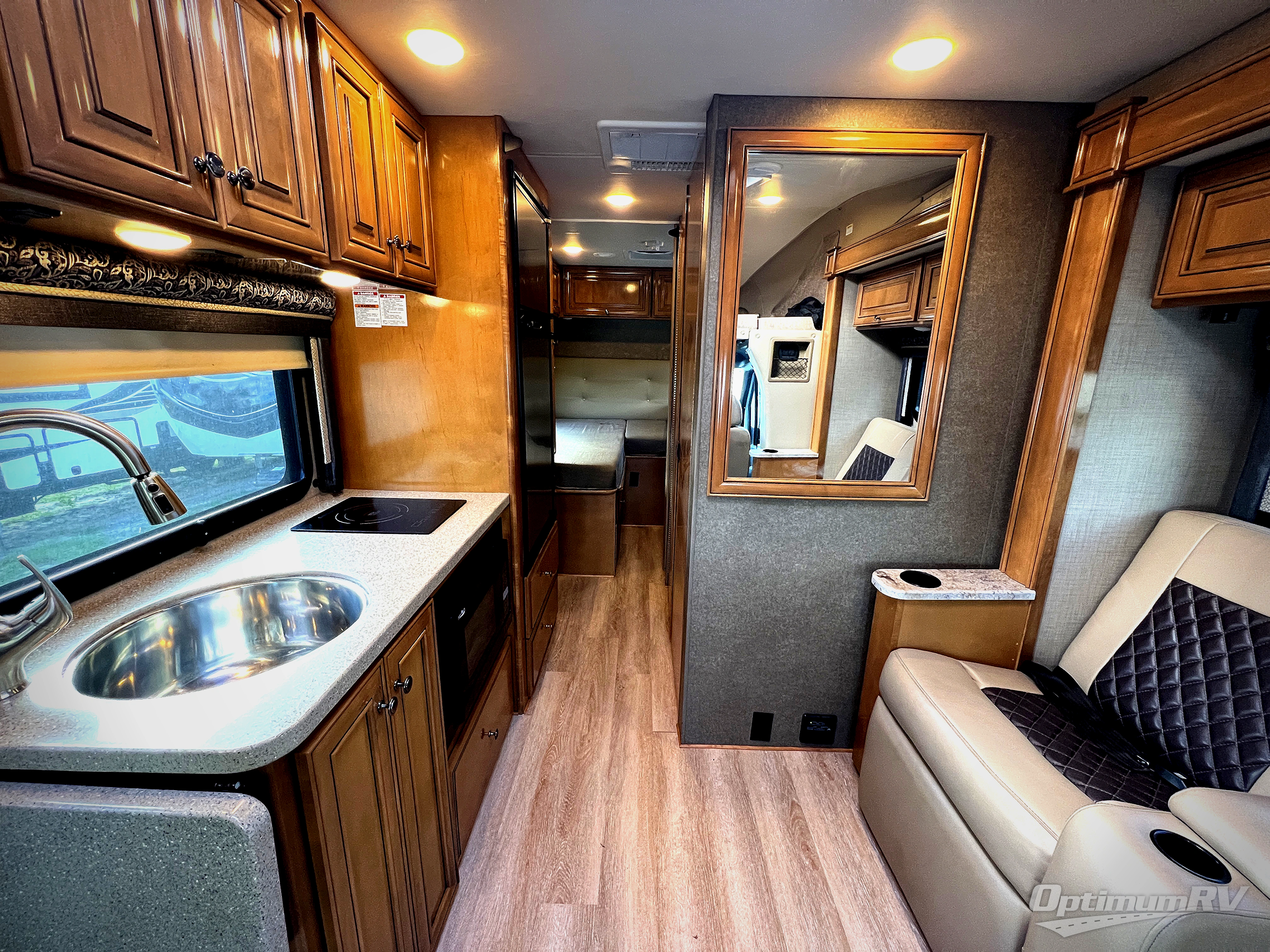 To the left of the entry door there is a kitchenette where you will find a round single bowl sink, an induction single burner, and an overhead cabinet for dishes. Next to the range you can store your perishables in the refrigerator. Along the road side opposite the kitchen area you will find a slide out with a sofa bed and a removable pedestal table, or you can choose the optional 55" reclining theater seating instead.
