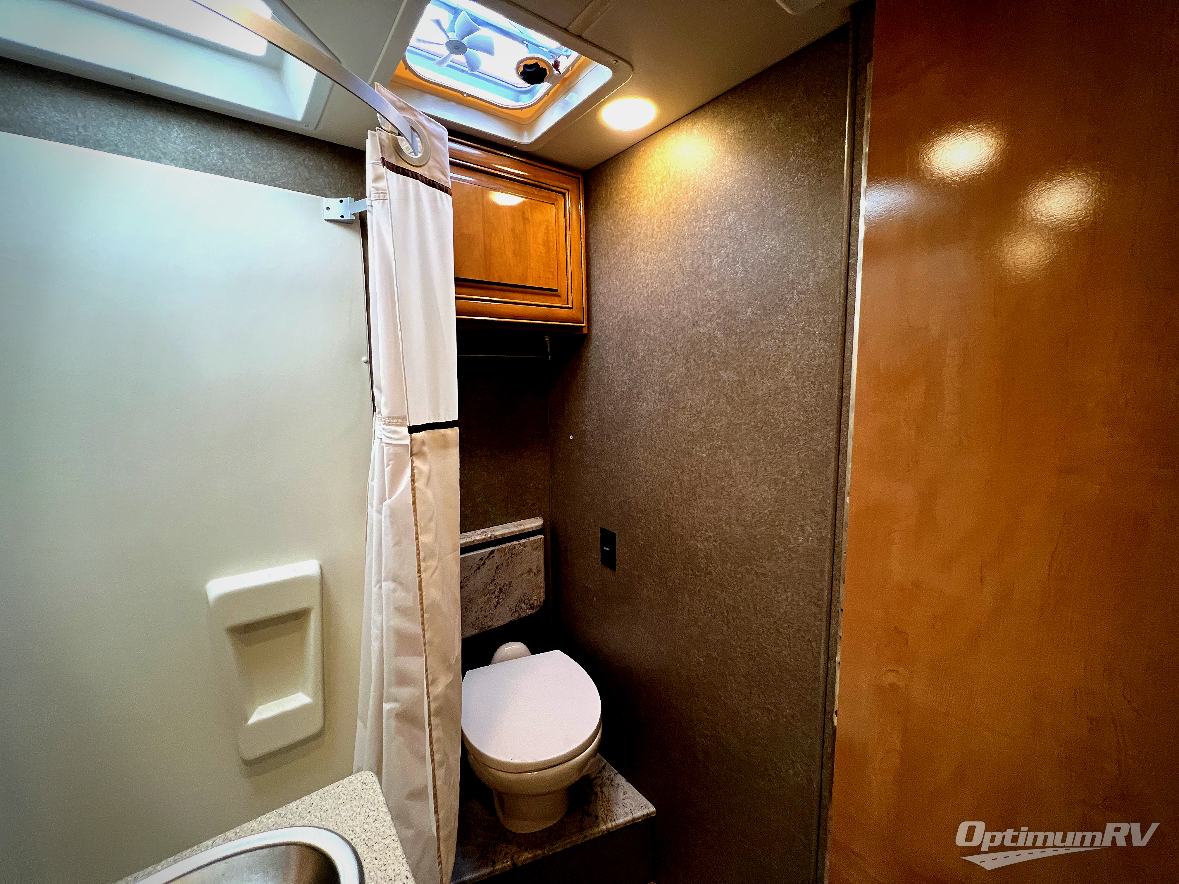 The bath has a toilet, countertop extension, cabinet, 27" x 27" corner shower, sink, and medicine cabinet. This makes spending time on the road quite convenient.