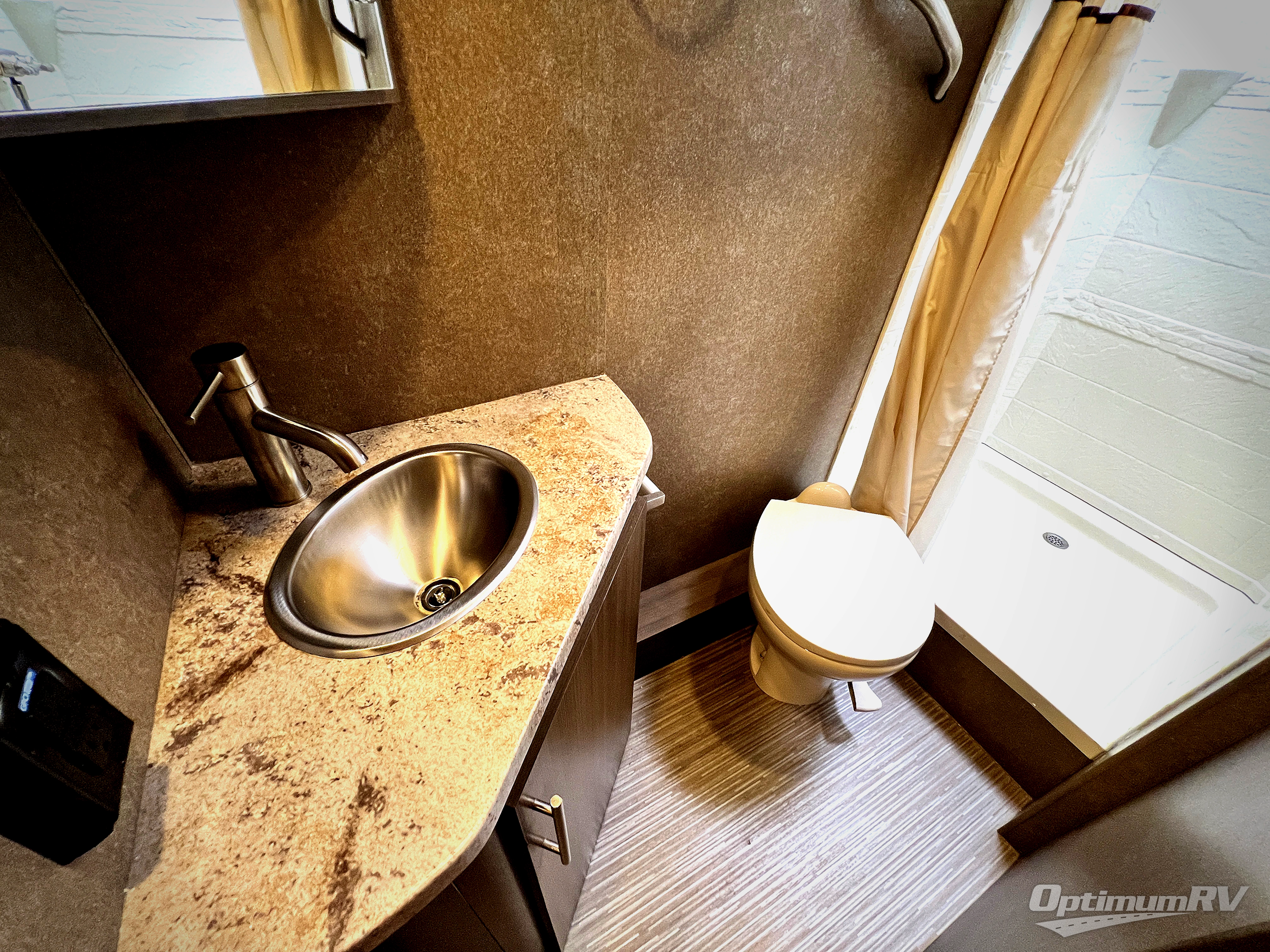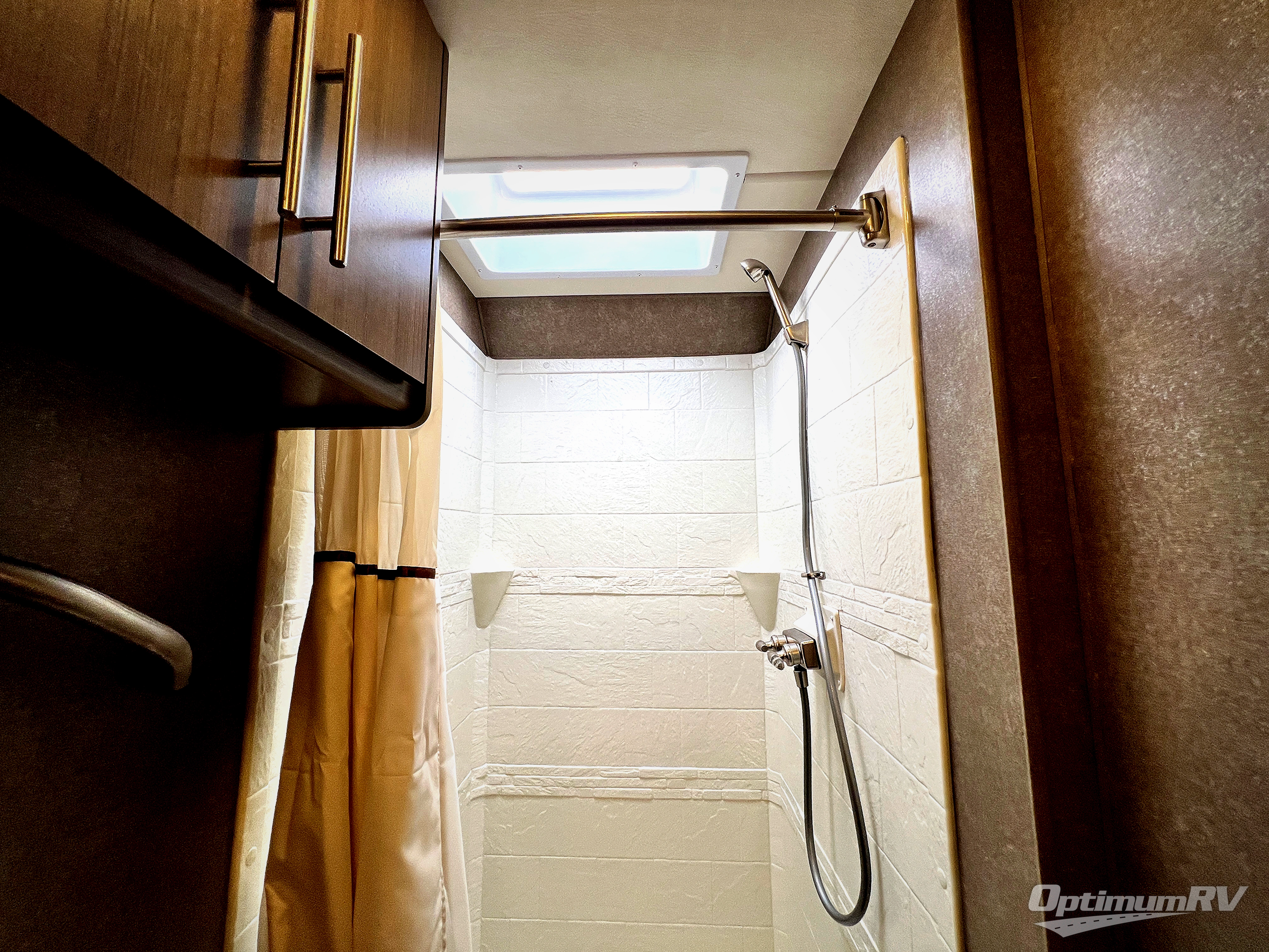 A rear private corner bathroom includes a shower, a toilet, sink, and overhead cabinets. You will love the convenience of your own on board bathroom!