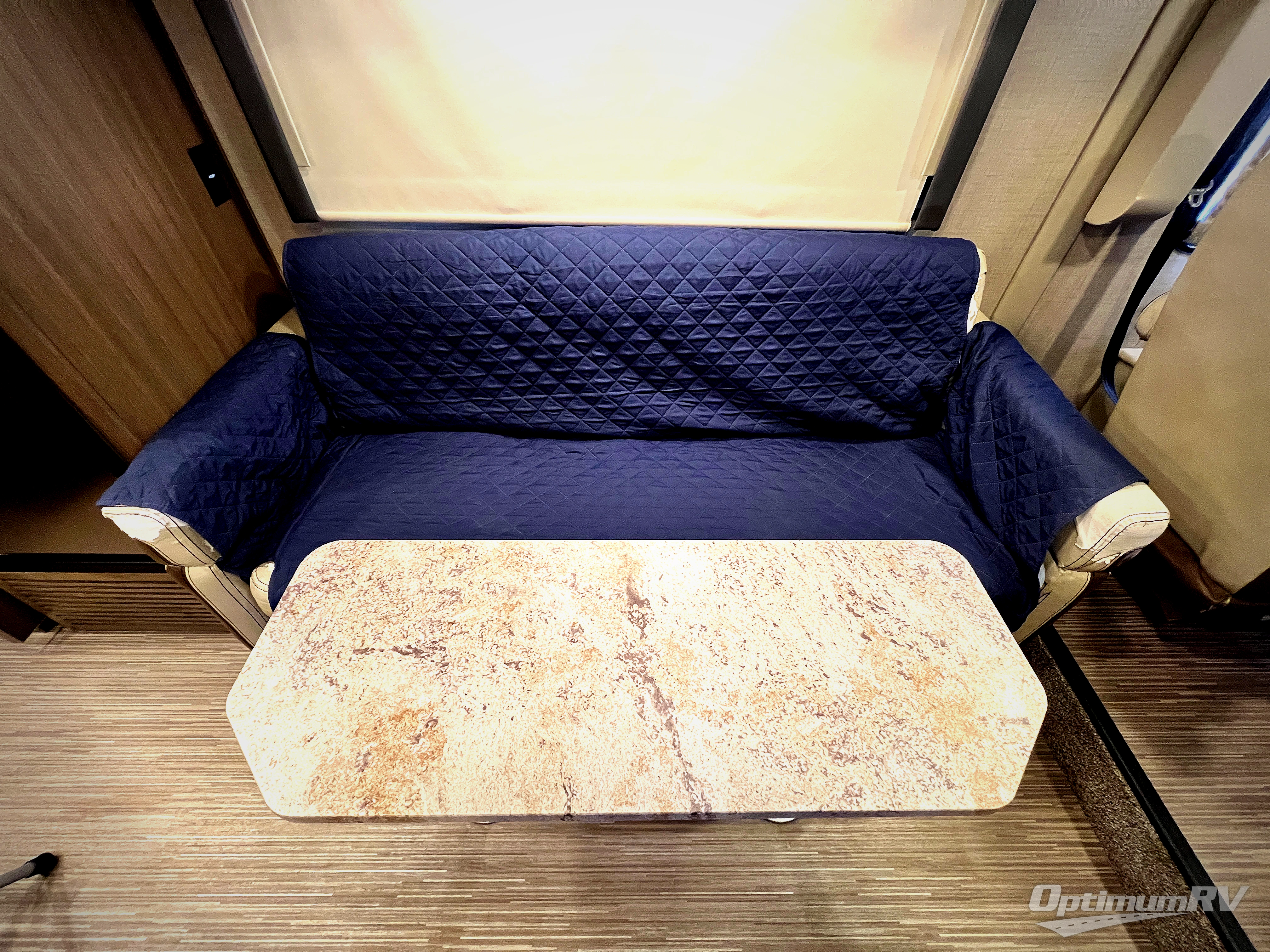 As you enter there is a 32" LED TV above the door. This can easily be viewed from the jack-knife sofa and removable pedestal table that is straight ahead. The sofa features seat belts for safety while traveling, and it easily makes into a bed for an extra guest.