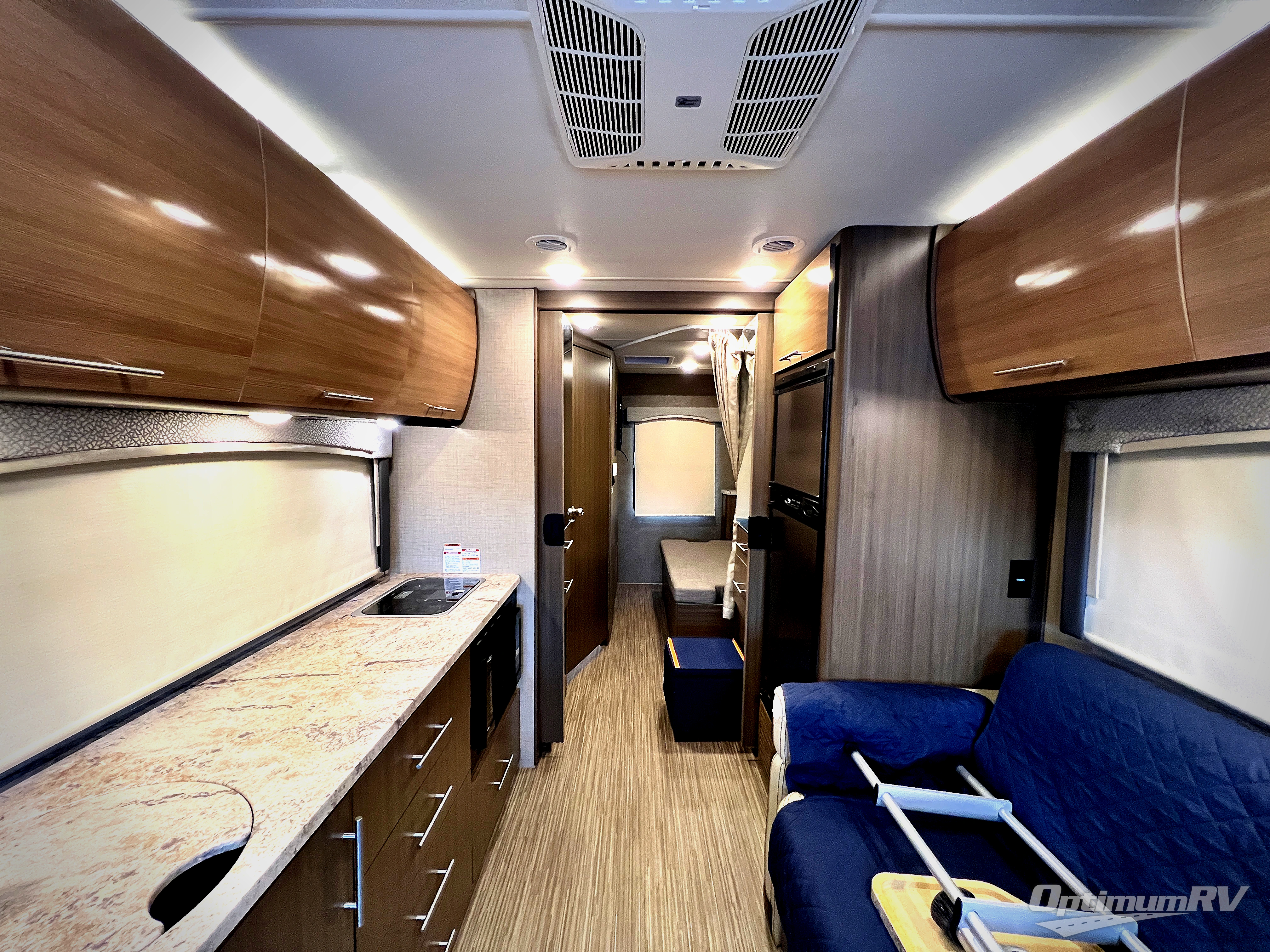 To the left of the entry door find a kitchen where you can conveniently prepare and cook meals. There is a round sink, a counter space along with a flip-up countertop extension, and two burner range with microwave below. There are also plenty of overhead cabinets, lower cupboards and drawers for dishes and things. The refrigerator is on the opposite side beside the sofa.