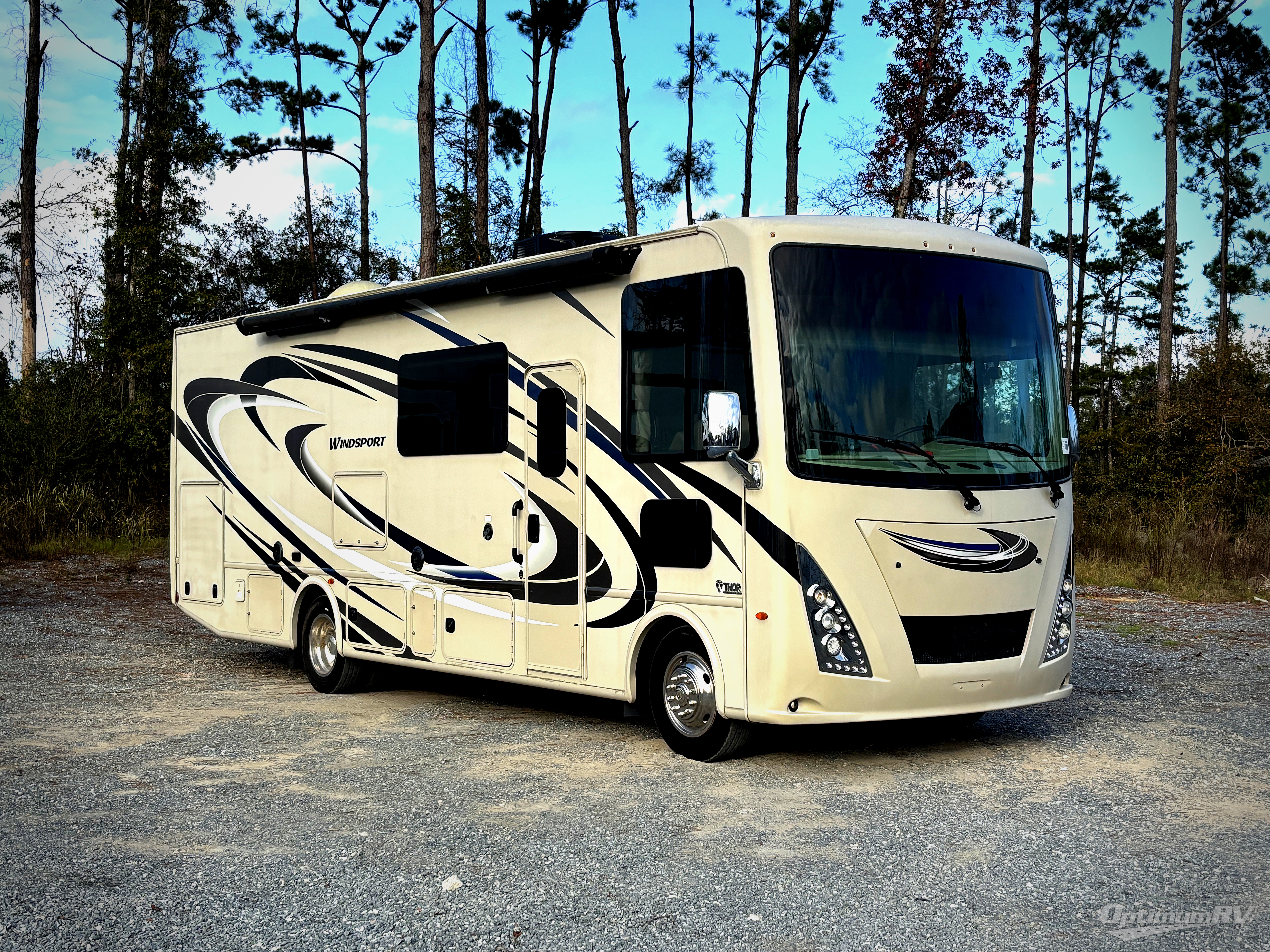 You will find much to love about all Windsport models whether you are out for a long road trip across the country, or a weekend tailgating party close to home. All Windsport models feature Leatherette furniture, solid surface countertops, and raised panel upper cabinet doors with nickel finish hardware and glass inserts on select doors. You will also find added sleeping space in the drop-down cabover bunk that the kids are sure to love. With the swivel and reclining captain's chairs you can easily bring them into a conversation area in the living space once parked, and there is a dash workstation with 110-volt and 12-volt outlets at the passenger side for those who need to do a bit of work while traveling, or for those who just enjoy surfing the internet. On the outside, enjoy Robocast storage compartments, an outdoor shower, plus a 32" LED TV on a manual swivel, and a legless lateral power awning with integrated LED lighting. Make any Windsport class A gas motor home by Thor Motor Coach your new home-away-from-home today!