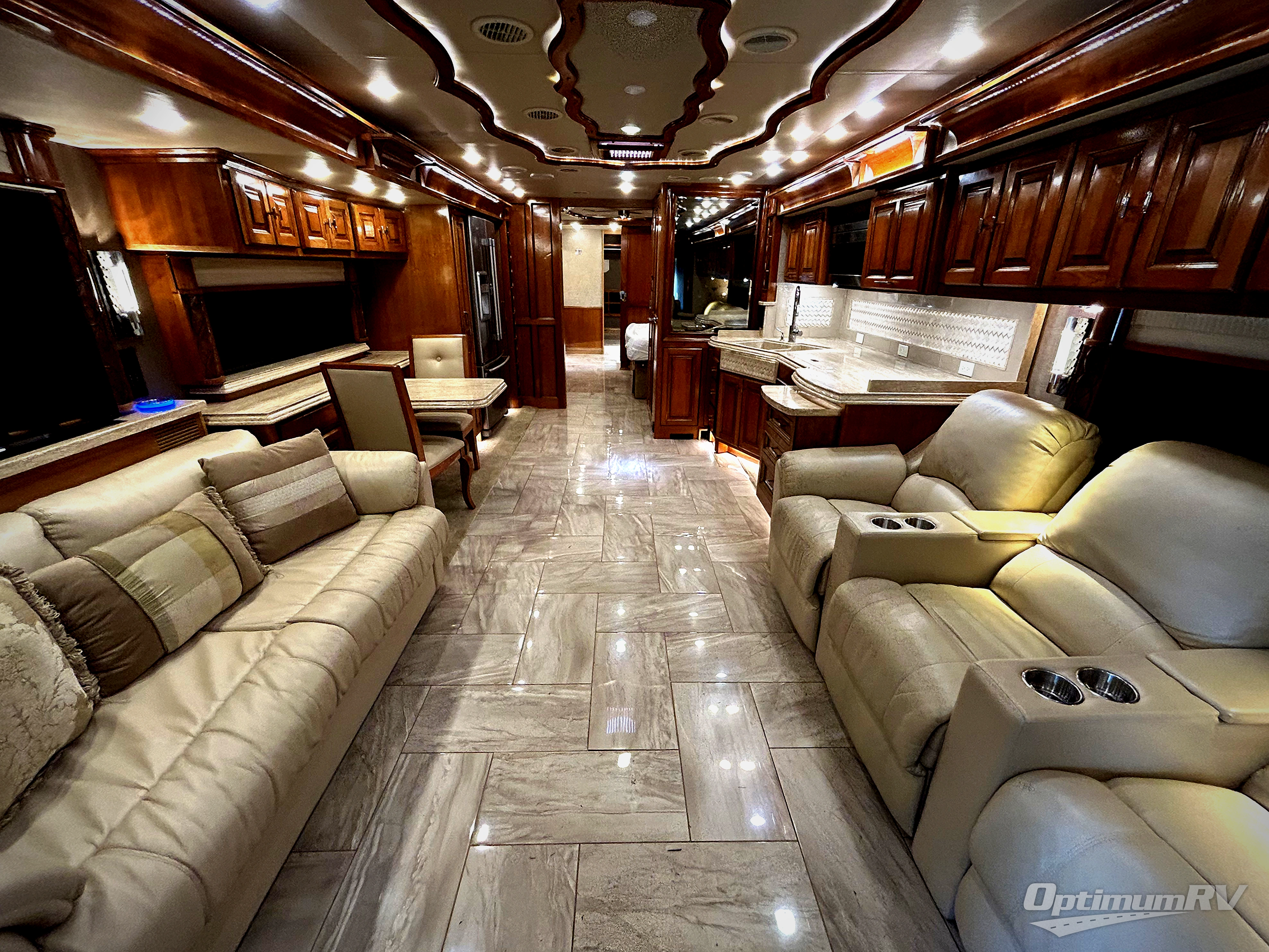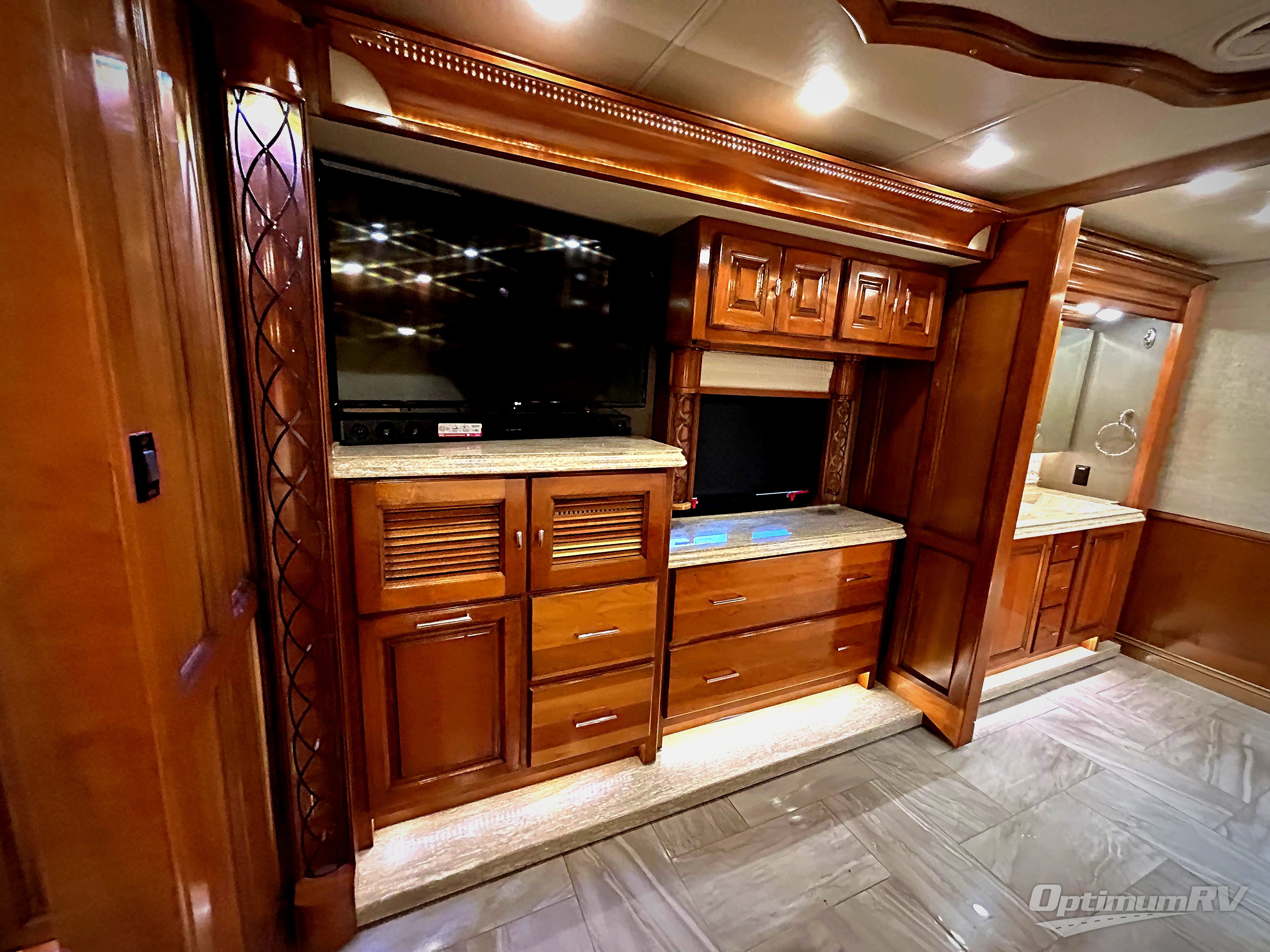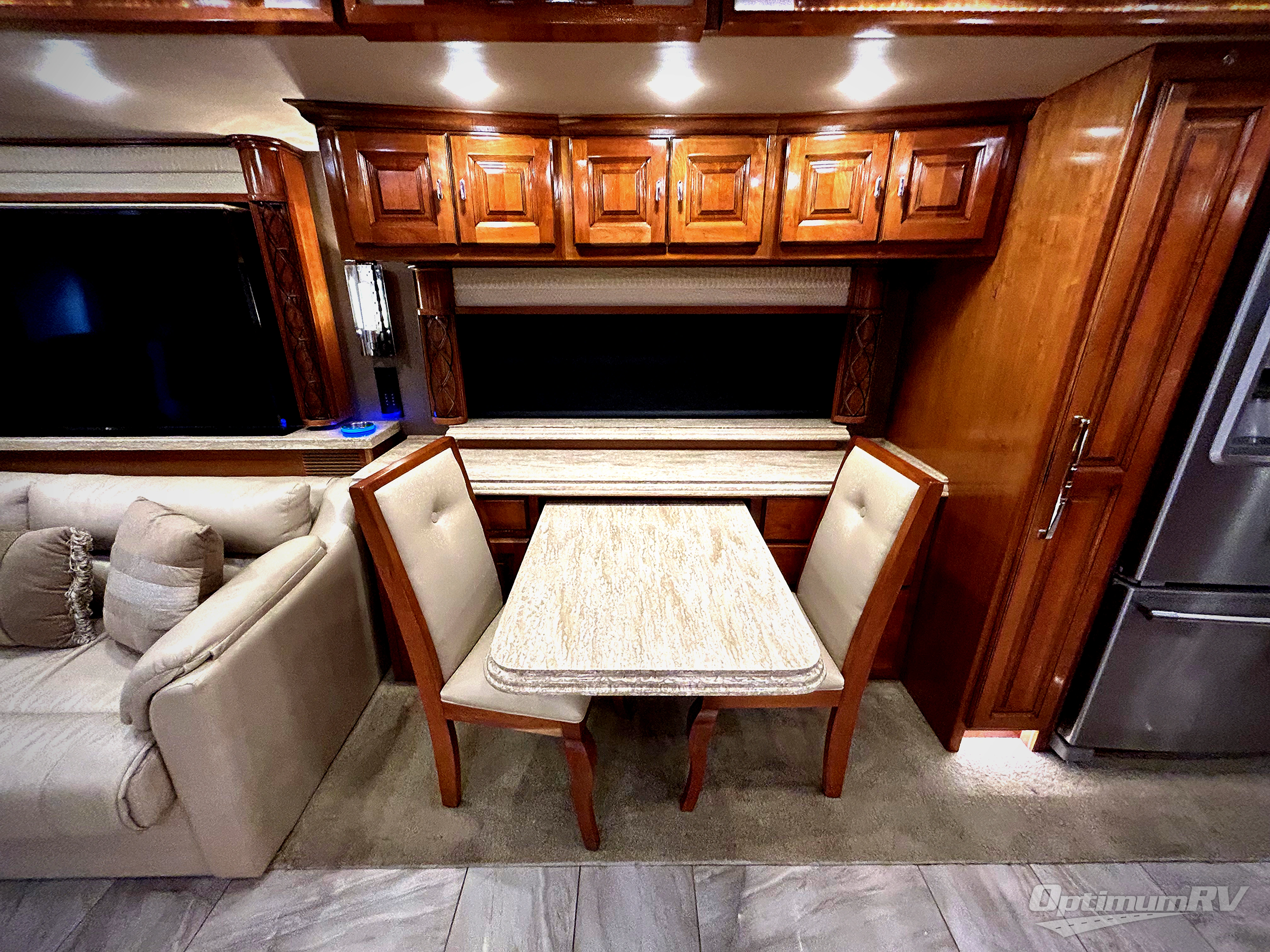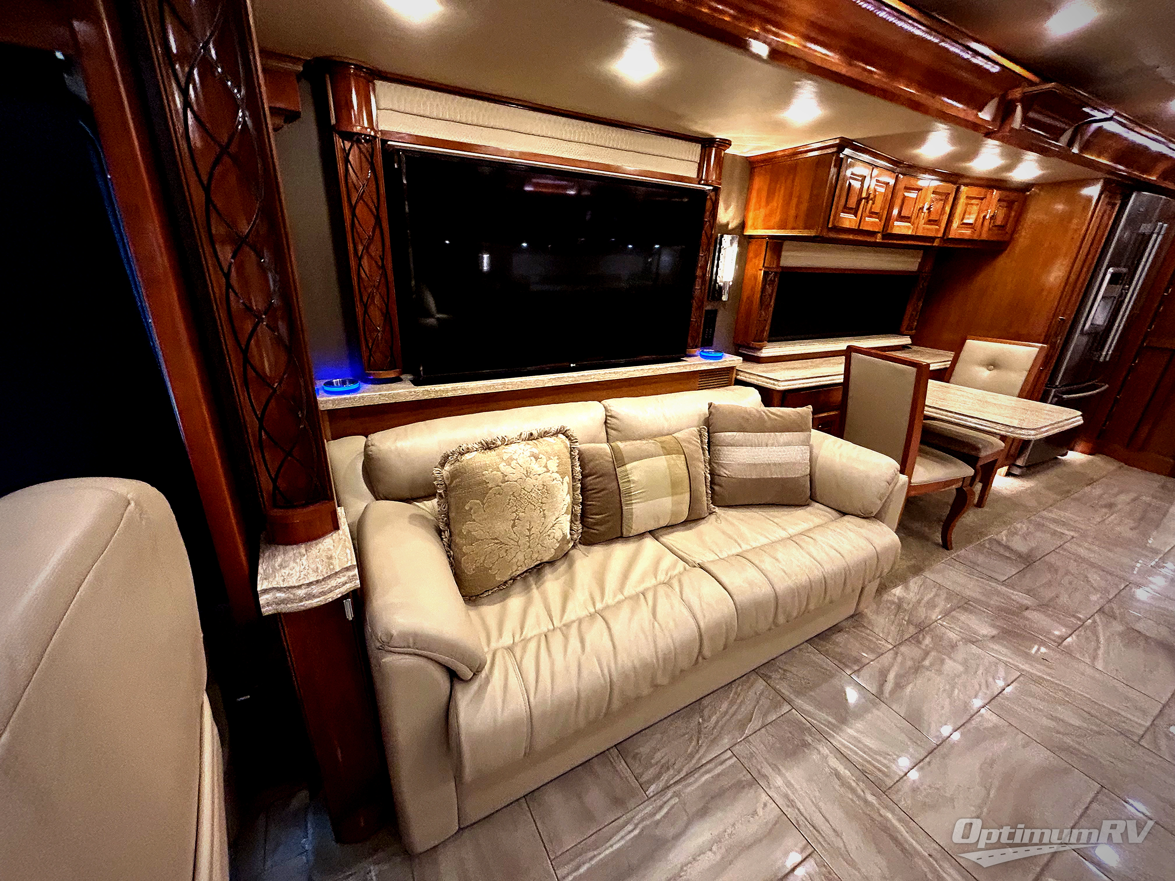 This Tiffin Allegro Bus class A diesel coach model 45 OPP allows you to enjoy your life away from home with the comforts of home. Starting with the 3 interior TVs, the Ultra Leather air coil sofa, and the Ultra Leather DE Sofa with TV cabinet, you can relax, watch the big game, or visit with family and friends just like at home. However, if you need to get some work done the dinette is also a work station with two chairs. The stainless steel residential refrigerator and two pantries allow you plenty of space to take the food items you need to prepare and serve your favorite meals on the polished solid surface countertops. You also have a large full bath with dual sinks including a closet for your wardrobe needs, and a half bath. There is even a wall safe in the bedroom as an added security measure, an exterior TV, plus more! This model is also available with a Freightliner chassis.