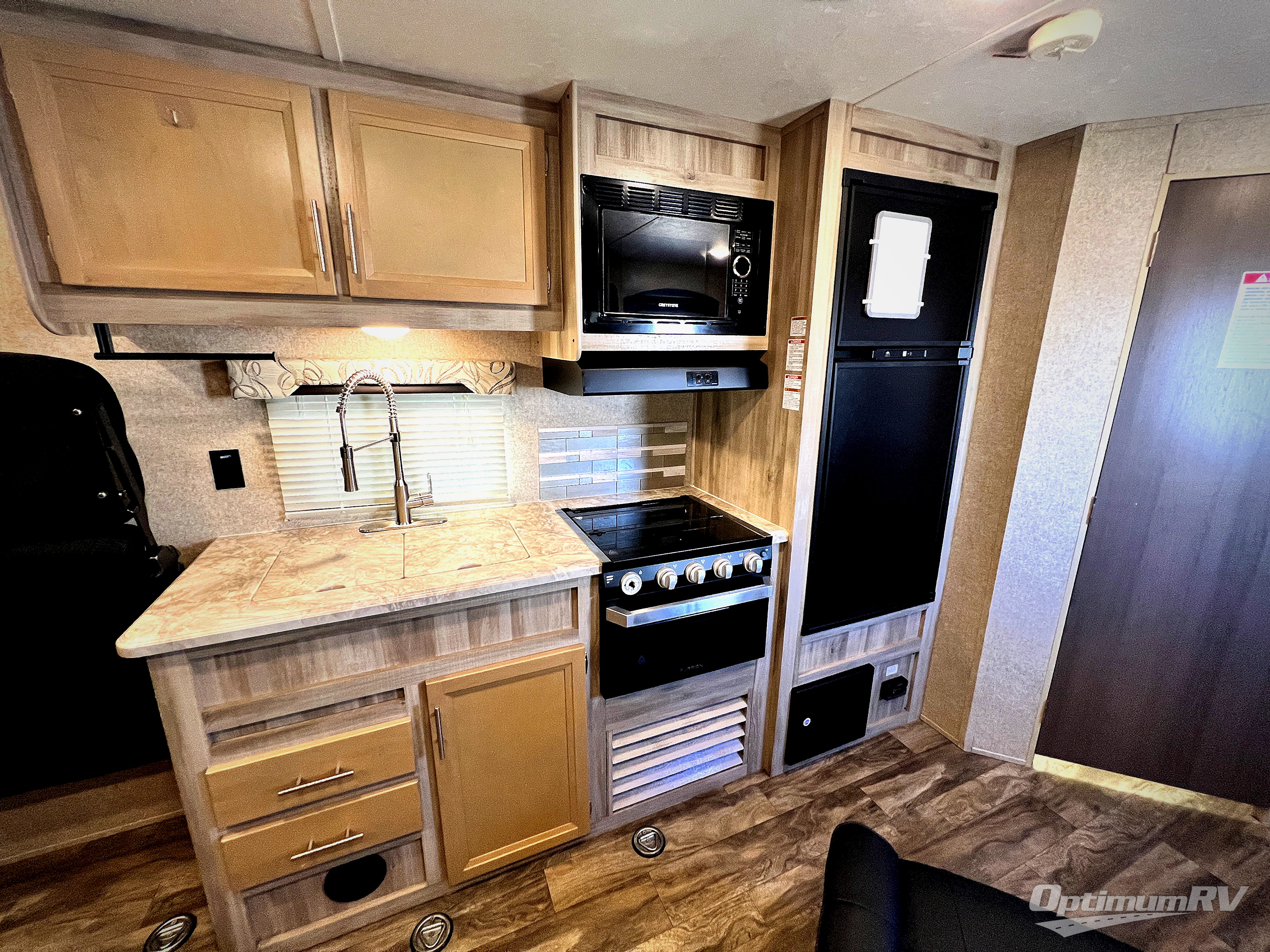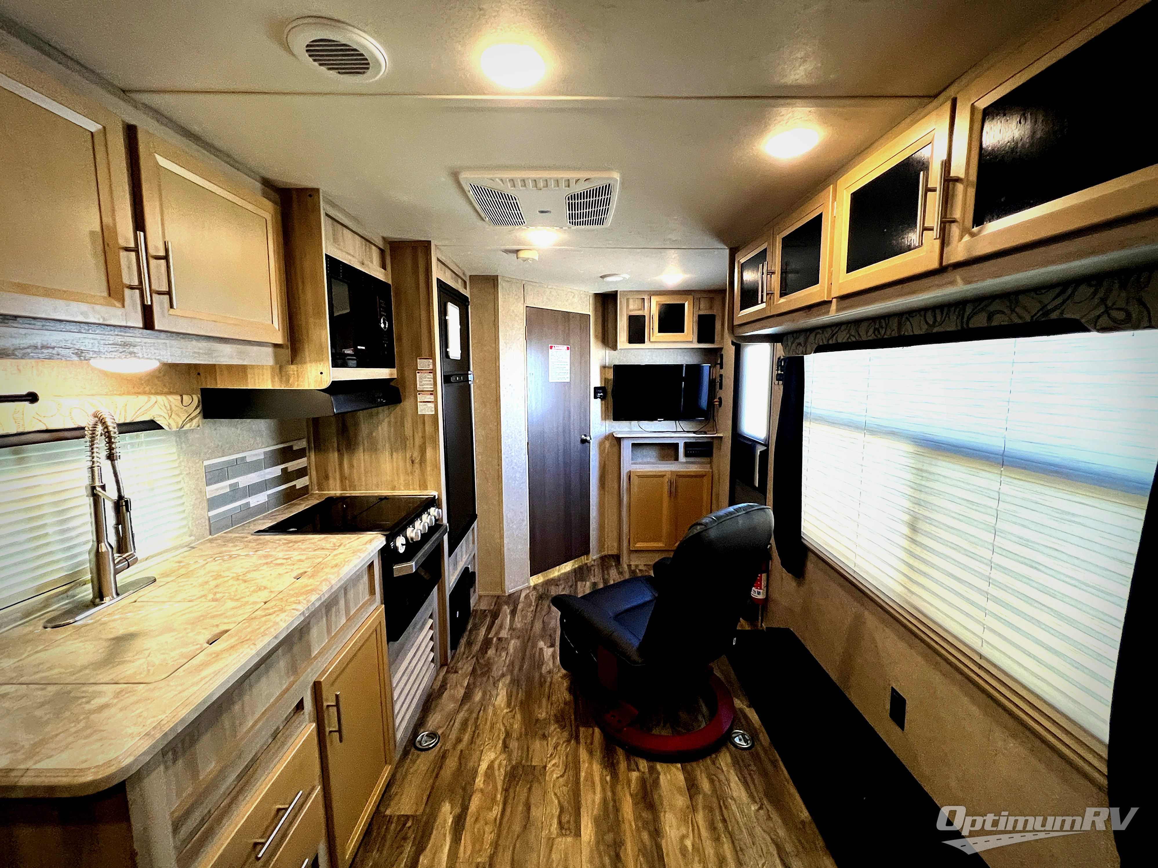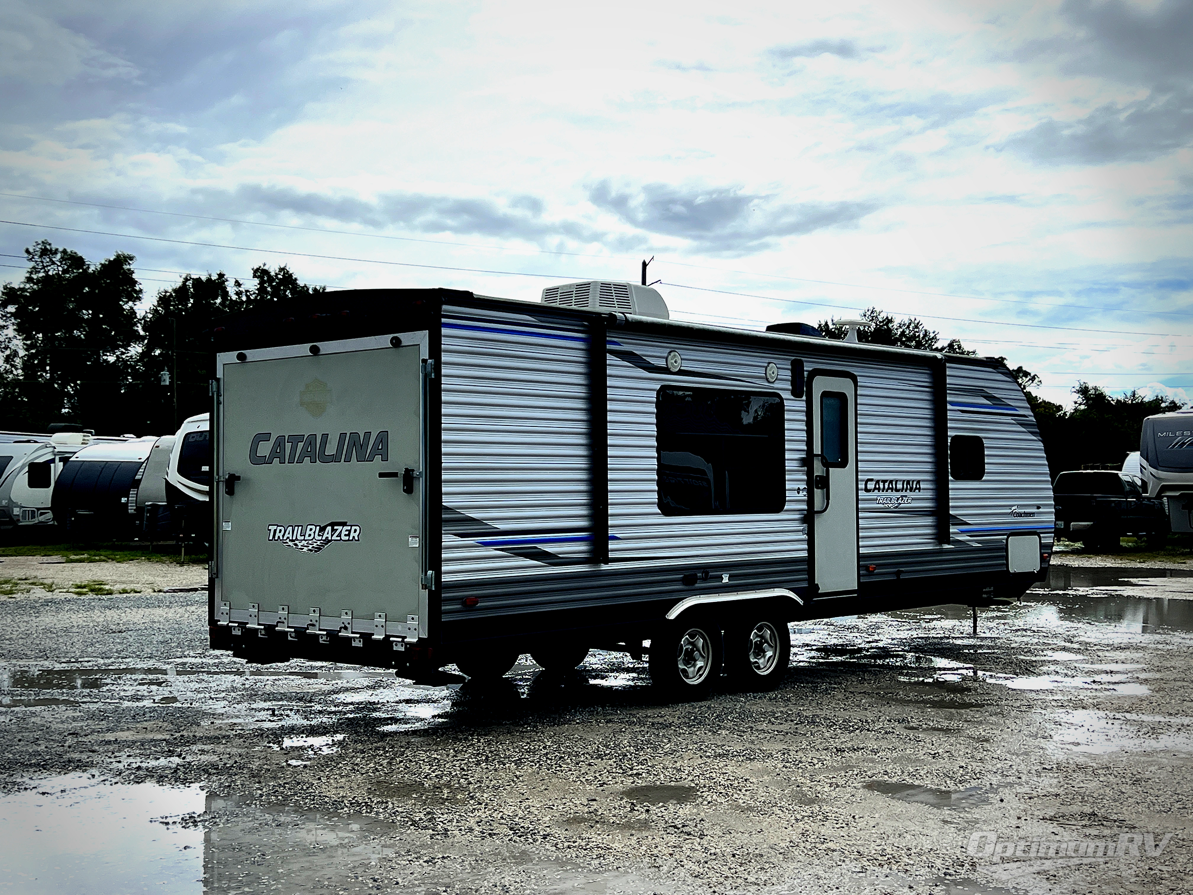 You will love blazing your own trails with the toys you pack inside this Catalina Trail Blazer toy hauler model 26TH. You will love how easy it is to load and unload using the 90" x 74" rear ramp door. If you choose the optional party deck package available then you can create a raised outdoor living space to enjoy when you come in from a fun day of riding or playing. When nightfall arrives, you can fold down the sofa and create added sleeping space for family members or a few added friends. There are also overhead cabinets for your daily dishes and other kitchen items. You will have no trouble whipping up meals and snacks in the fully equipped kitchen to stay fueled for more fun. On the outside, a 15' power awning is great for creating a protected outdoor living space from the wind, sun, and rain. There is also exterior storage in front for all of your outdoor camping gear too!