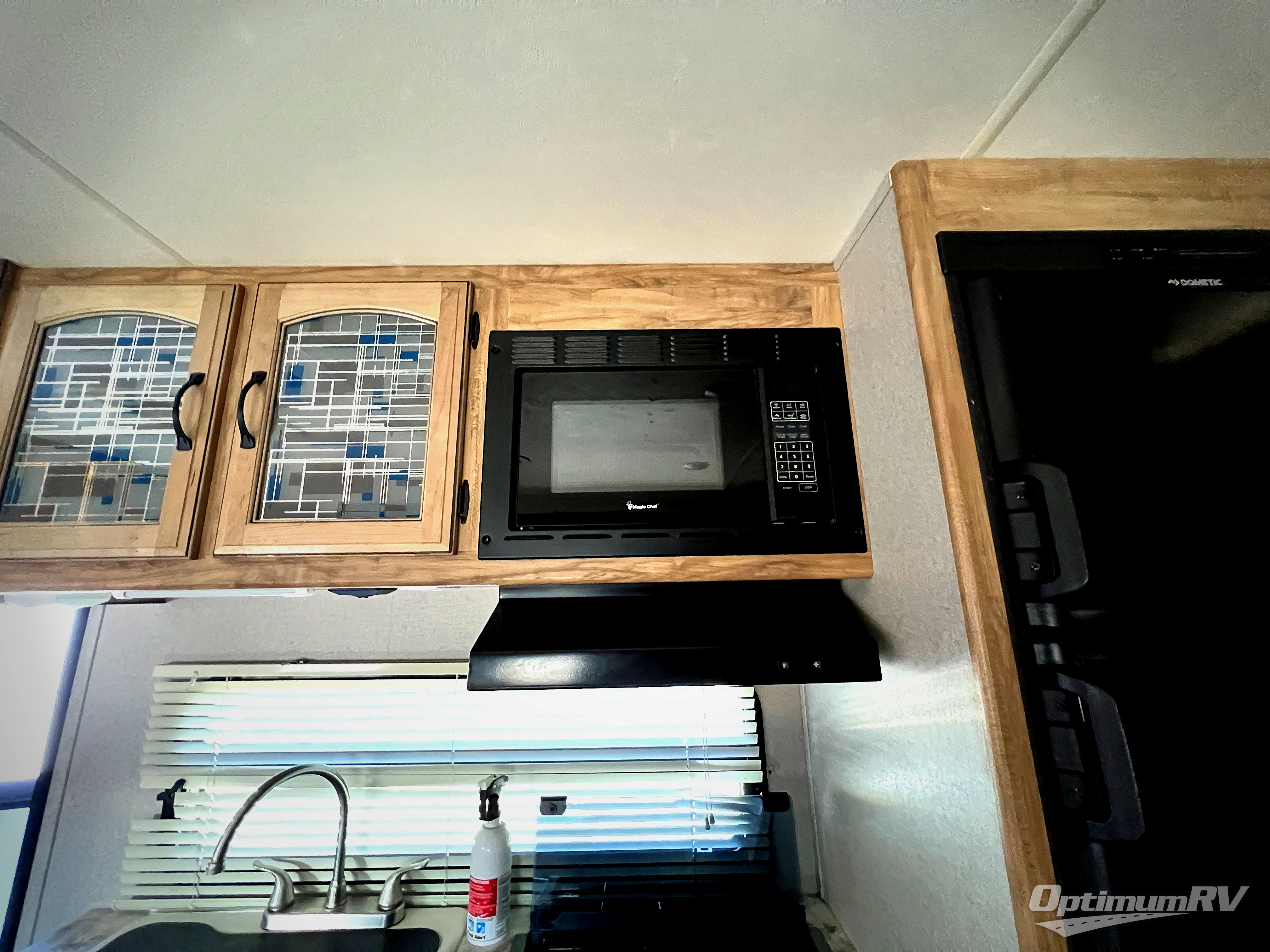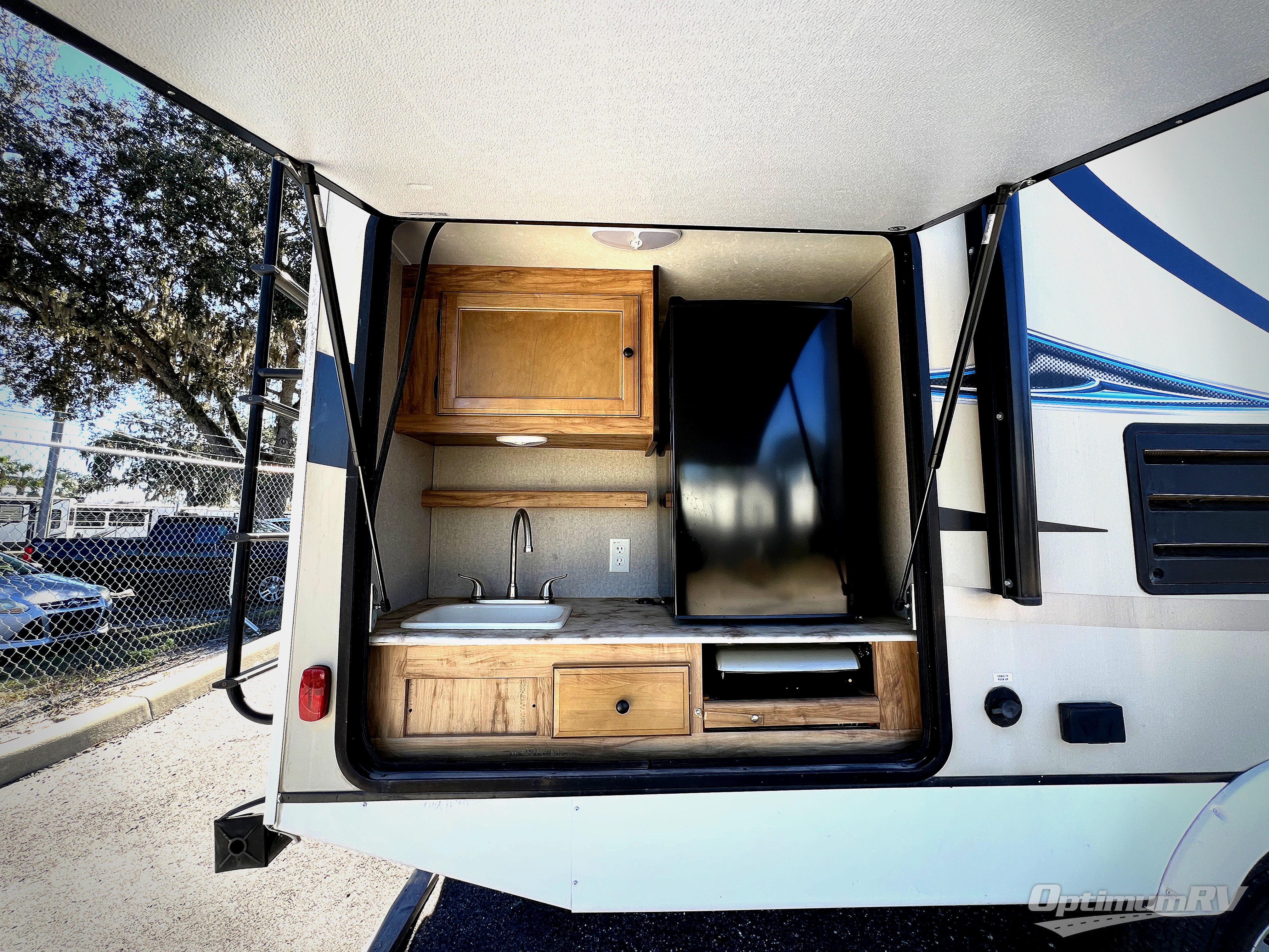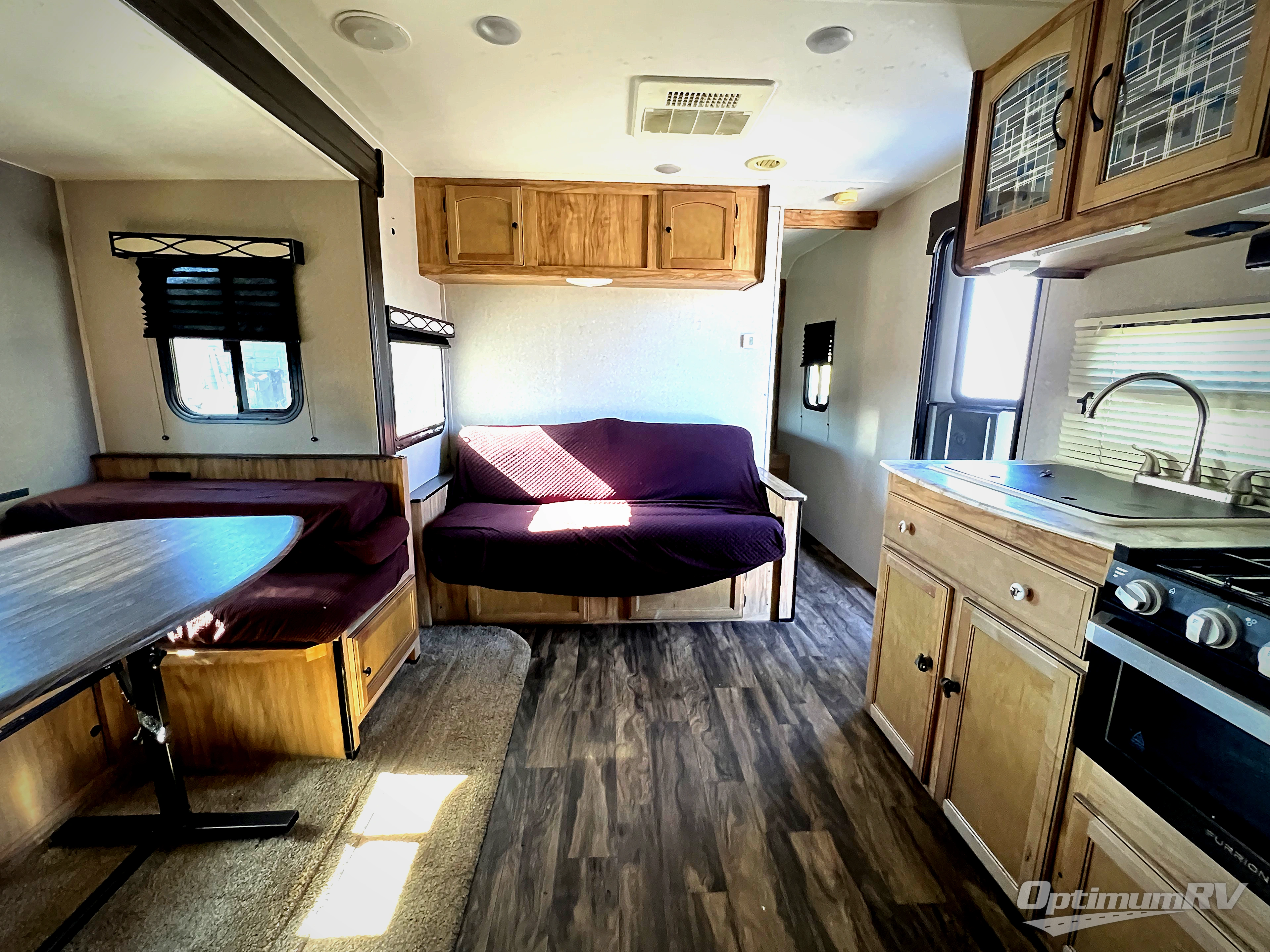 This travel trailer allows you to relax like you do at home with more interior space thanks to the slide out in the living area. You'll appreciate the front private bedroom with a queen bed and wardrobes for your clothes. The kids can make their beds either on the u-shaped dinette or sofa once folded down for the night. This unit features a full rear bath with a radius shower and a linen closet for towels. If you enjoy cooking outdoors, then imagine making dinner for everyone on the camp kitchen!