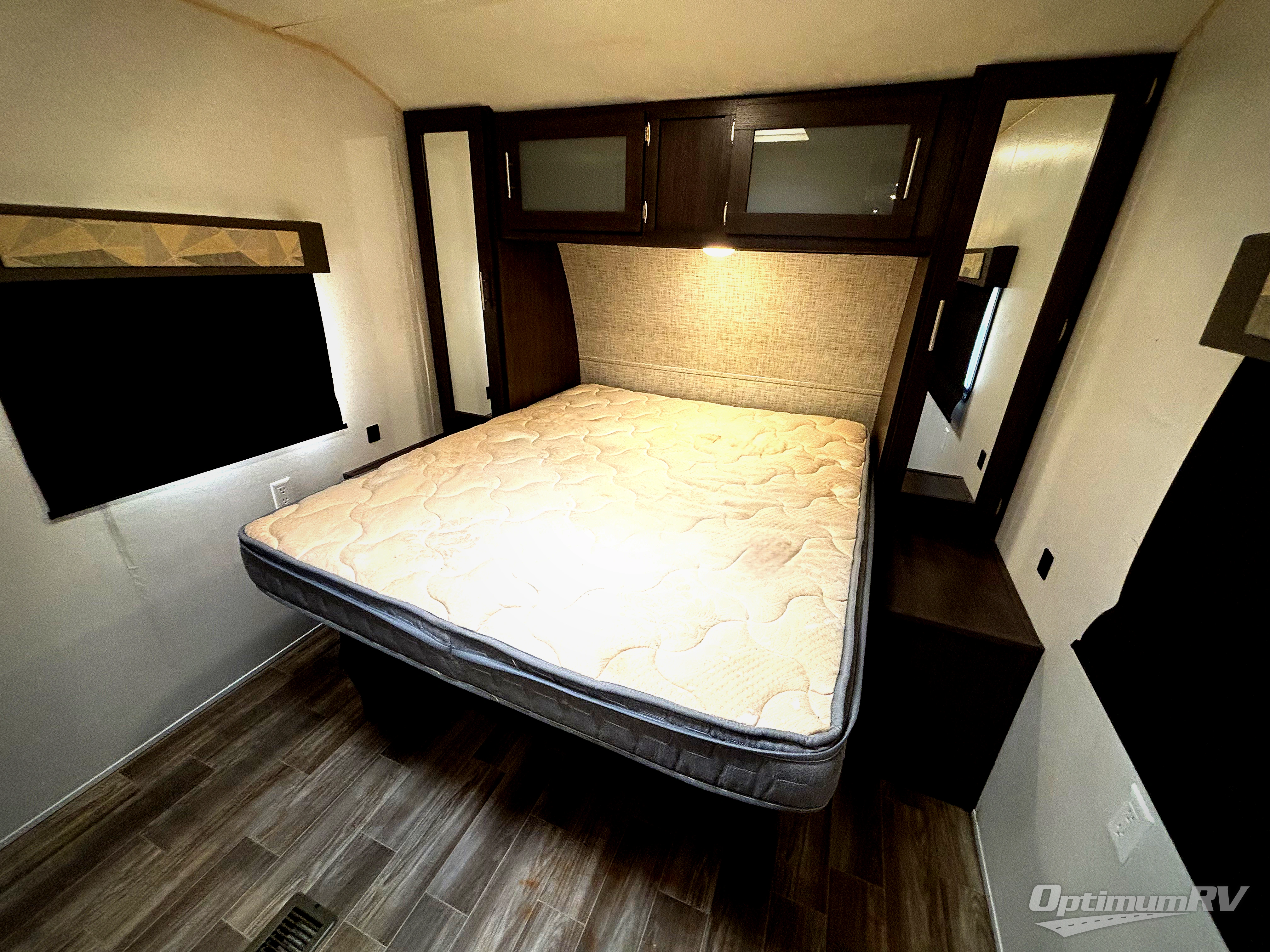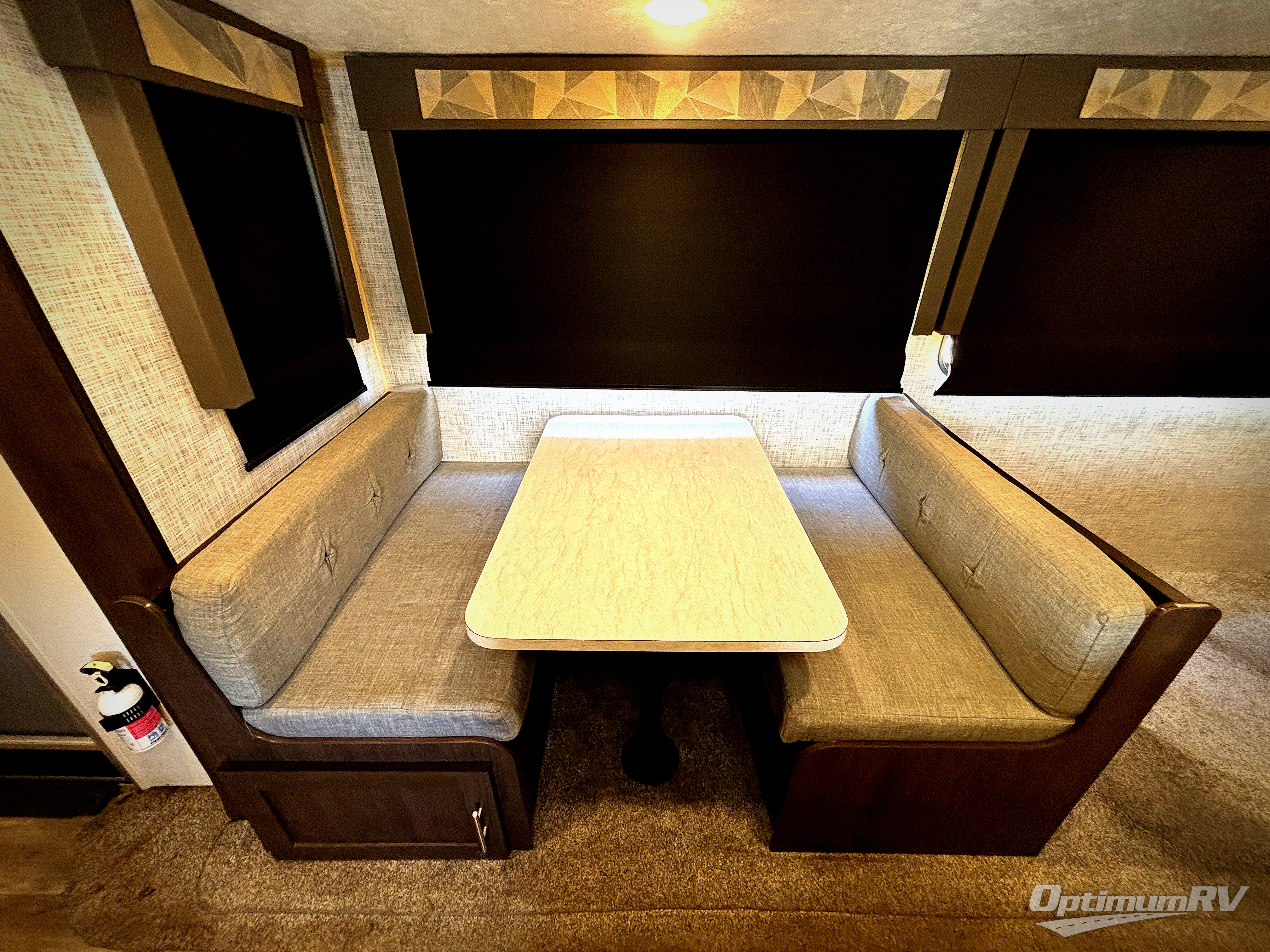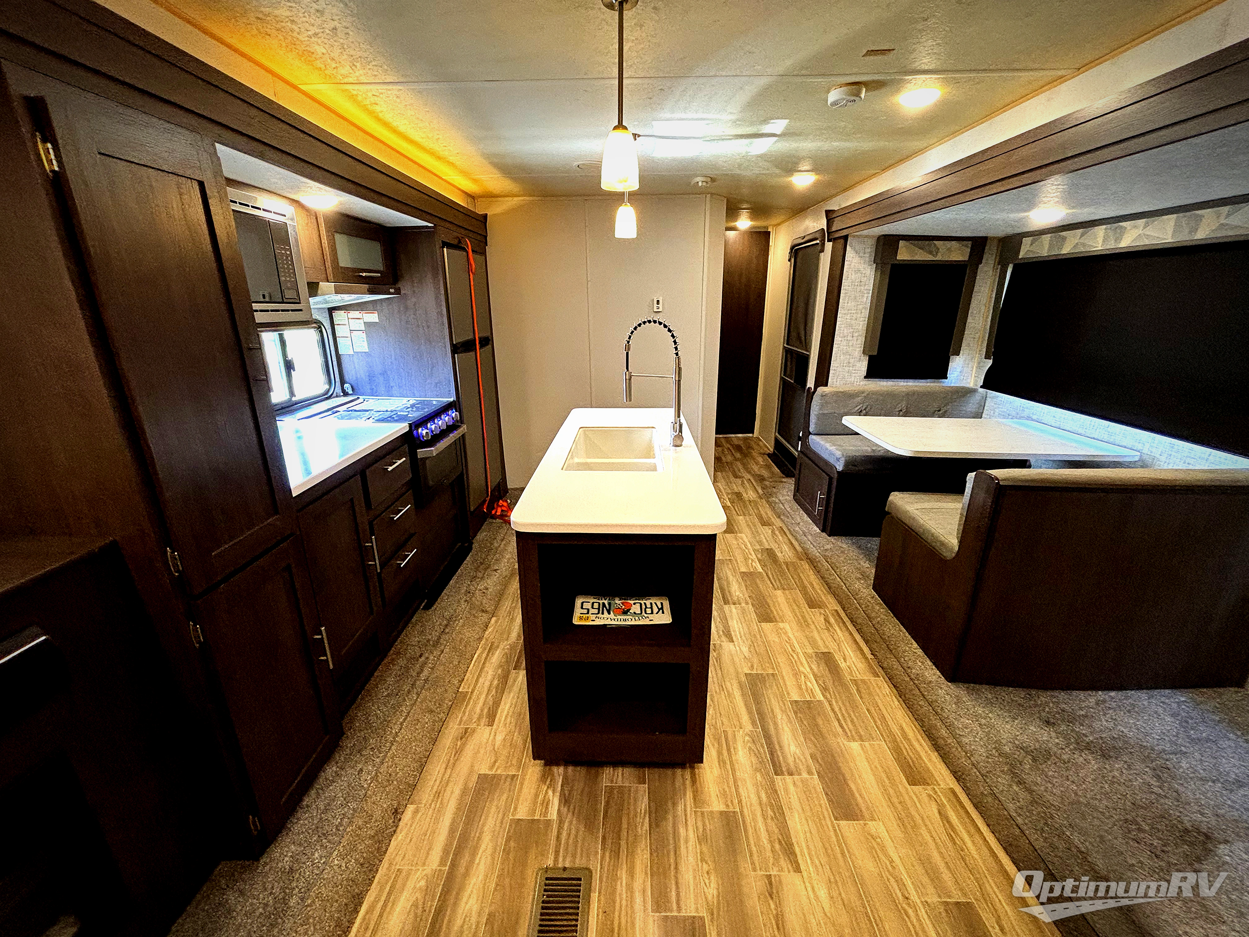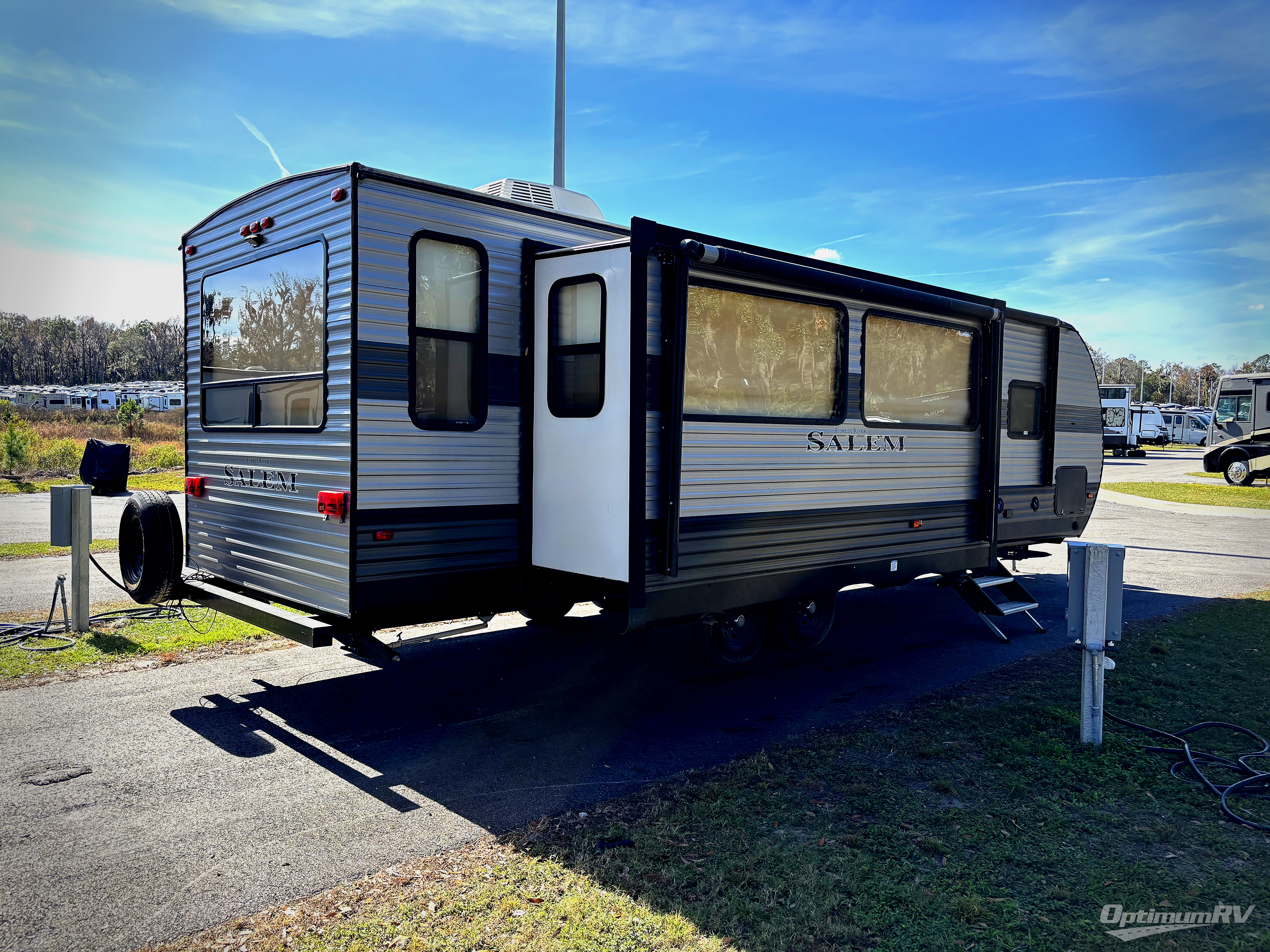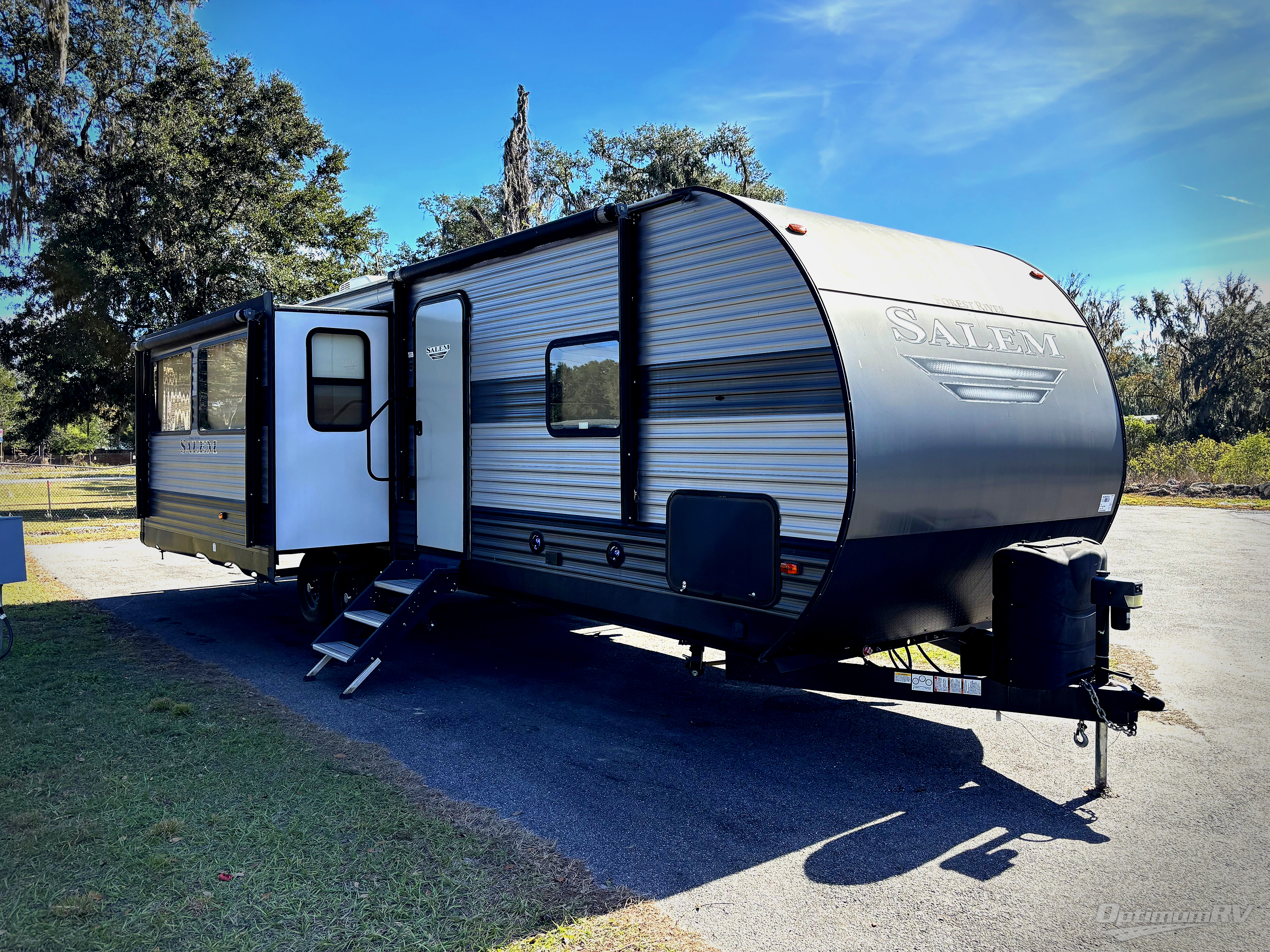 Come start your next camping trip with comfort and ease when you have this Salem travel trailer by Forest River. This model features dual opposing slides which help to open up the floor space. Along the rear wall is a Jiffy sofa, and more seating can be found on the two recliners and booth dinette within the curbside slide out. In the evening you can have a fire in the fireplace while you read a book or plan out tomorrow's adventures. Everything that you need to create your meals can be found in the kitchen, like the three-burner range and residential sink on the island. Outside you will find two awnings that will provide as much shade as possible for you!