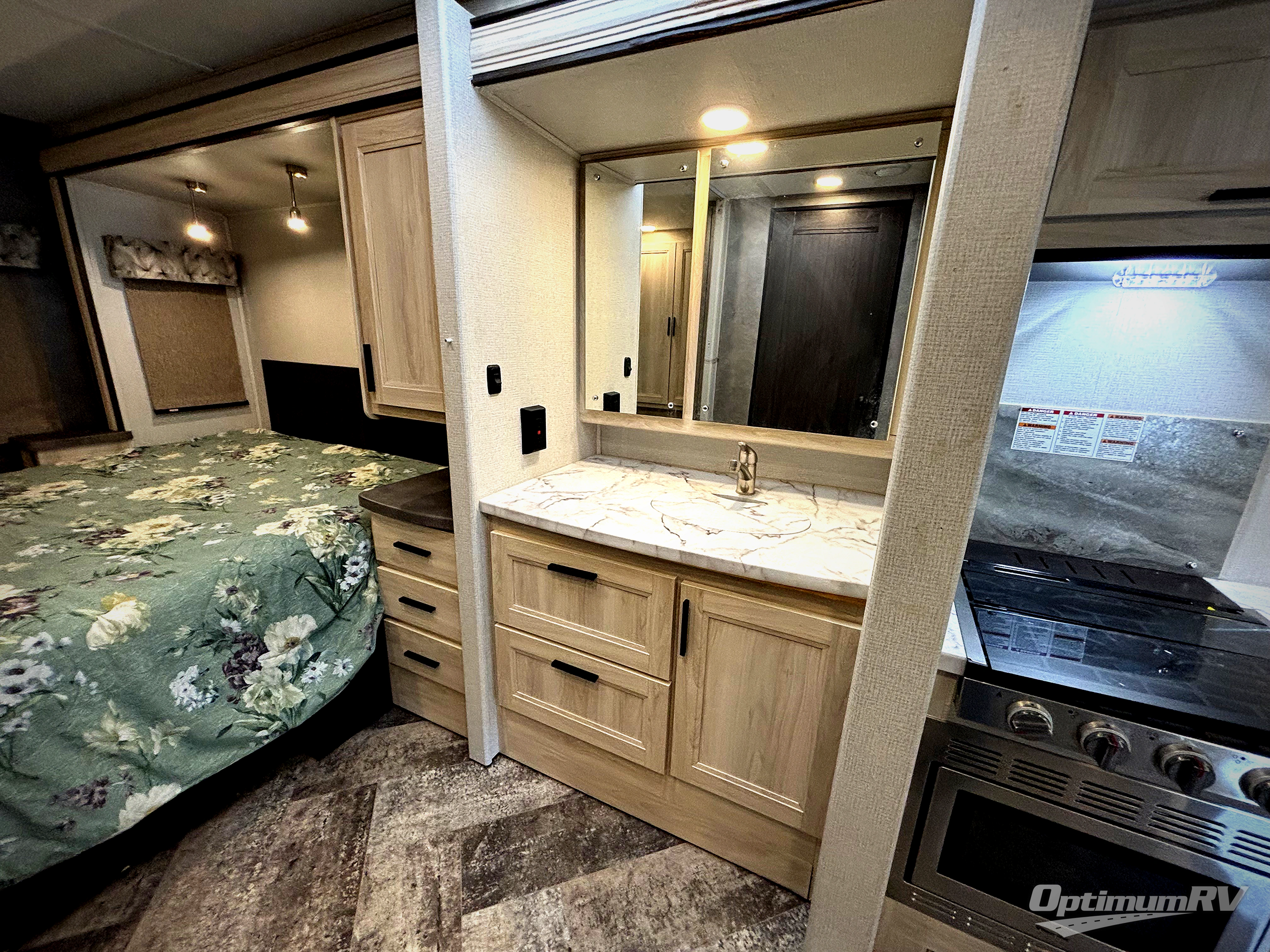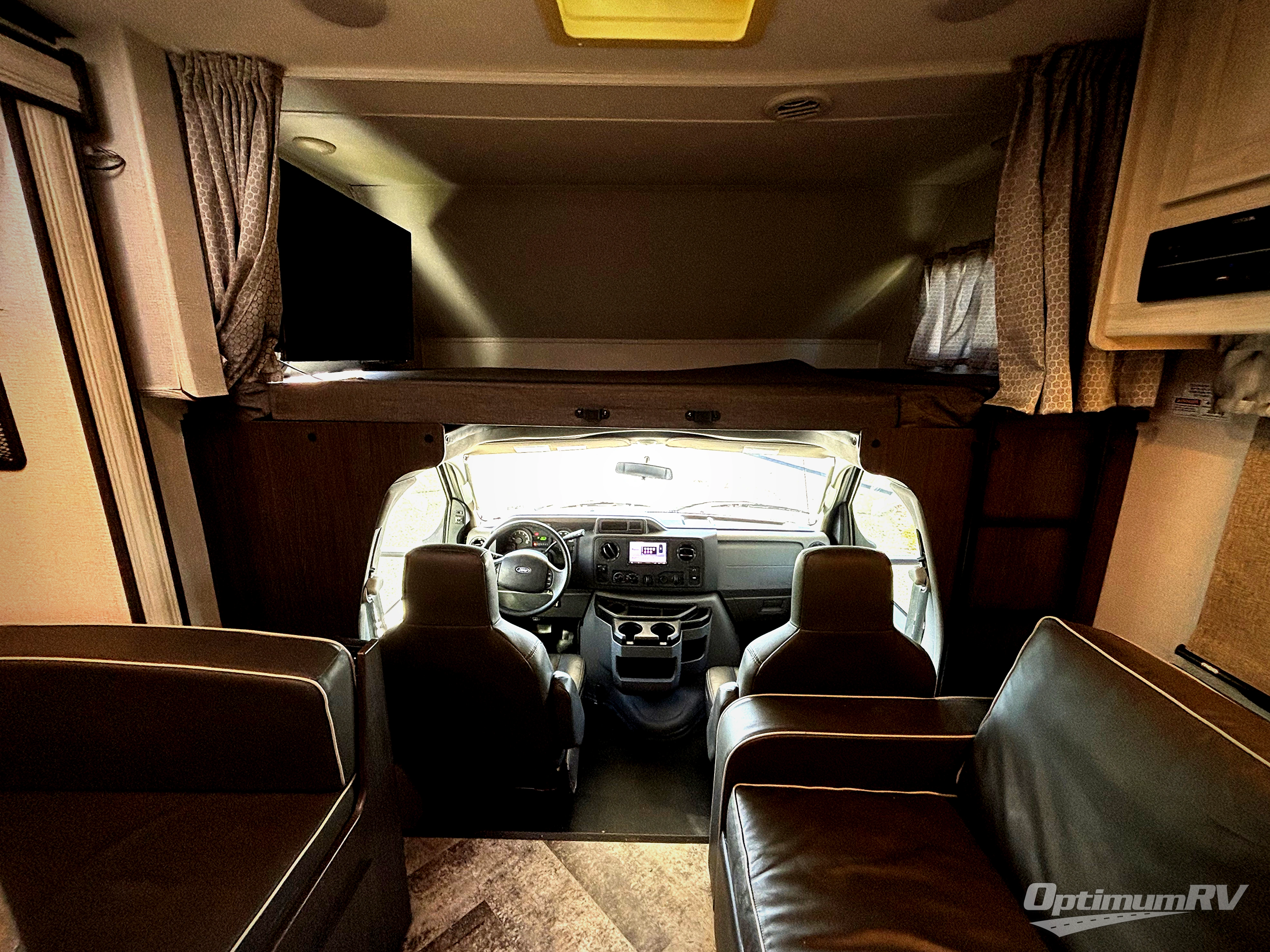 This Ford chassis Sunseeker Class C gas motorhome features a full-wall slide along the driver's side which gives this unit extra interior living space. You have a booth dinette and a sofa opposite one another that both have seatbelts to keep your passengers safe while you travel and can be folded down into sleeping space at night. There is a split bathroom that allows you to use both sides at one time, and the private bedroom has ample storage so that you can bring whatever you would like to.